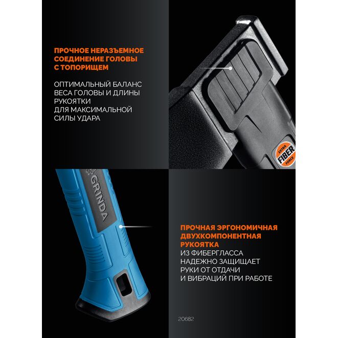 Универсальный топор GRINDA 20682, предназначен для рубки, колки и тески древесины. Легкое и прочное топорище из армированного нейлона. Лезвие закалено до 55 HRC. Работа при температуре до -25 С˚.