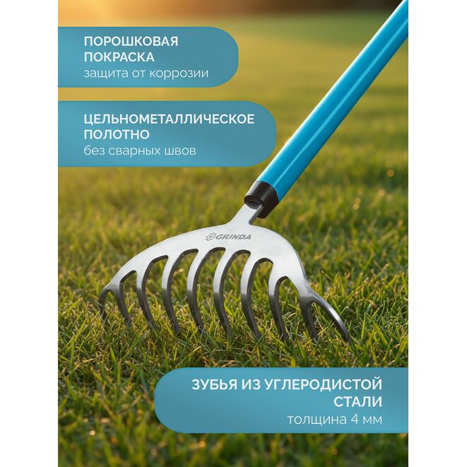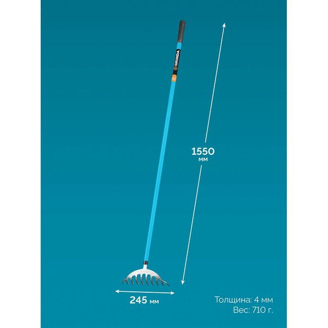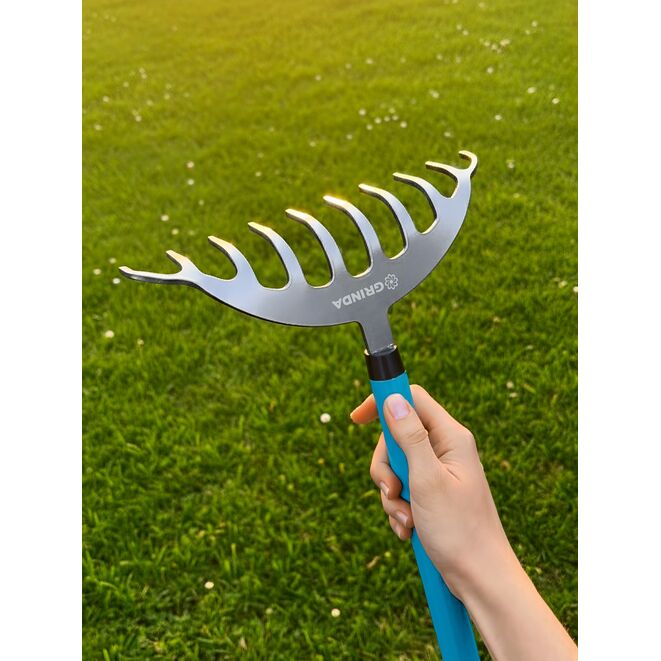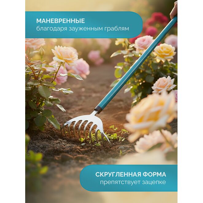 Эти компактные и маневренные грабли — незаменимый помощник для широкого спектра садовых работ: Работа под кустарниками: Бережная уборка прикорневой зоны без повреждения веток и стволов благодаря компактной рабочей части. Тонкая работа в цветниках: Обработка почвы вокруг многолетников, рыхление и выравнивание грунта на клумбах без риска для луковиц и корней. Уборка в труднодоступных местах: Сбор листвы и мусора под густыми кустами, между декоративными камнями и в узких проходах. Обработка приствольных кругов: Бережное рыхление и уборка вокруг деревьев, не задевая кору. Уход за грядками: Рыхление междурядий на овощных грядках и в теплицах, где крупным инструментом не развернуться.Дополнительная информация