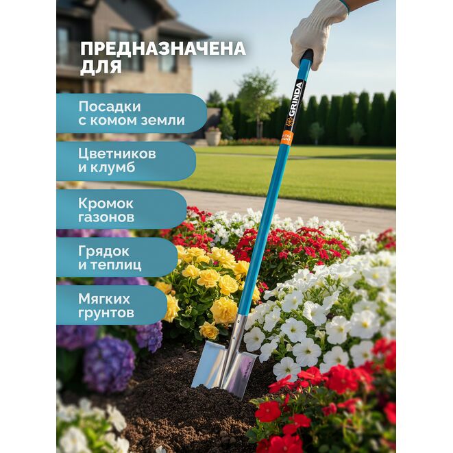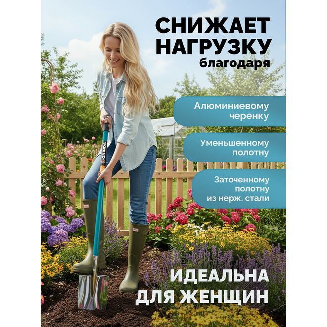 Идеальный инструмент для садовода-огородника, который ценит удобство, эффективность и долговечность. Вес в 2-3 раза легче стандартной стальной лопаты благодаря легкому алюминиевому черенку и уменьшенному полотну из нержавеющей стали Высокая маневренность и удобство в ограниченном пространстве позволяет работать между кустами, на клумбах, в парниках не повреждая соседние растения. Заточенная кромка с минимальным усилием врезается в землю, не рвет и не мнет корни растений, а аккуратно их перерезает. Это особенно важно при работе с дерном и пересадке растений. Гладкая поверхность полотна из нержавеющей стали снижает вероятность налипания грунта. Специальная эргономичная пластиковая рукояткаидеально лежит в руке, не скользит и поглощает вибрации. Меньший объем грунта: За один раз вы поднимаете меньше земли, что значительно снижает нагрузку на спину и суставы, особенно при длительной работе. Идеально подходит для женщин и людей старшего возраста. Основное назначение: Применяется для выпоПрименение