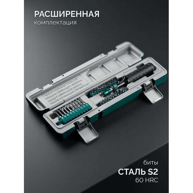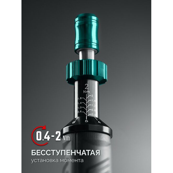 - -Бесступенчатая установка момента затяжки вращением кольца на торце рукоятки,