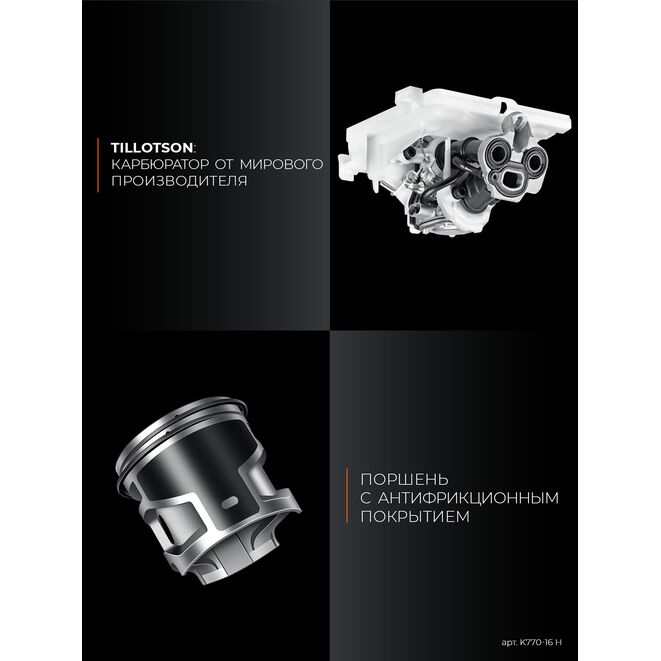- Карбюратор TILLOTSON оснащен компенсационным клапаном, обеспечивающим высокую мощность даже при забитом воздушном фильтре