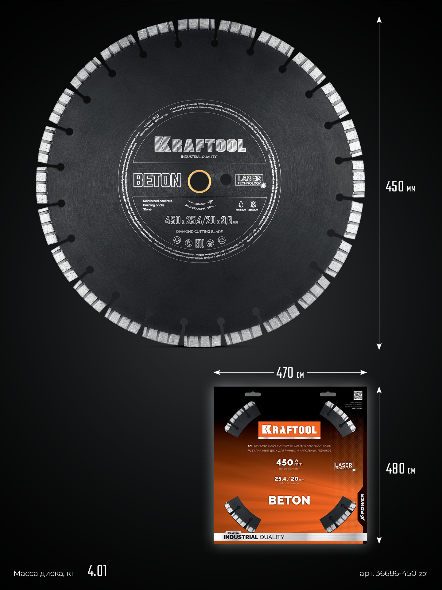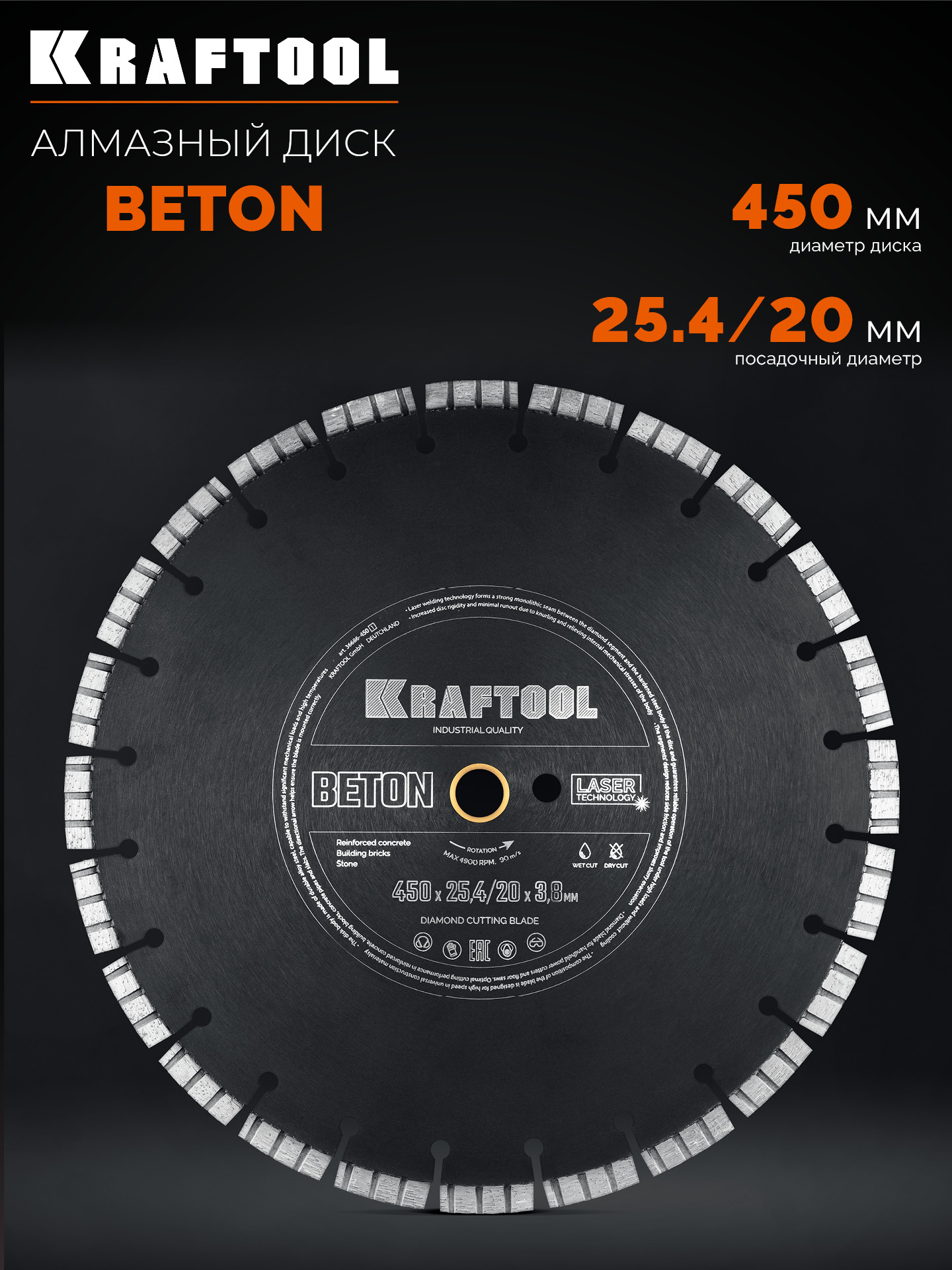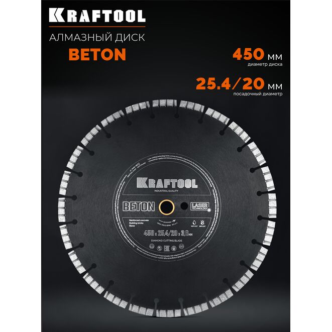 KRAFTOOL BETON 450 мм (25.4/20 мм, 12х3.8 мм), алмазный диск (36686-450_z01)