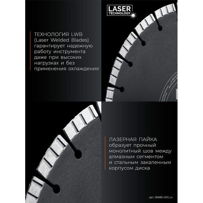 Алмазный диск отрезной KRAFTOOL 36686-500_z01, предназначен для резки армированного бетона, кирпича, тротуарной плитки, камня. Технология LWB (Laser Welded Blades) гарантирует надежную работу инструмента даже при высоких нагрузках и без применения охлаждения. Луч лазера проваривает стык между алмазным сегментом и стальным закаленным корпусом, образуя прочный монолитный шов. Оригинальная турбо-сегментная форма режущей кромки позволяет быстро и эффективно осуществлять необходимые резы в обрабатываемом материале. Оптимально подобранные компоненты металлической связки с высотой сегмента в 10 мм гарантируют продолжительный рабочий ресурс диска при работе даже с самыми сложными в обработке материалами.Характеристики Kraftool 36686-500_z01: