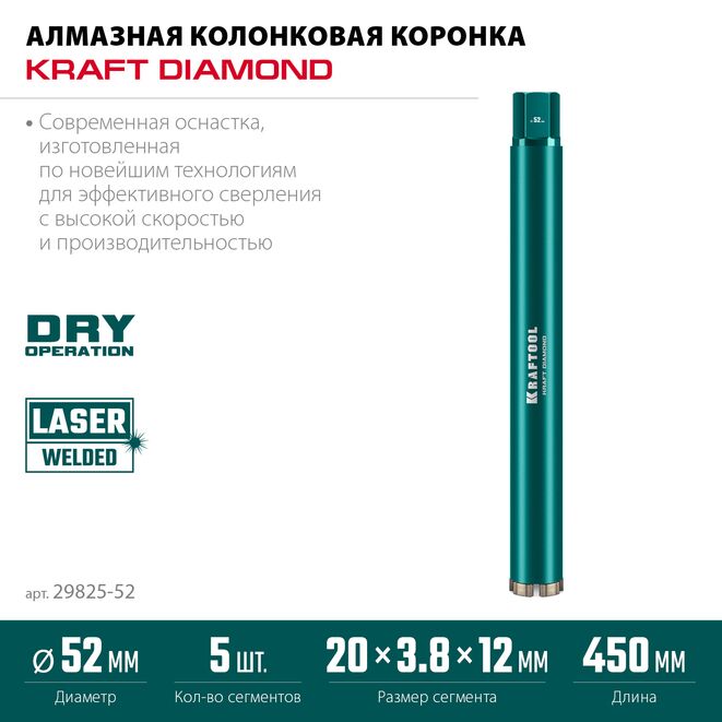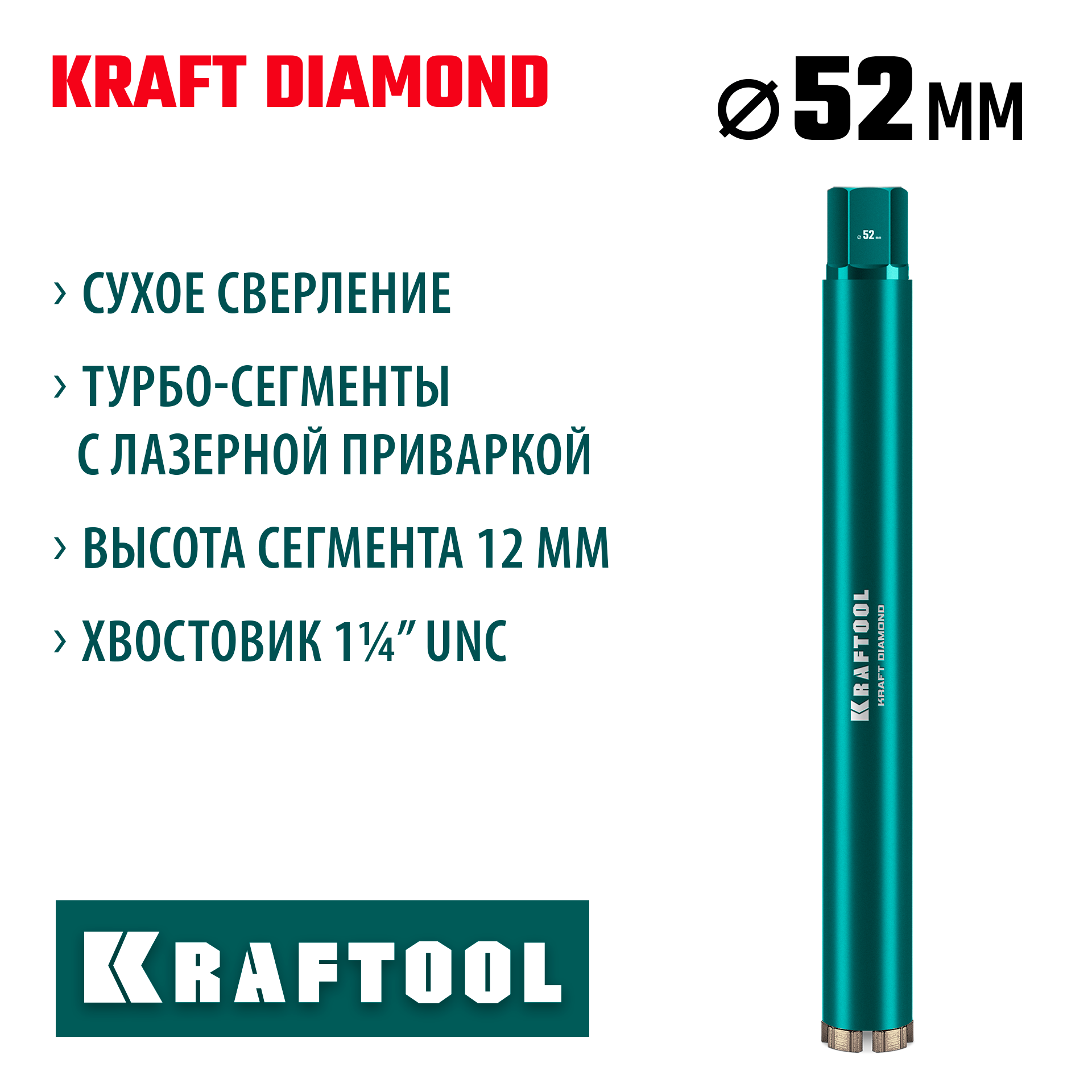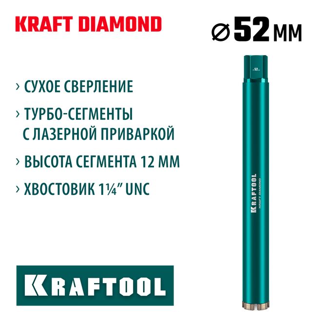 KRAFTOOL DIAMOND 52 мм (450 мм, 1 1/4", лазерная сварка сегментов), алмазная коронка по железобетону (29825-052)