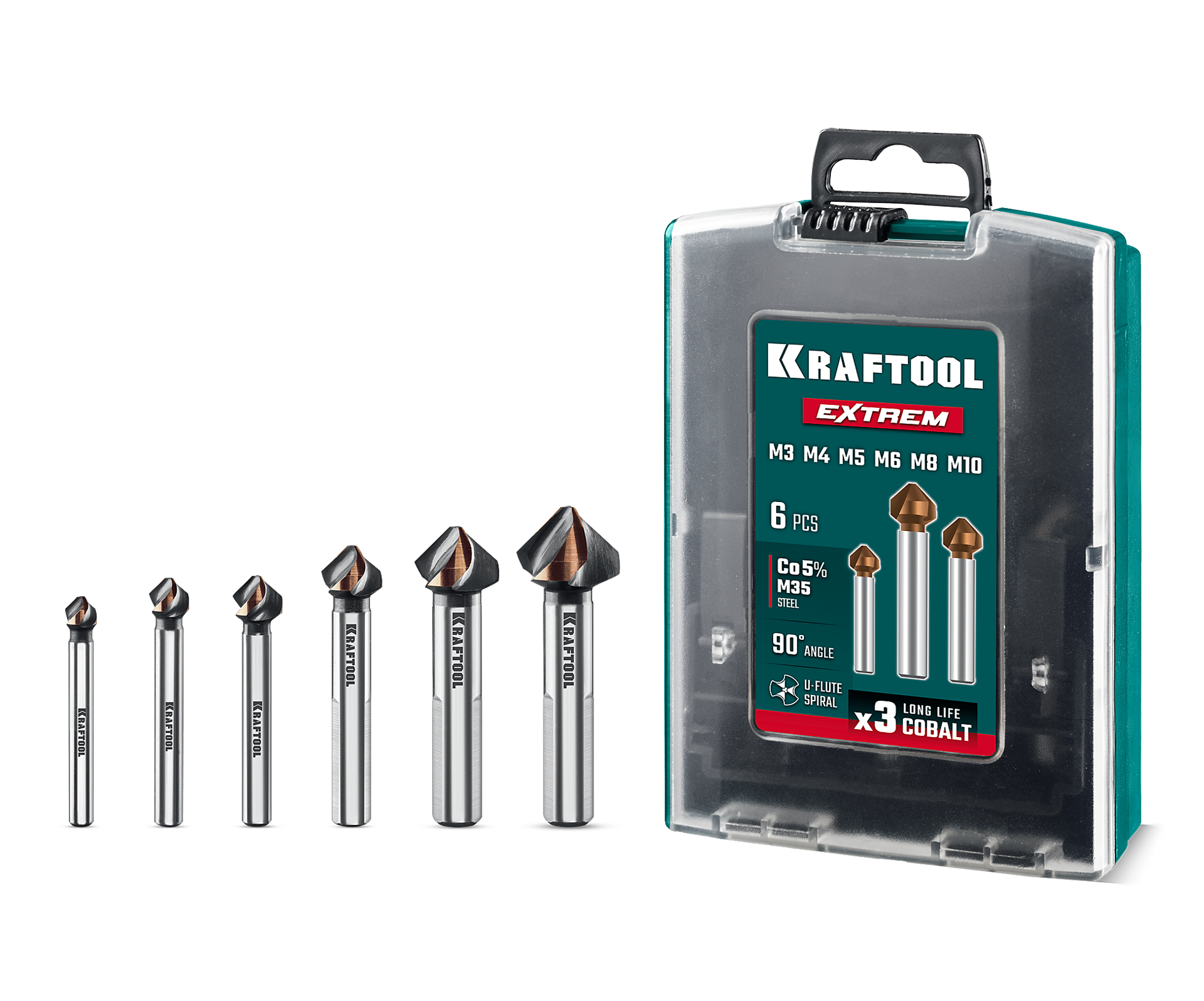 KRAFTOOL EXTREME Со5-А, 6 шт (М3-М10), сталь M35, U-образная спираль, Набор зенкеров (29734-H6)