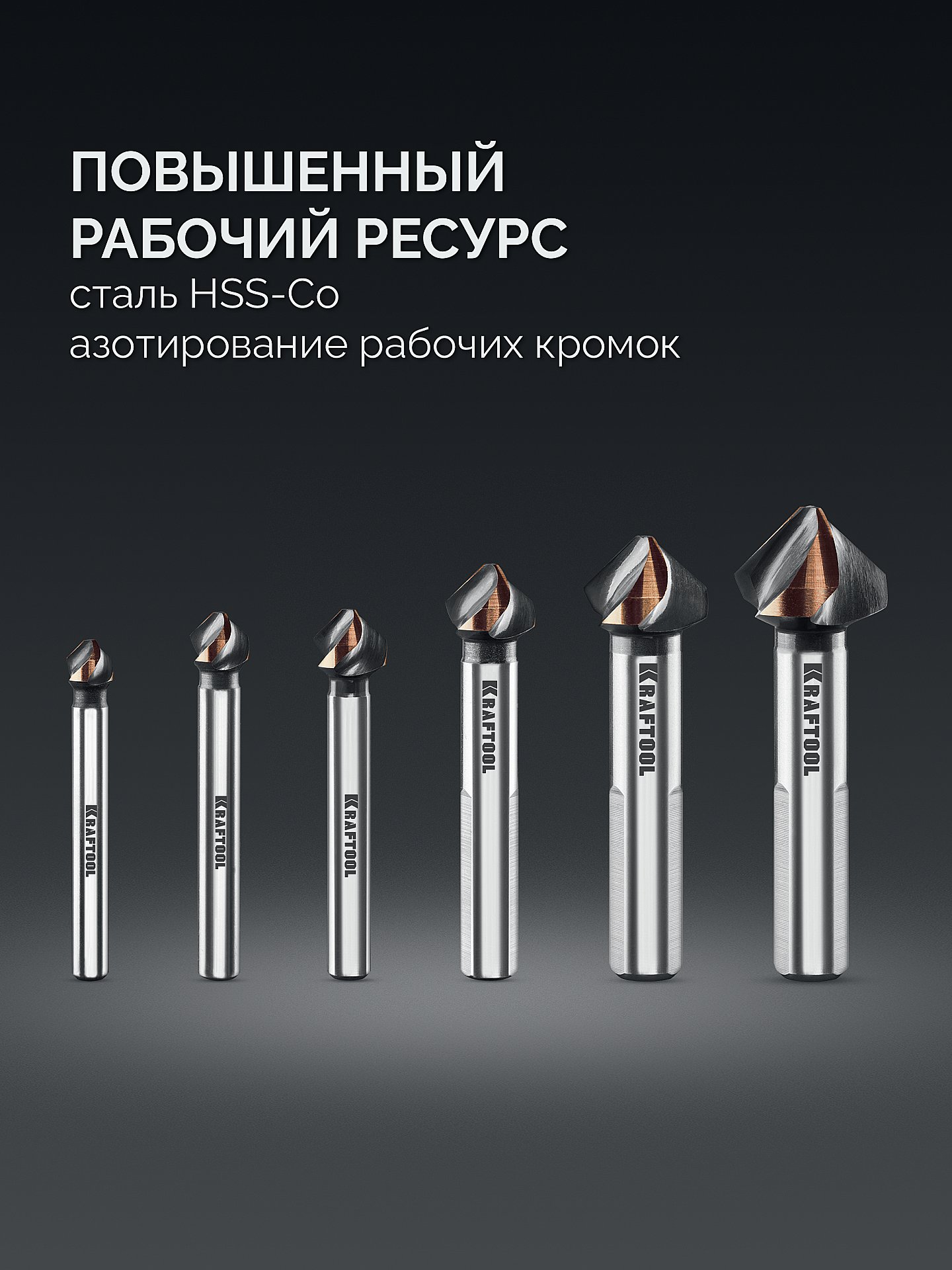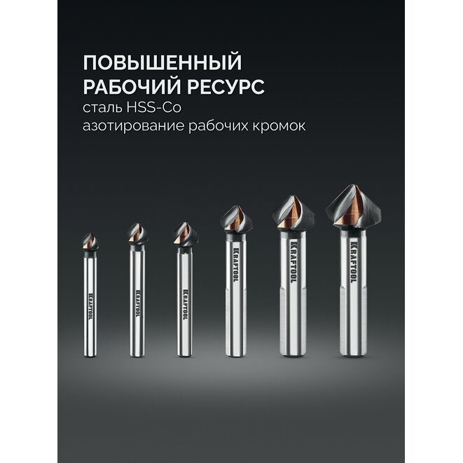 Набор зенкеров KRAFTOOL 29734-H6, предназначен для зенкования отверстий в стали, цветных металлах и пластике с помощью электродрели или сверлильного станка. Конусные зенкеры KRAFTOOL производятся на самом современном оборудовании и проходят строжайший контроль качества на каждом этапе изготовления, благодаря чему обеспечивается быстрая и эффективная раззенковка отверстий с помощью данного инструмента. Конусные зенкеры KRAFTOOL имеют оптимальные углы заточки и выполнены из высококачественных быстрорежущих сталей по специальной технологии.Характеристики Kraftool 29734-H6: