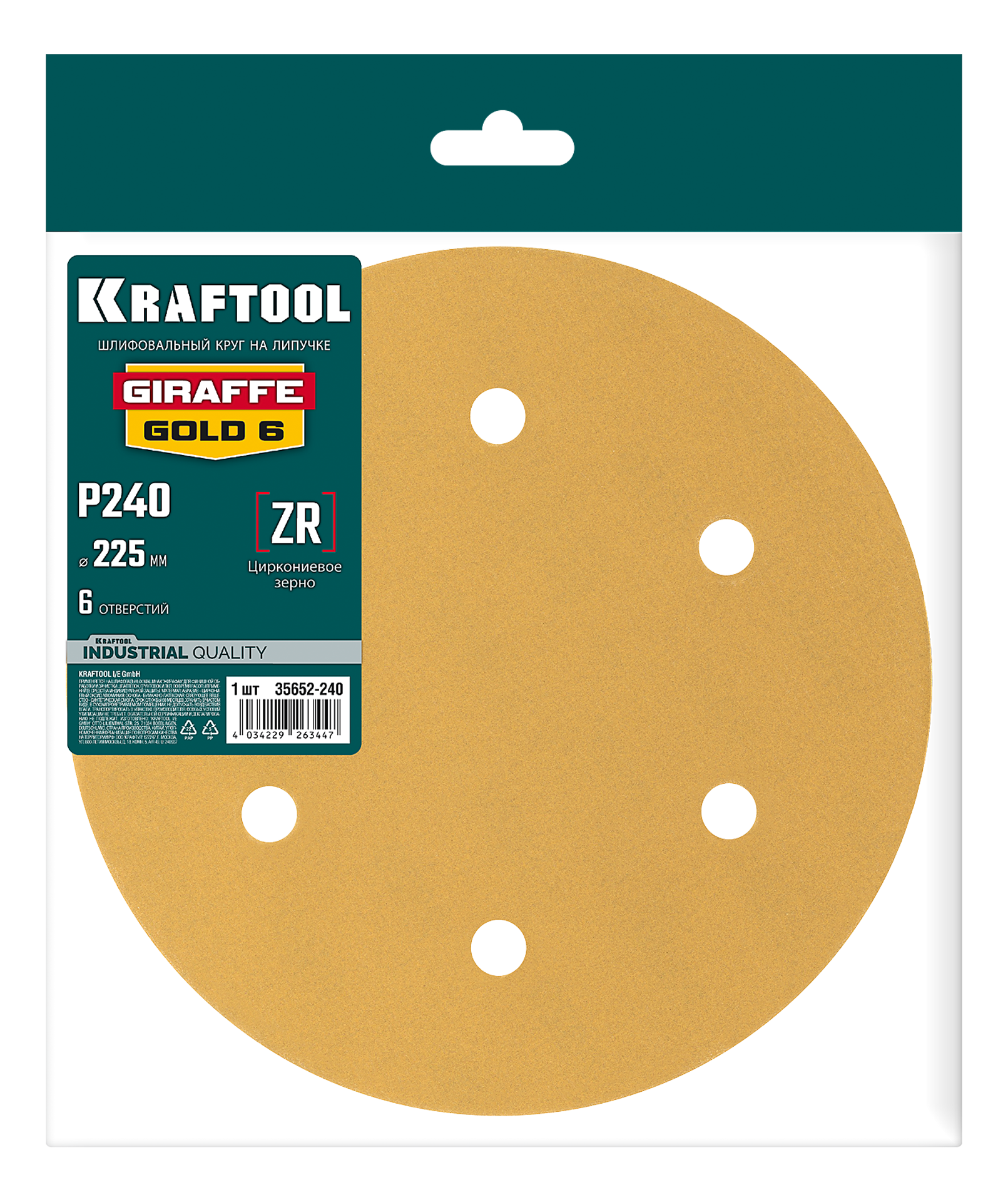KRAFTOOL Giraffe GOLD-6 225 мм, Р240, шлифовальный круг на липучке, 6 отв. (35652-240)