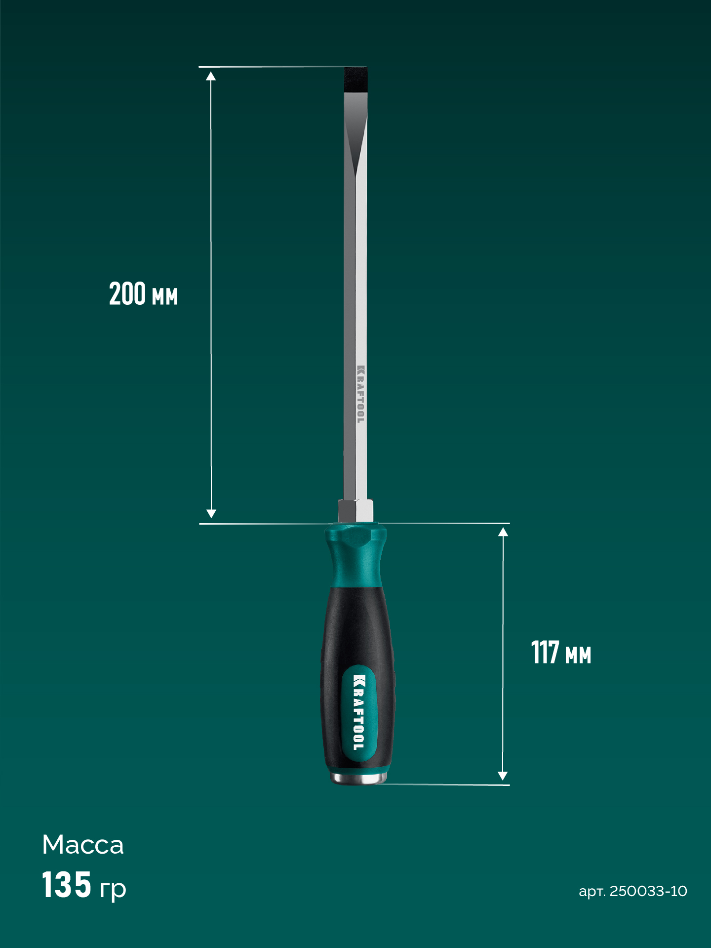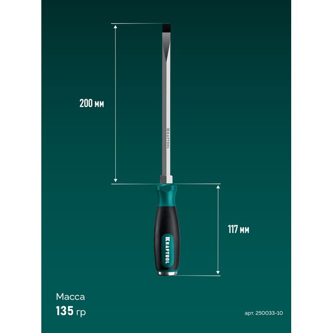 Отвертка ударная Impact KRAFTOOL 250033-10, предназначена для монтажа и демонтажа резьбовых соединений в промышленности, коммунальном секторе, профессиональных и личных мастерских при проведении различных слесарных работ. Профессиональные ударные отвертки Kraftool изготовлены из высококачественной хромолибденовой стали и обсеспечивают максимальный срок службы при высоких нагрузках.