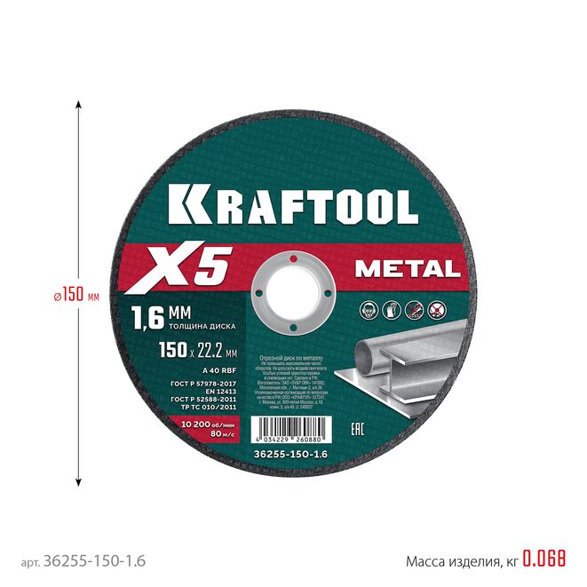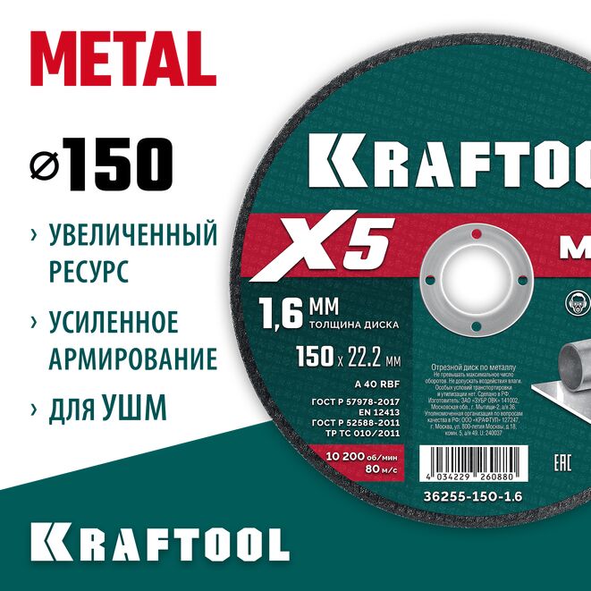 KRAFTOOL X5 Metal 150x1.6 мм по металлу отрезной диск для УШМ (36255-150-1.6)