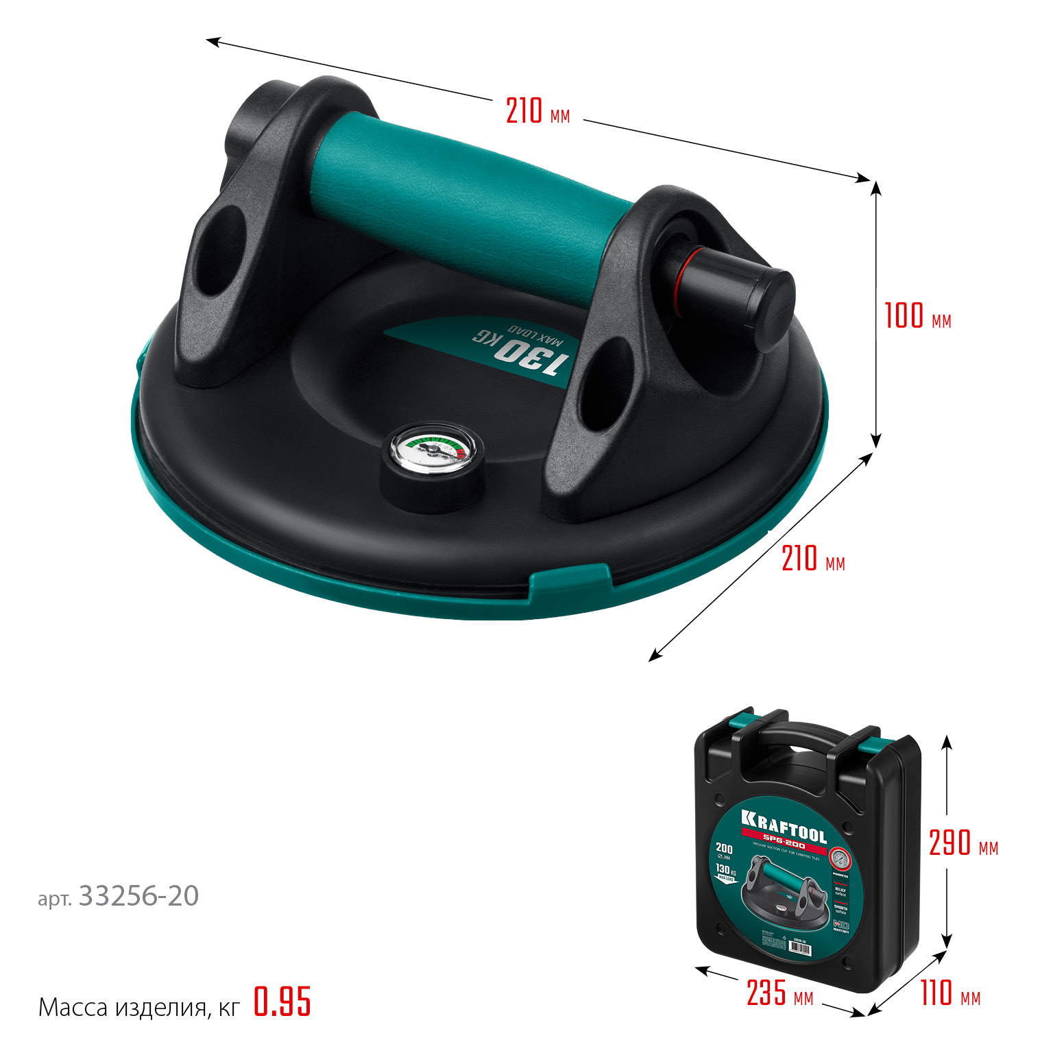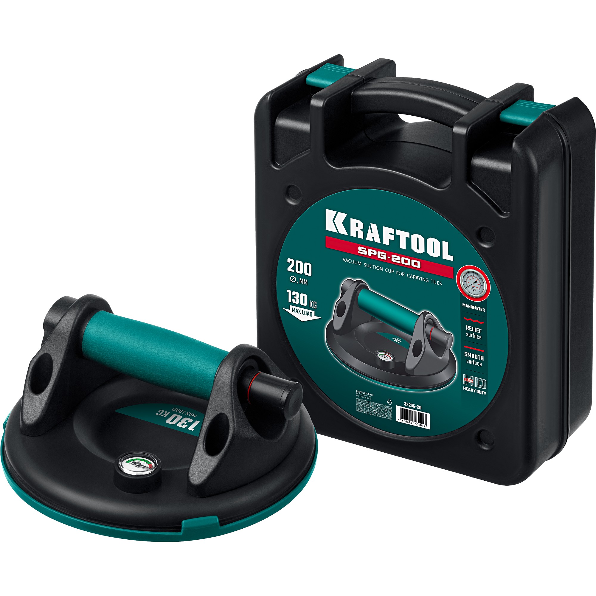 KRAFTOOL SPG-200 d - 200 мм, макс 130 кг, манометр, Вакуумная присоска (33256-20)