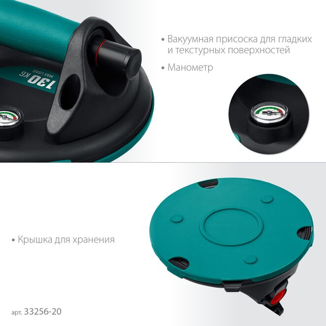 Помпа, встроенная в ручку позволяет удобно создавать и поддерживать вакуум. Имеет клапан для быстрого сброса вакуума и манометр, который позволяет безопасно переносить плитку, исключая возможность её отрыва от присоски. Максимальная нагрузка 130 кг.