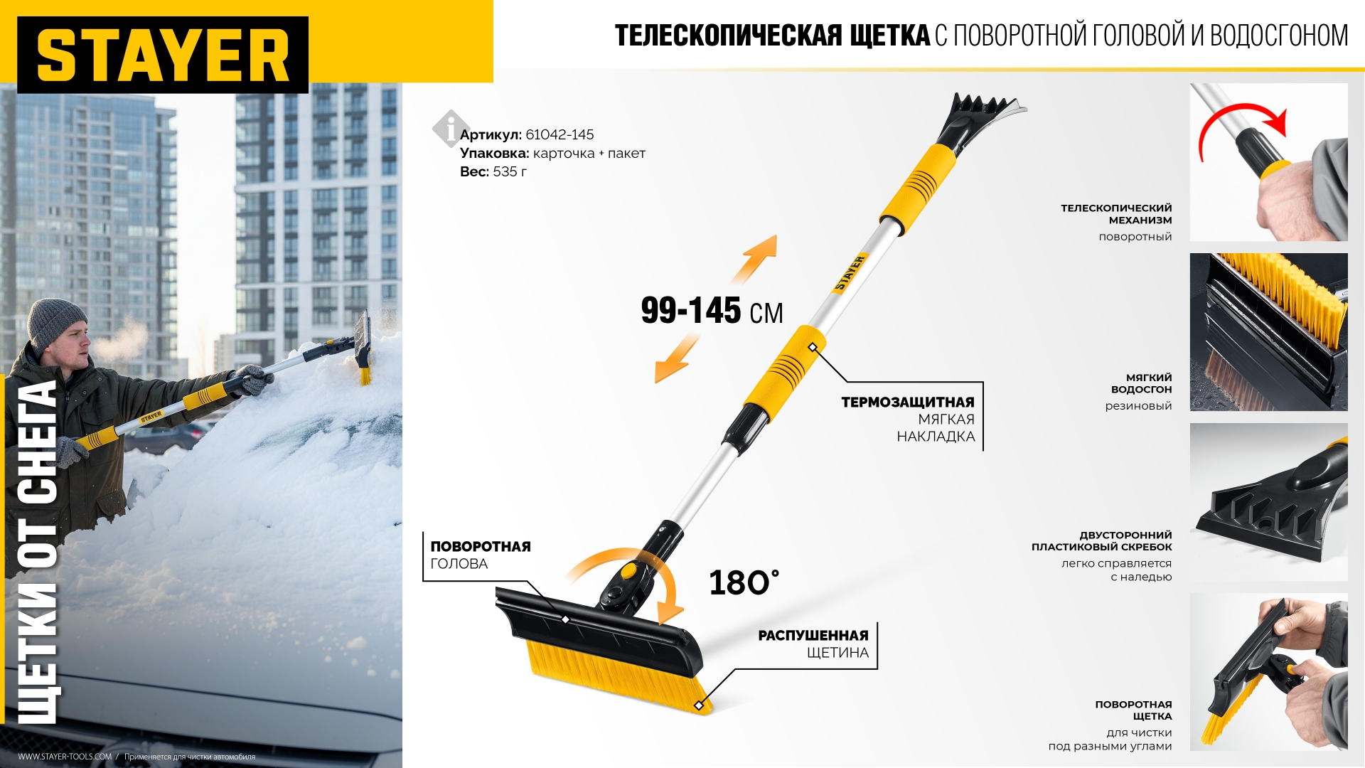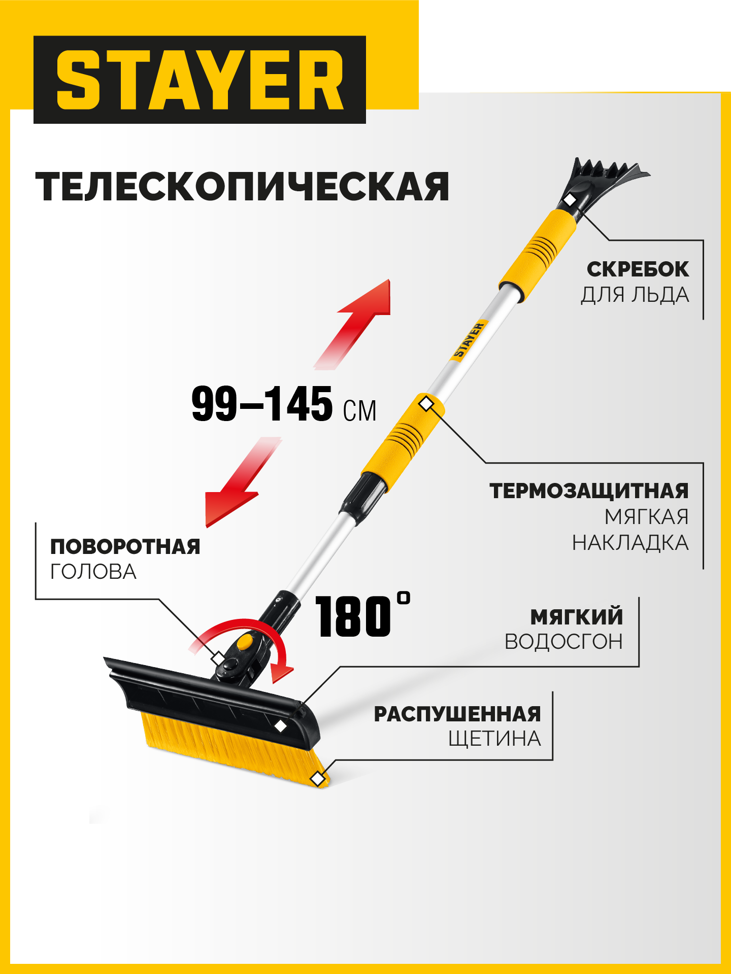 STAYER 980-1450 мм, телескопическая щётка с поворотной головой и водосгоном от снега автомобильная (61042-145)