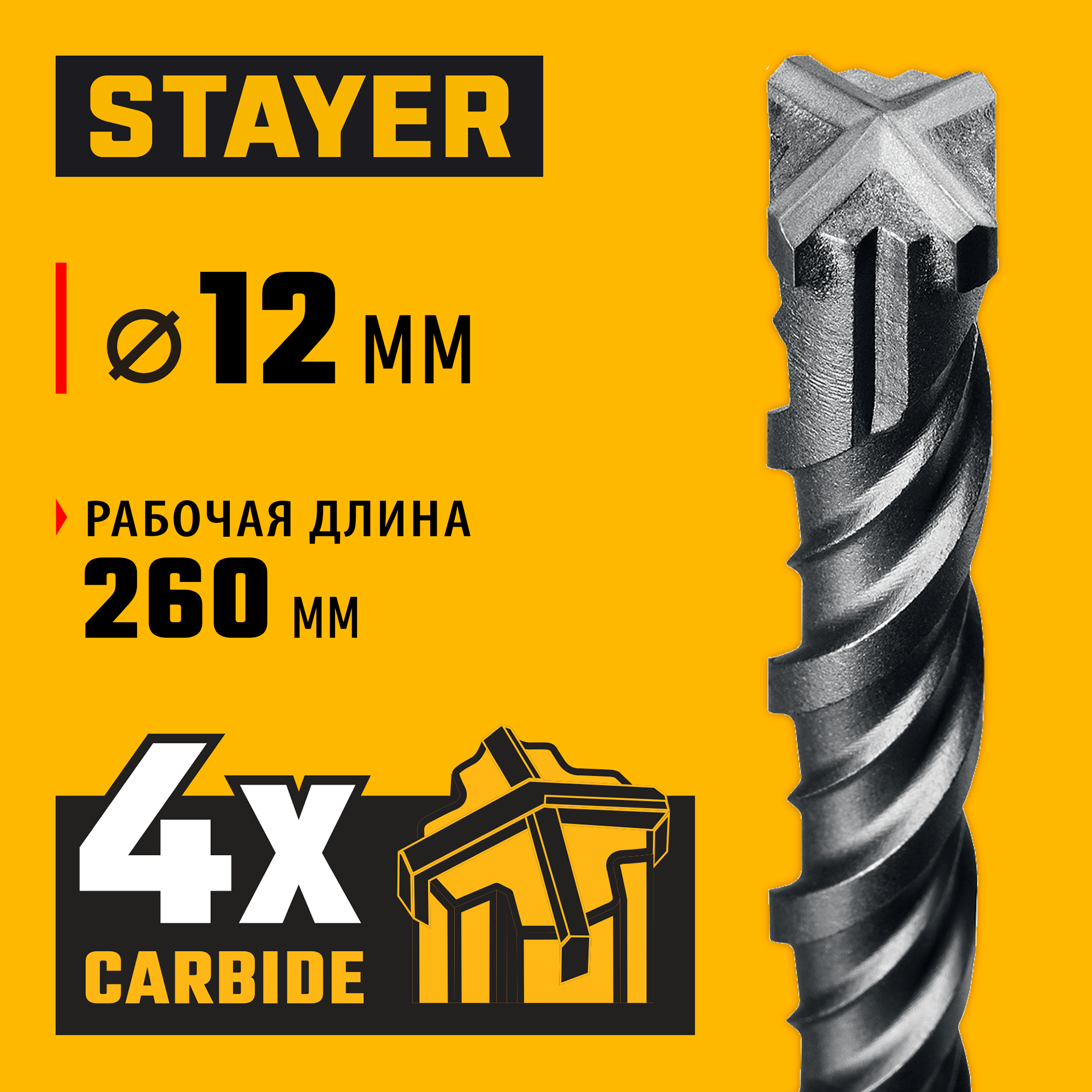 Буры STAYER HERCULES-4Х - надежный инструмент, отвечающий самым высоким требованиям качества и для любой сложности работ. Применяются при сверлении отверстий в бетоне, граните, кирпичной кладке, камне и твердых известняках.