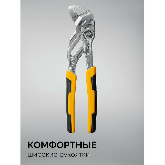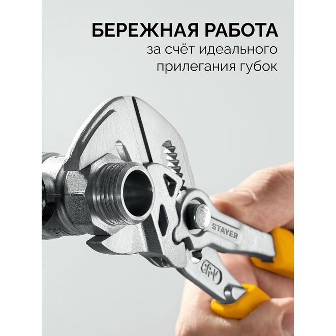 Клещи-гаечный ключ переставные STAYER 22401, предназначены для выполнения слесарно-монтажных и ремонтных работ. Можно использовать в качестве трубного или разводного ключа.