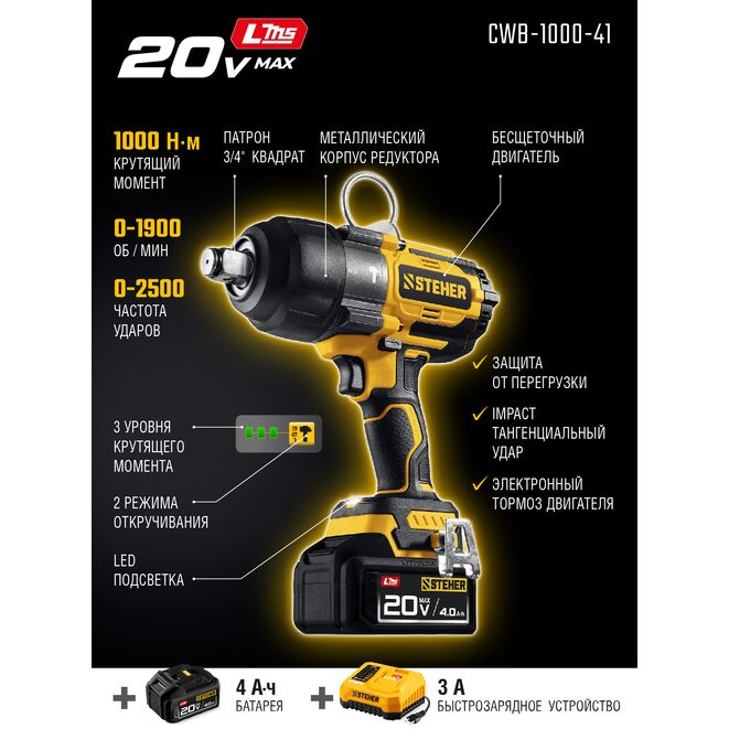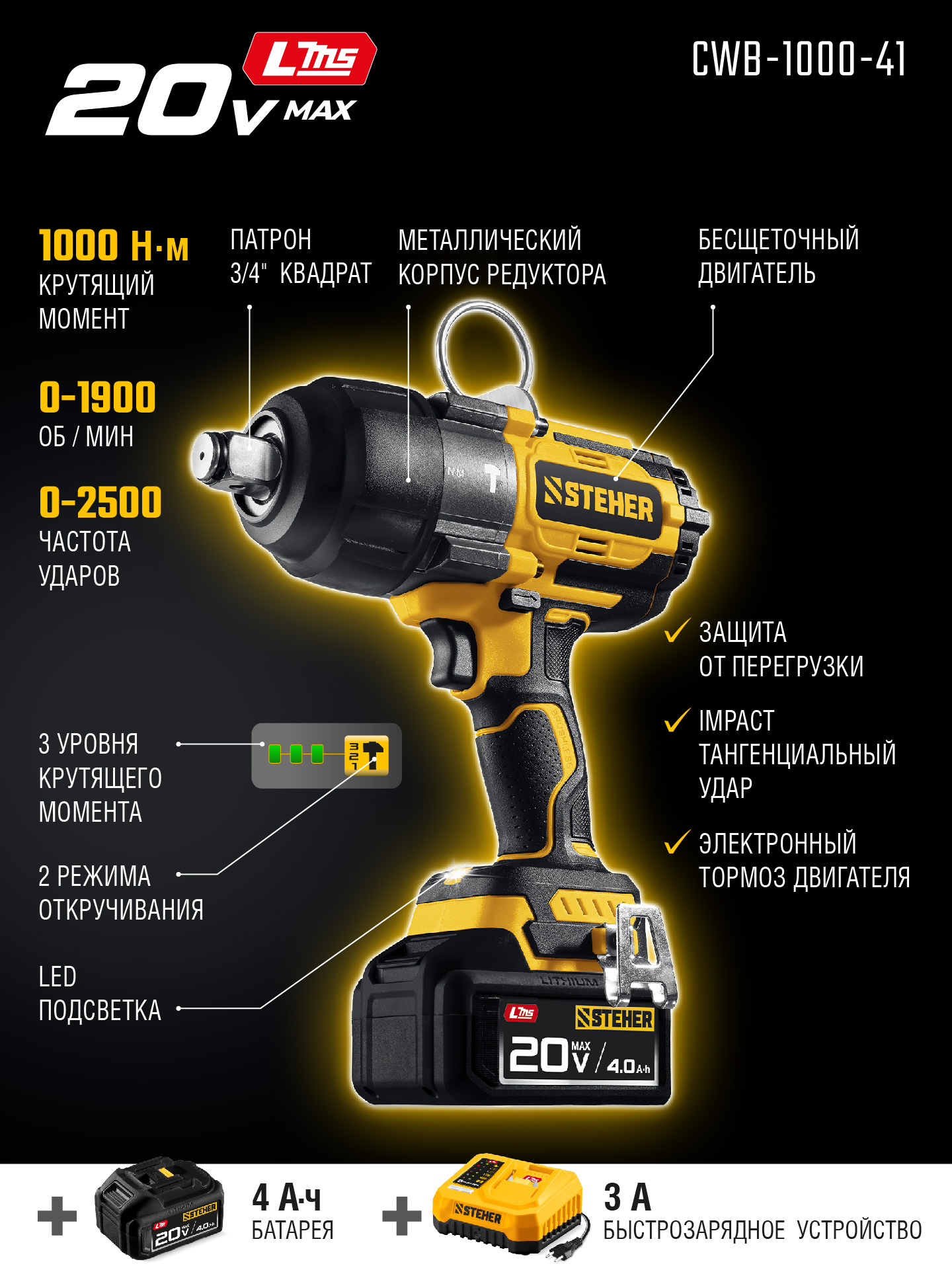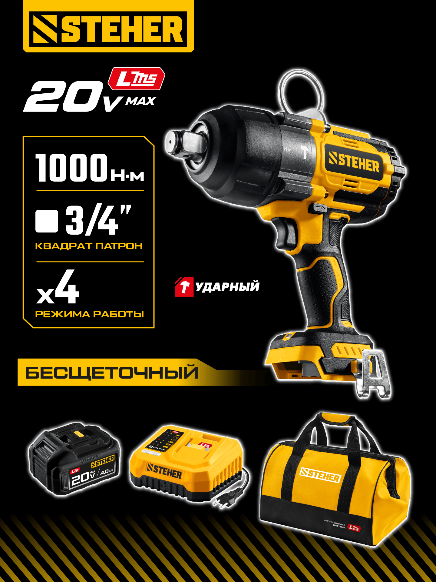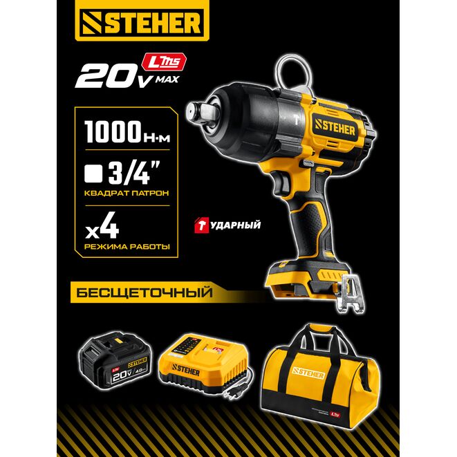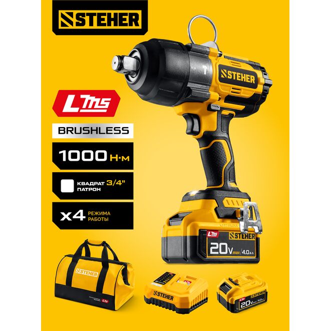 STEHER 20 В, 1000 Н·м, 1 АКБ LMS (4 А·ч), бесщеточный ударный гайковерт, сумка (CWB-1000-41)