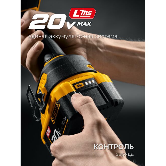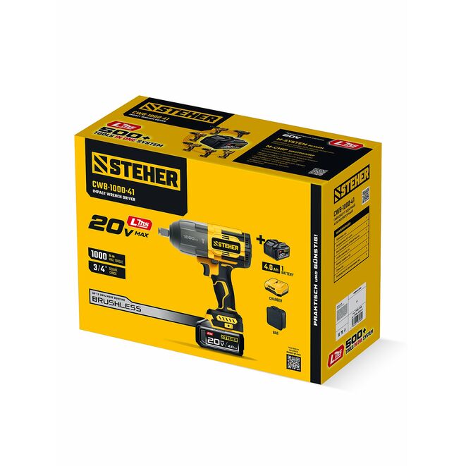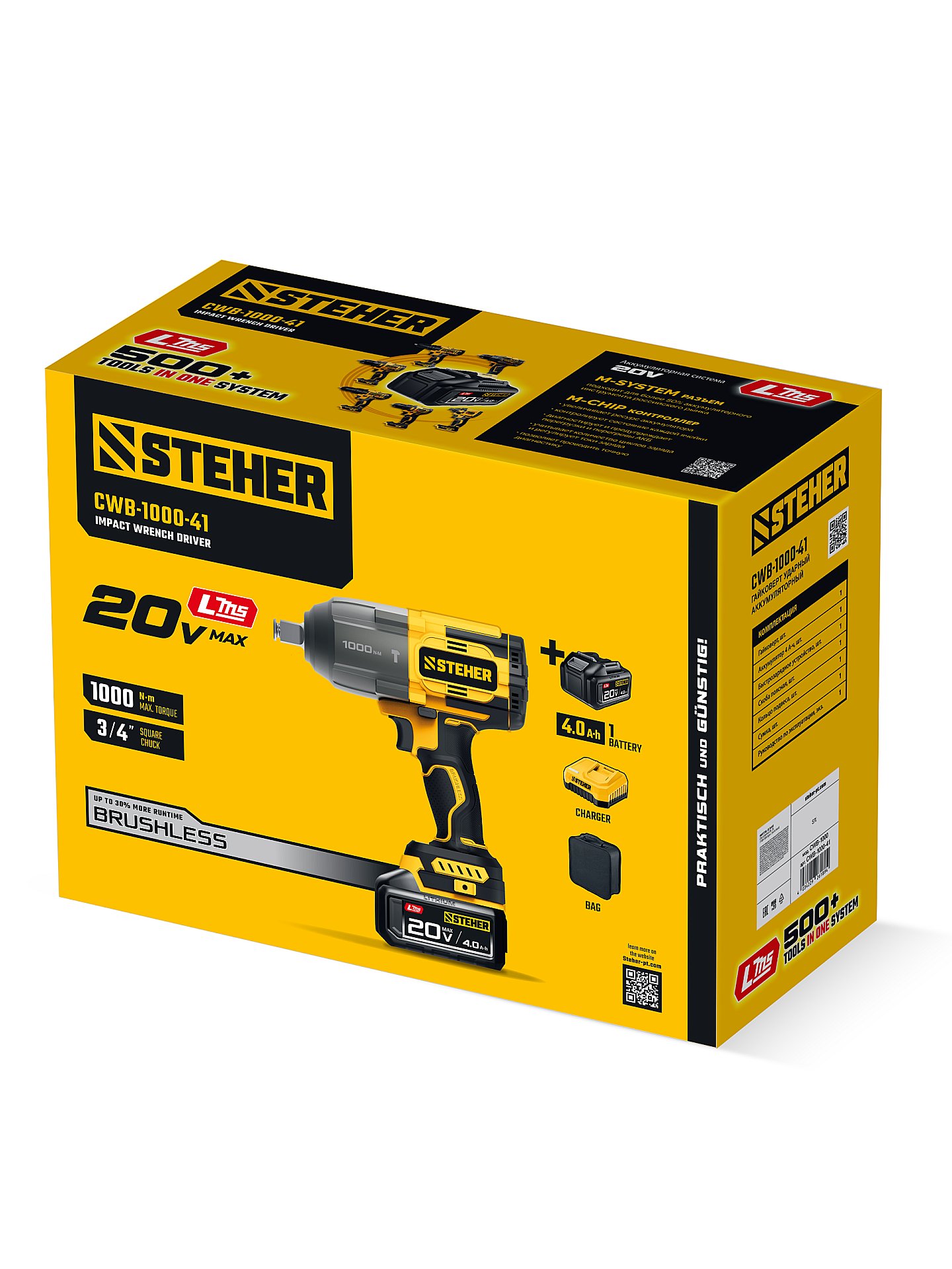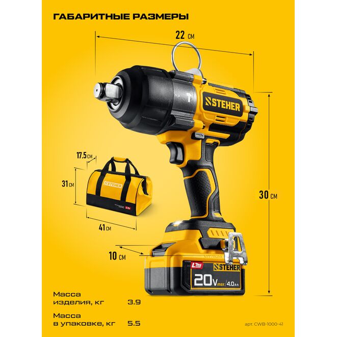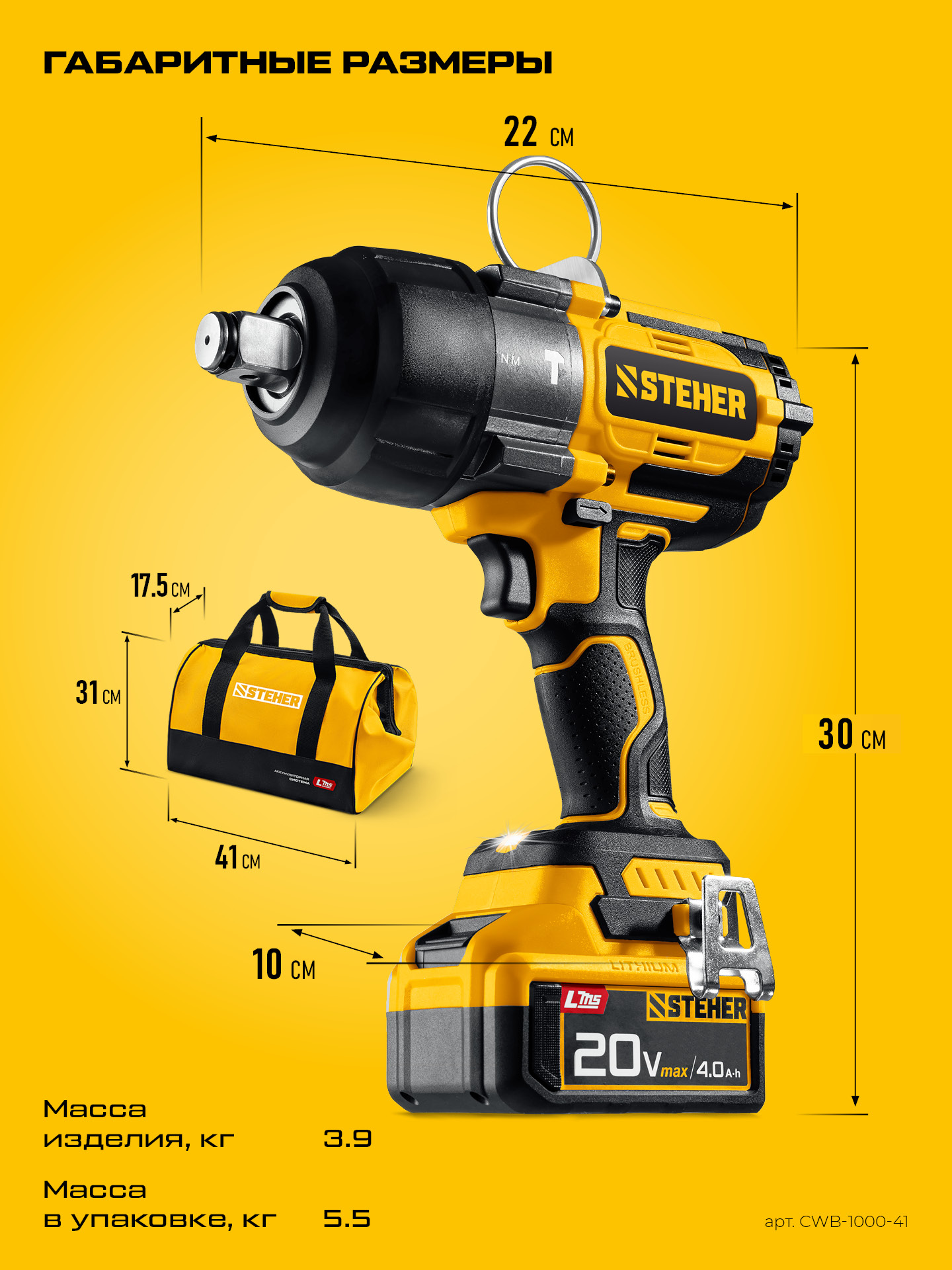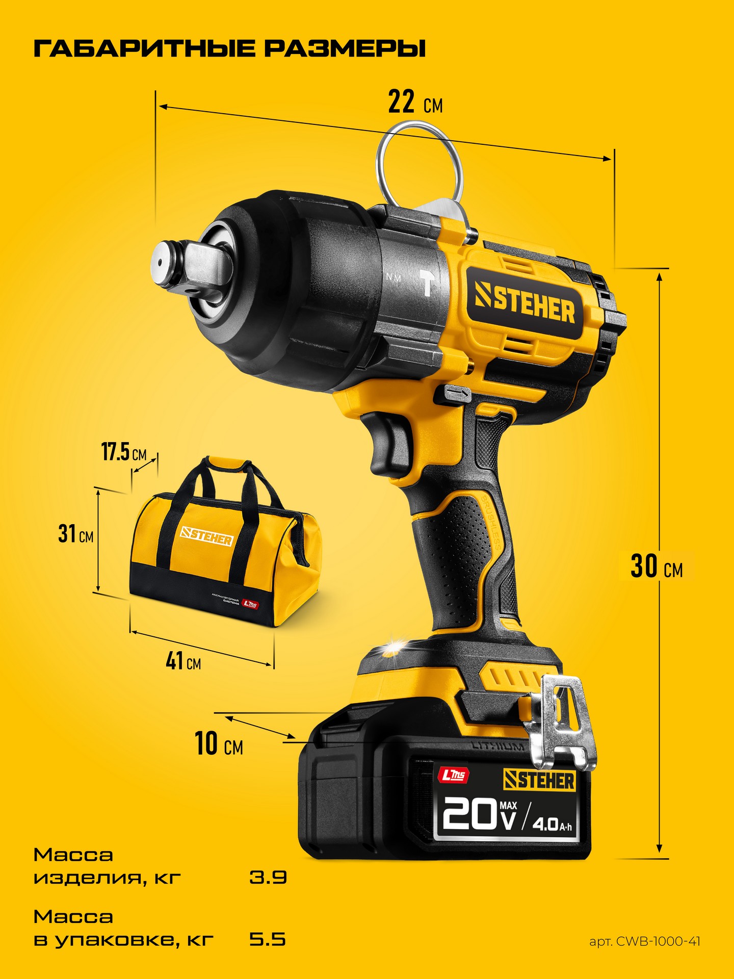 STEHER 20 В, 1000 Н·м, 1 АКБ LMS (4 А·ч), бесщеточный ударный гайковерт, сумка (CWB-1000-41)