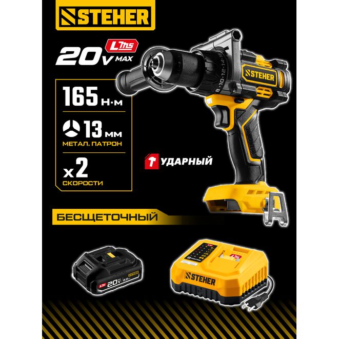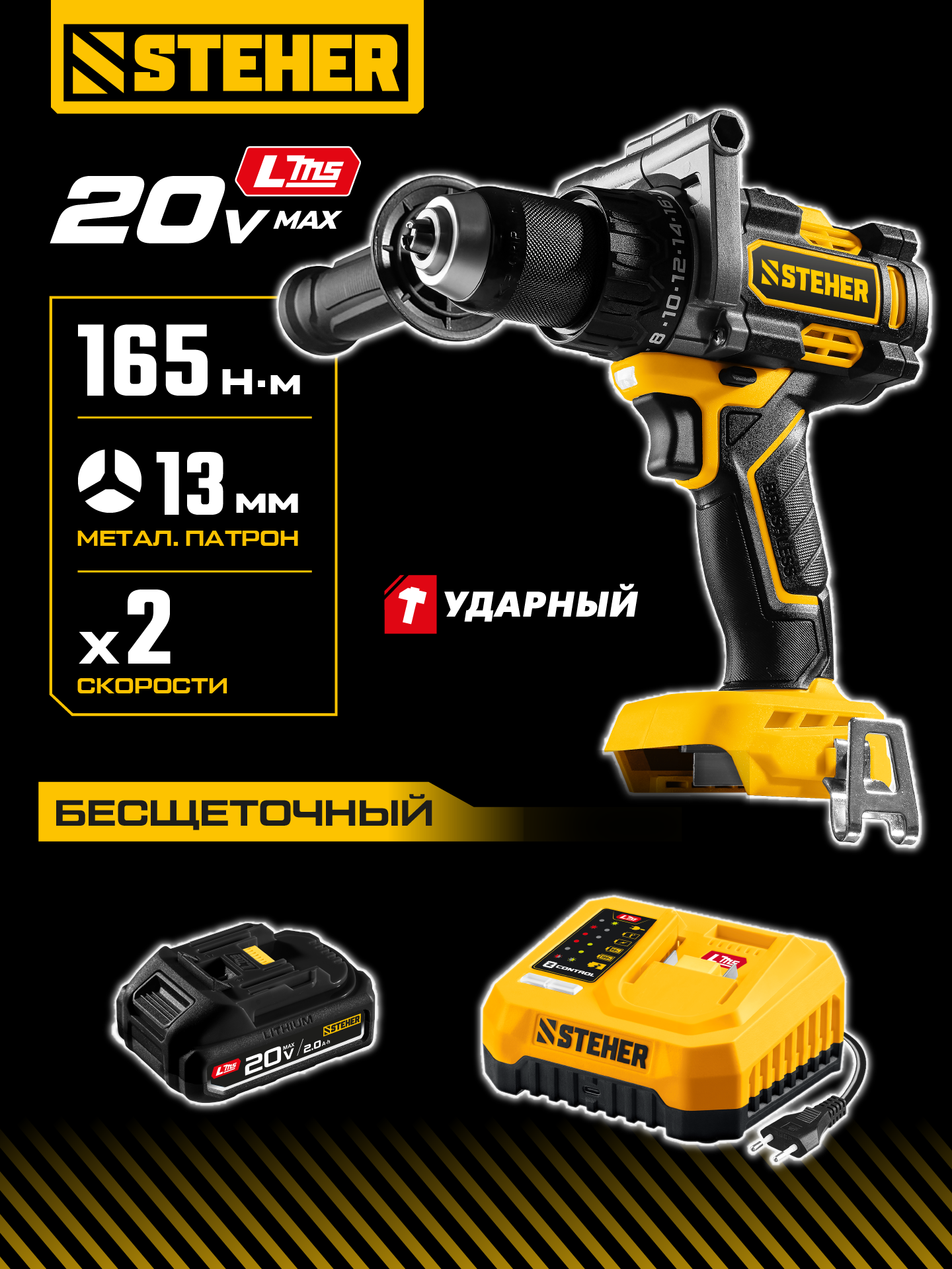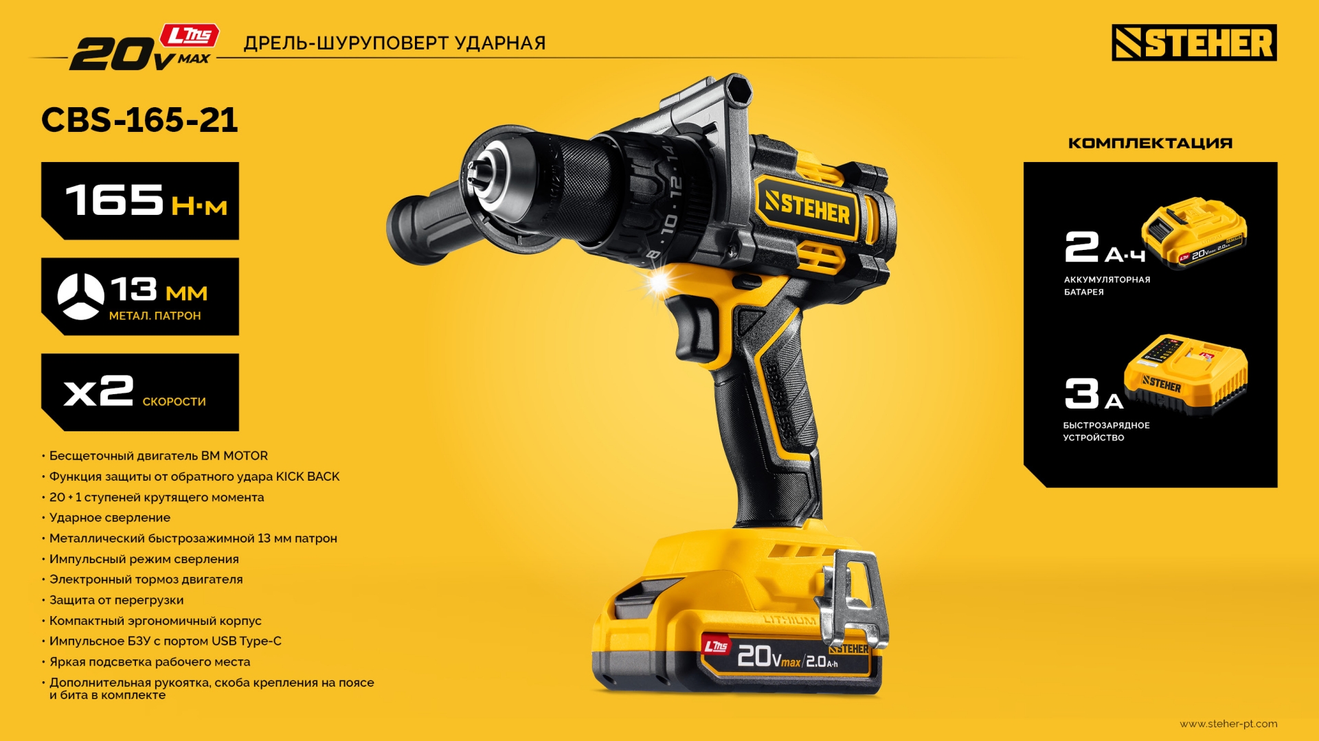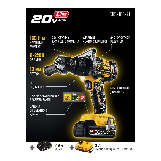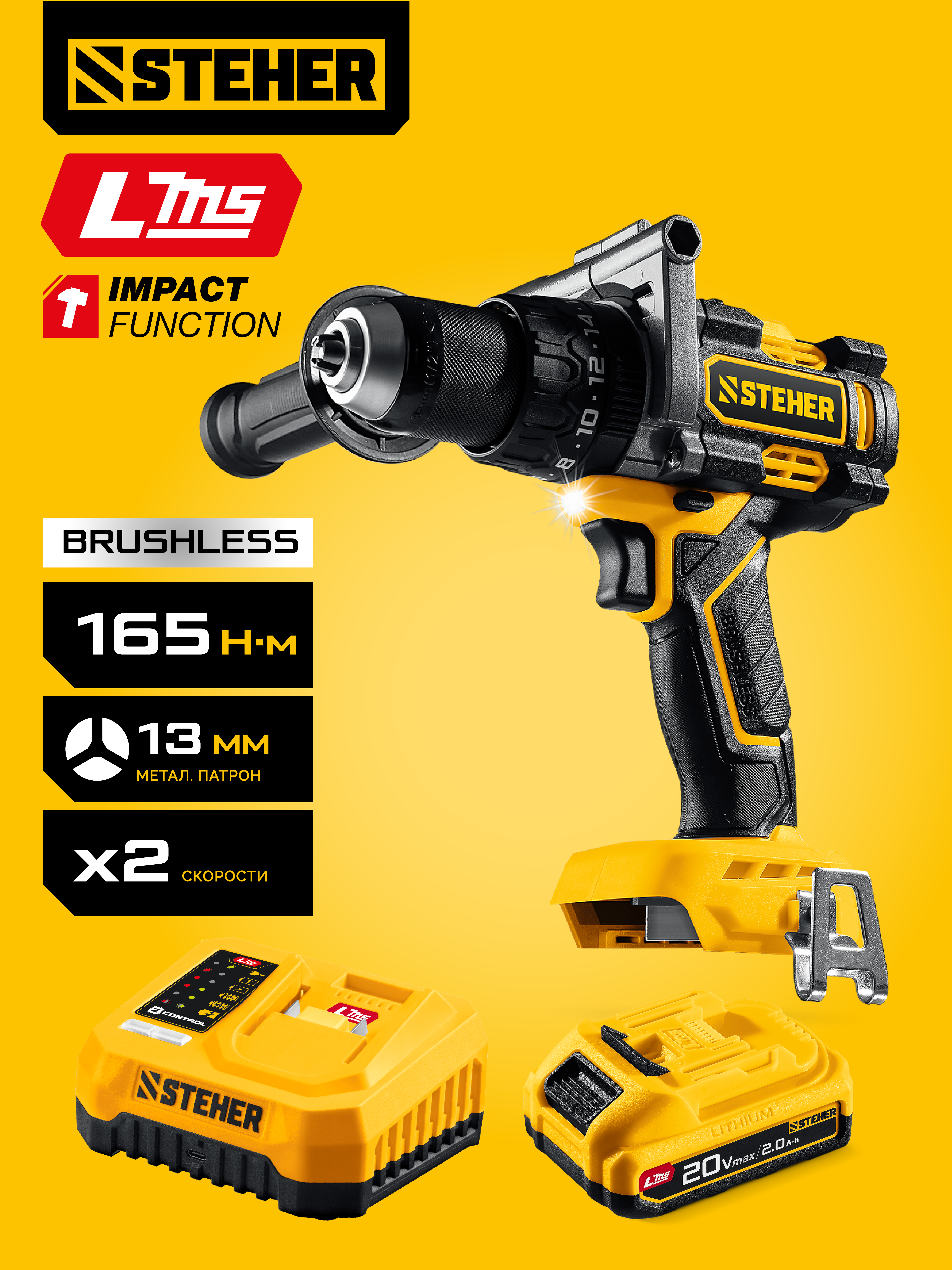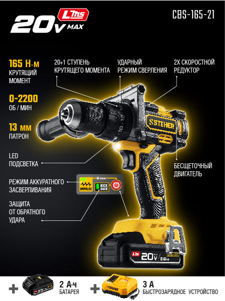 STEHER 20 В, 165 Н·м, 1 АКБ LMS (2 А·ч), бесщеточная ударная дрель-шуруповерт (CBS-165-21)