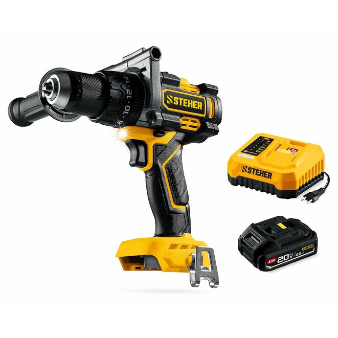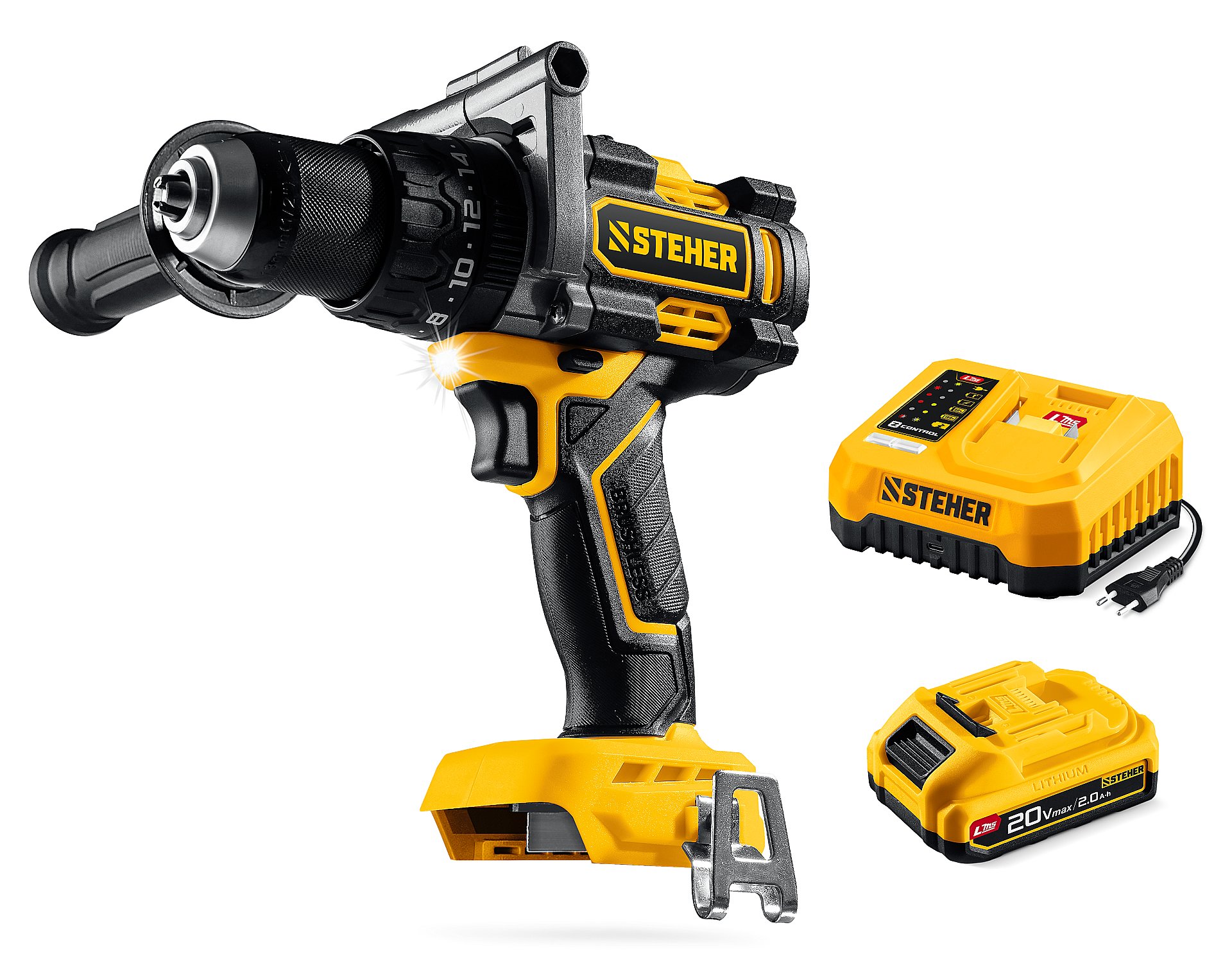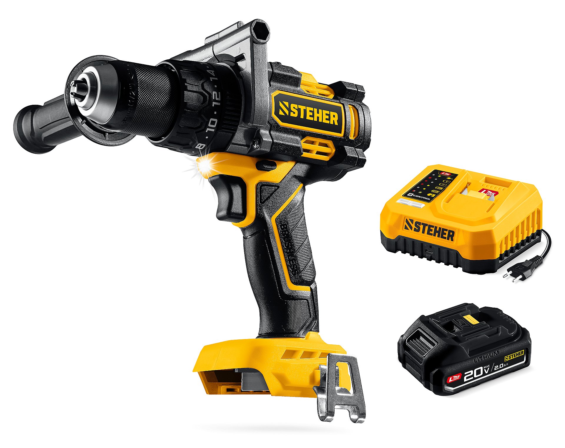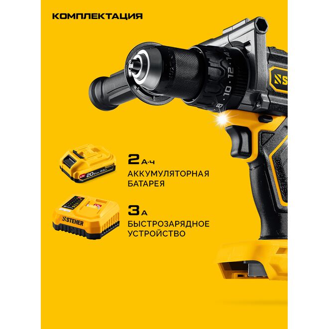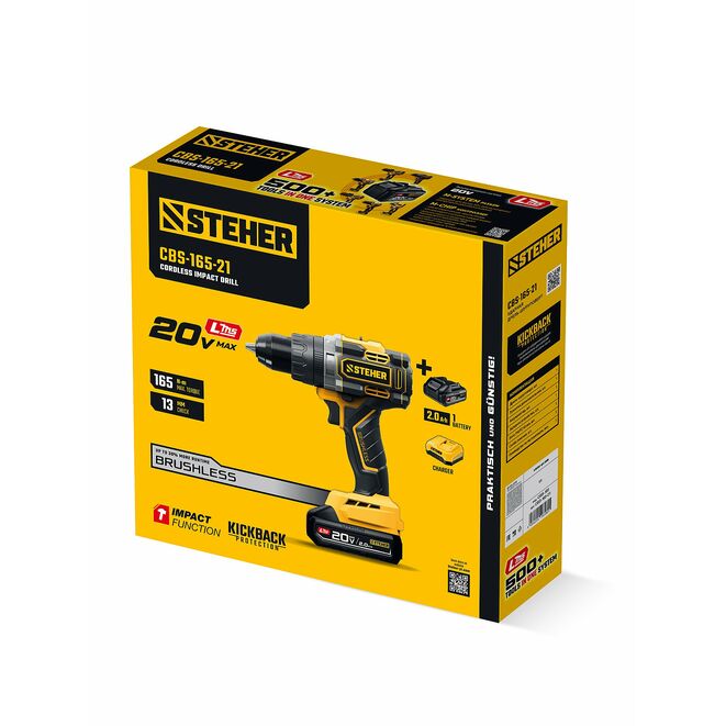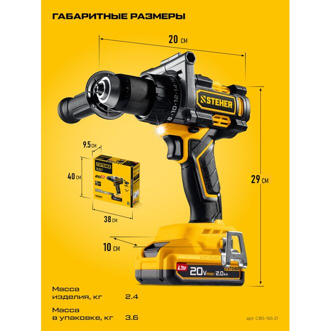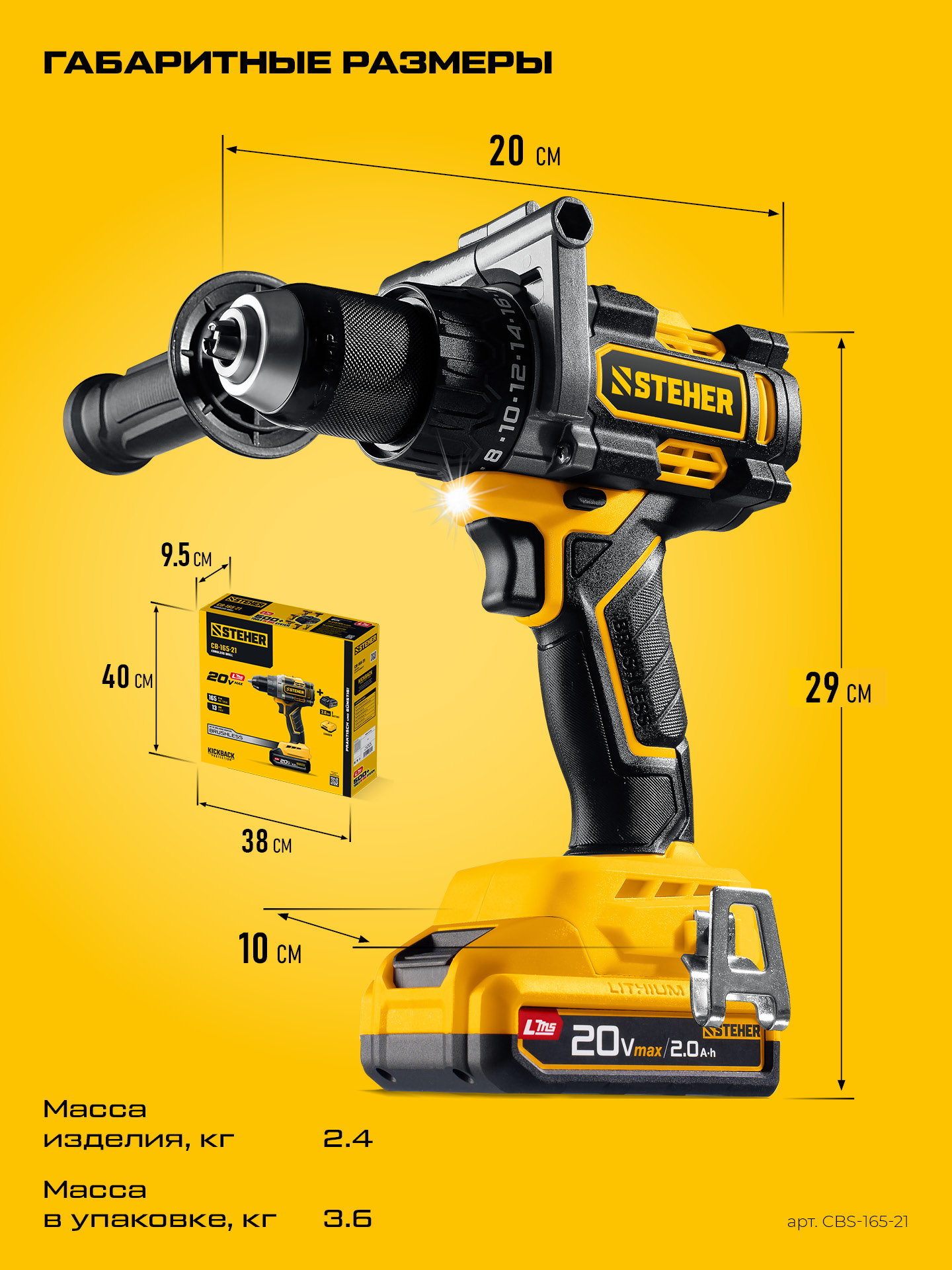 STEHER 20 В, 165 Н·м, 1 АКБ LMS (2 А·ч), бесщеточная ударная дрель-шуруповерт (CBS-165-21)
