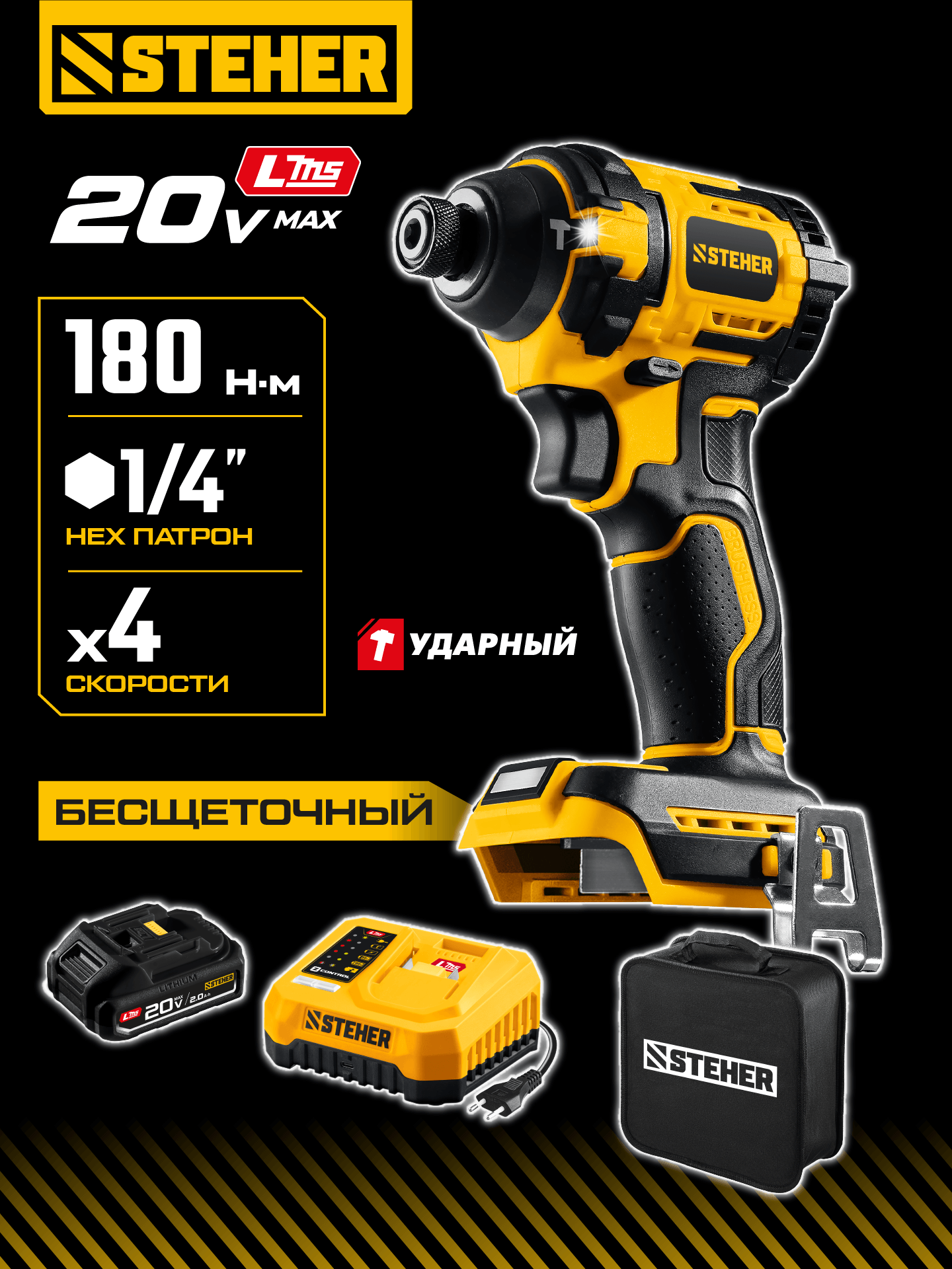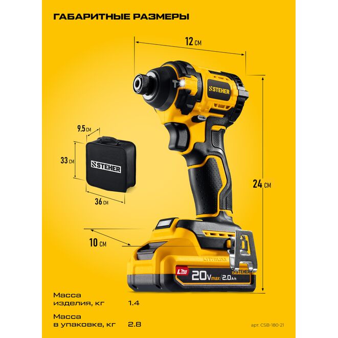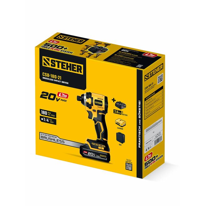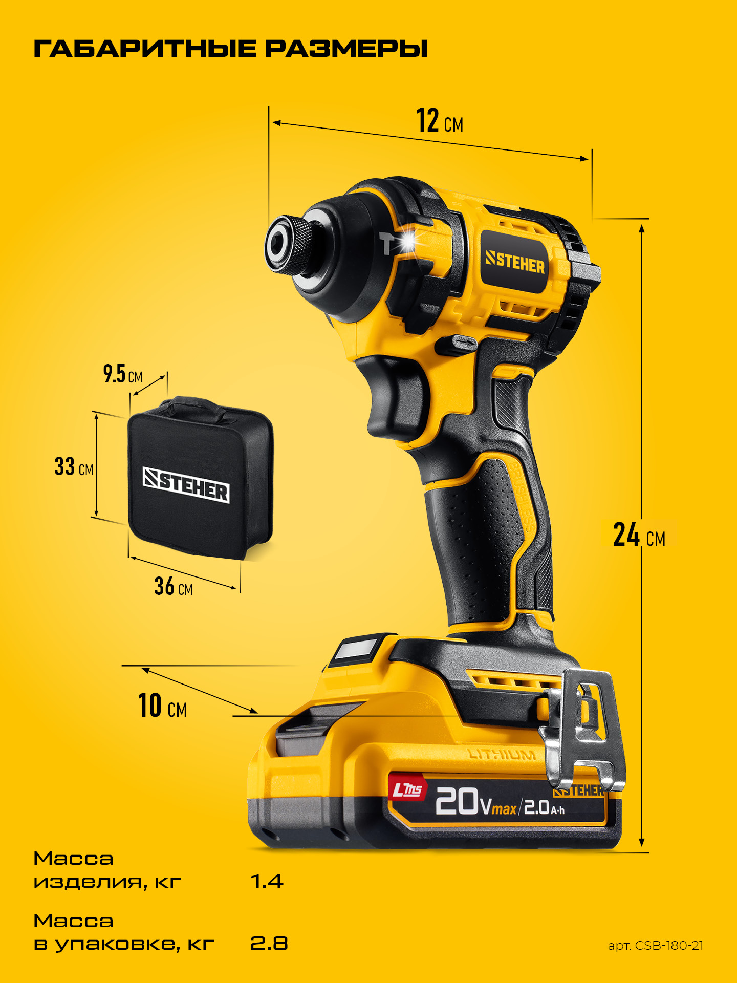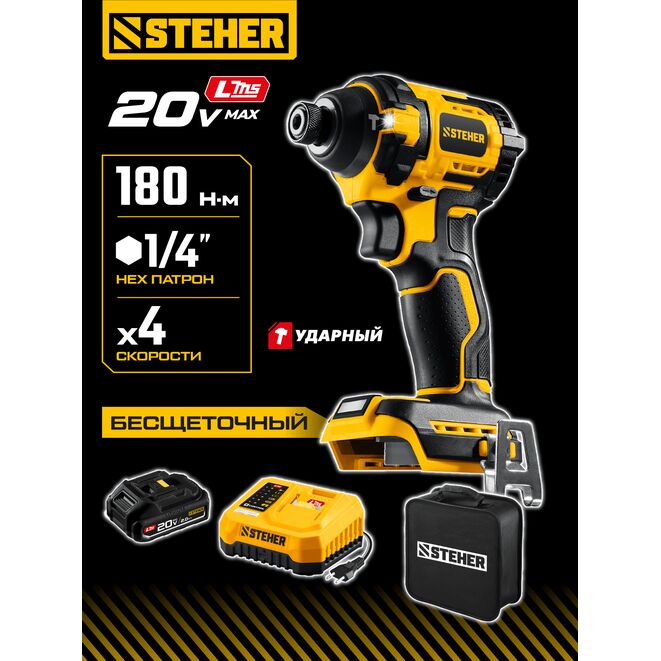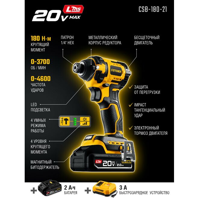 STEHER 20 В, 180 Н·м, 1 АКБ LMS (2 А·ч), бесщеточный ударный винтоверт, сумка (CSB-180-21)