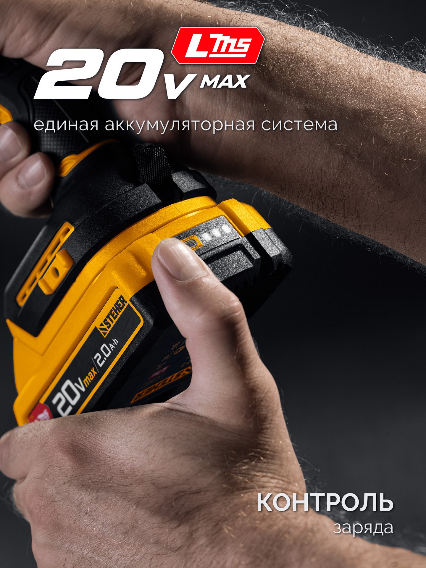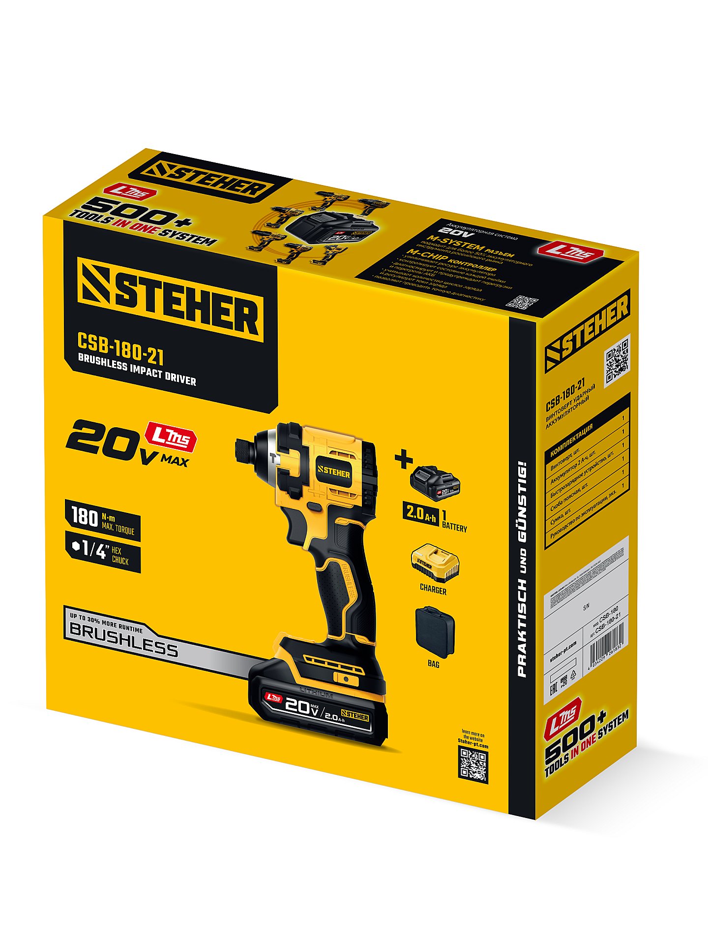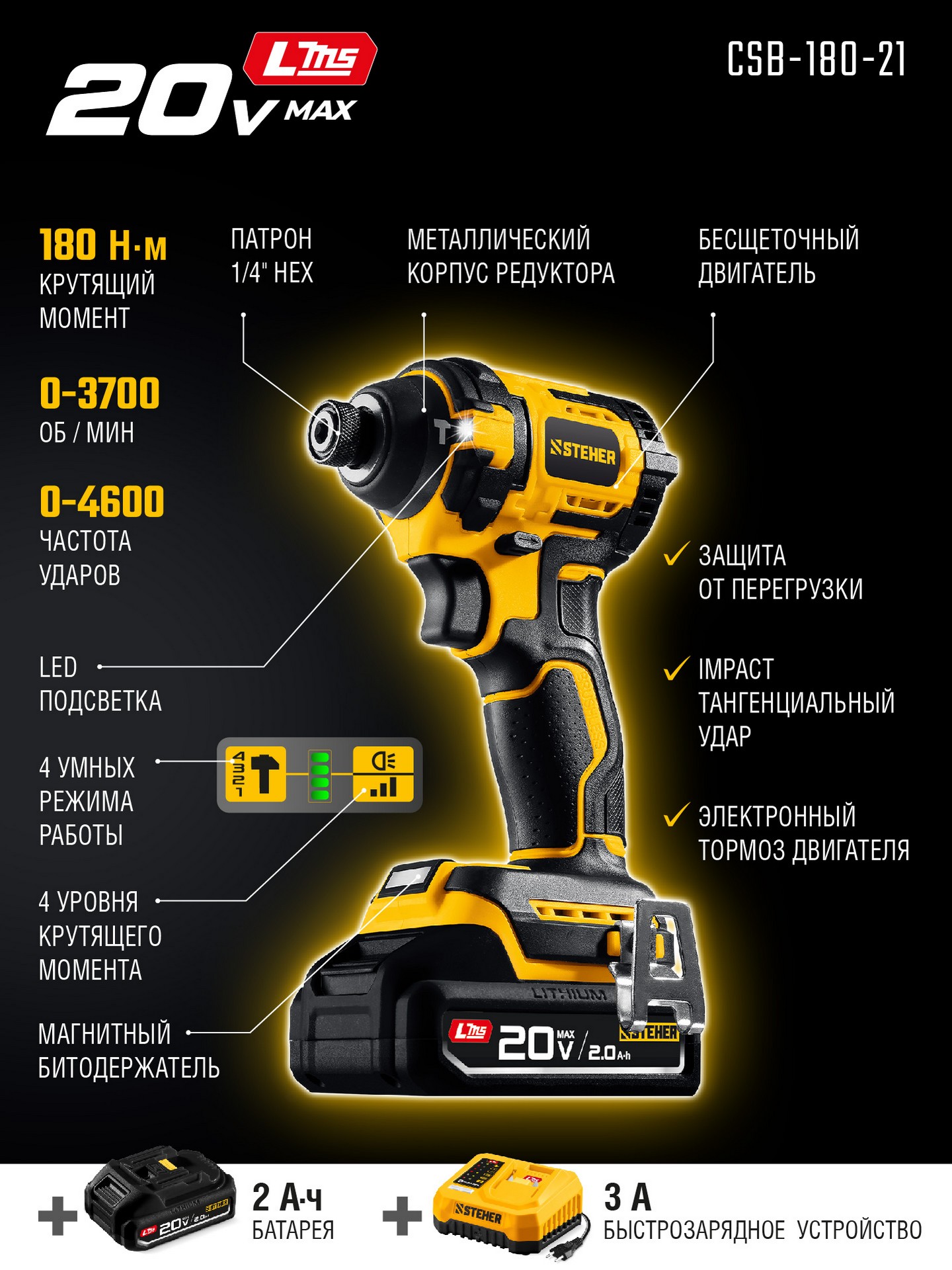 STEHER 20 В, 180 Н·м, 1 АКБ LMS (2 А·ч), бесщеточный ударный винтоверт, сумка (CSB-180-21)