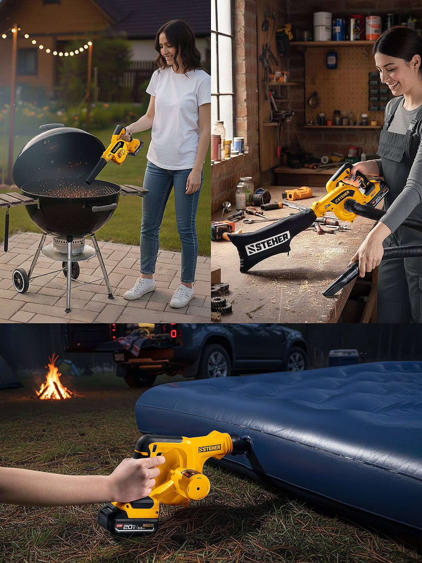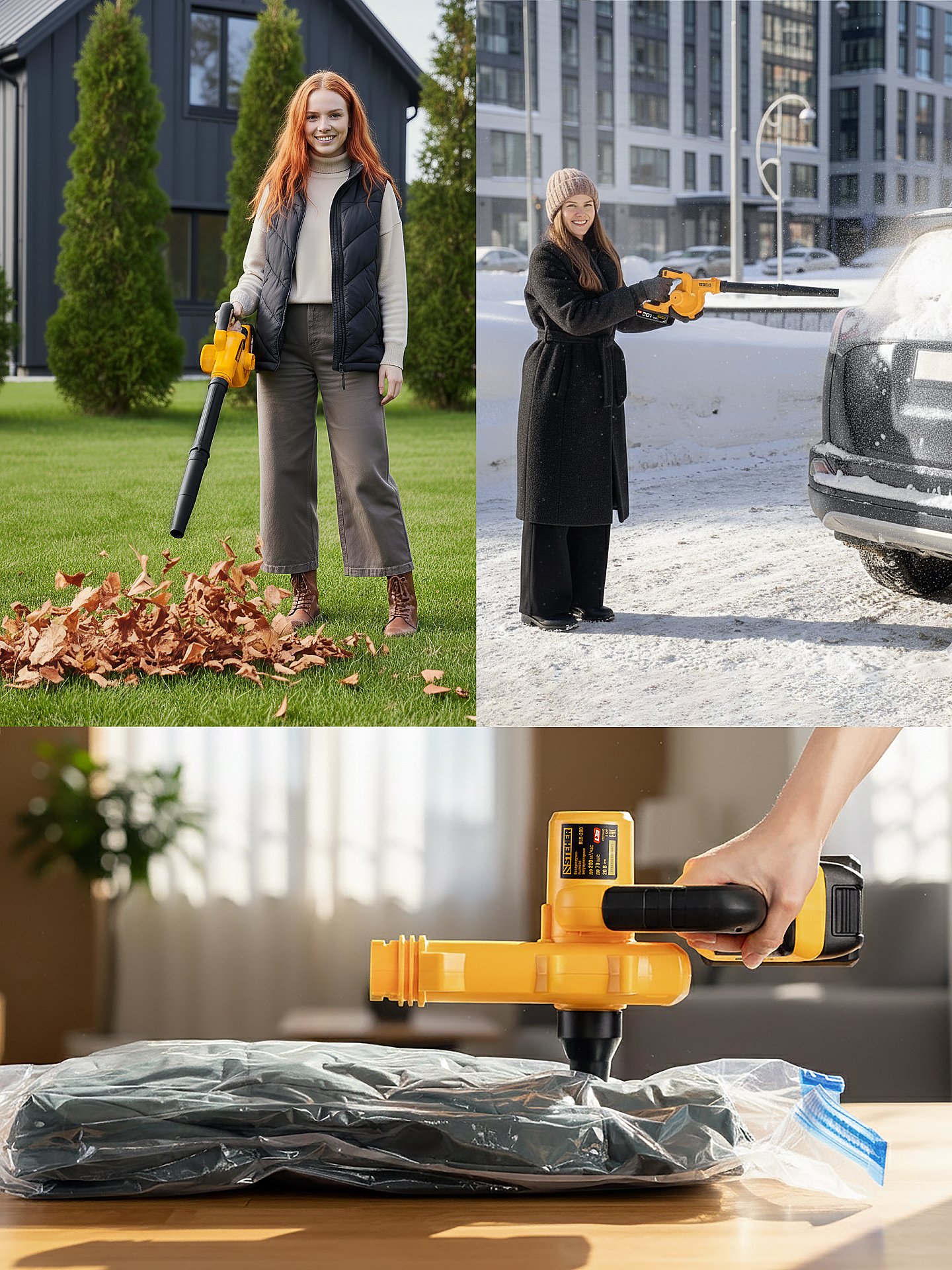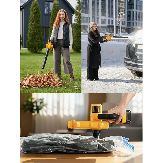 Легкая и компактная аккумуляторная воздуходувка-пылесос - универсальный инструмент, который прекрасно подходит для уборки на садовых участках, поддержания порядка в рабочей зоне, продувки компьютеров и бытовой техники от пыли, раздувания мангала, надувания и сдувания бассейнов, матрацев и других изделий. В зимнее она поможет очистить машину от снега. В комплект входят мешок для мусора, шланг и специальные насадки.Применение