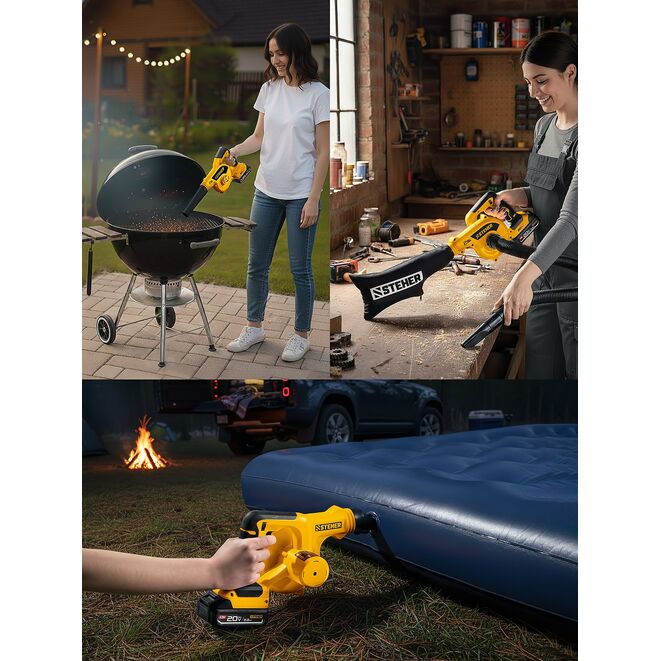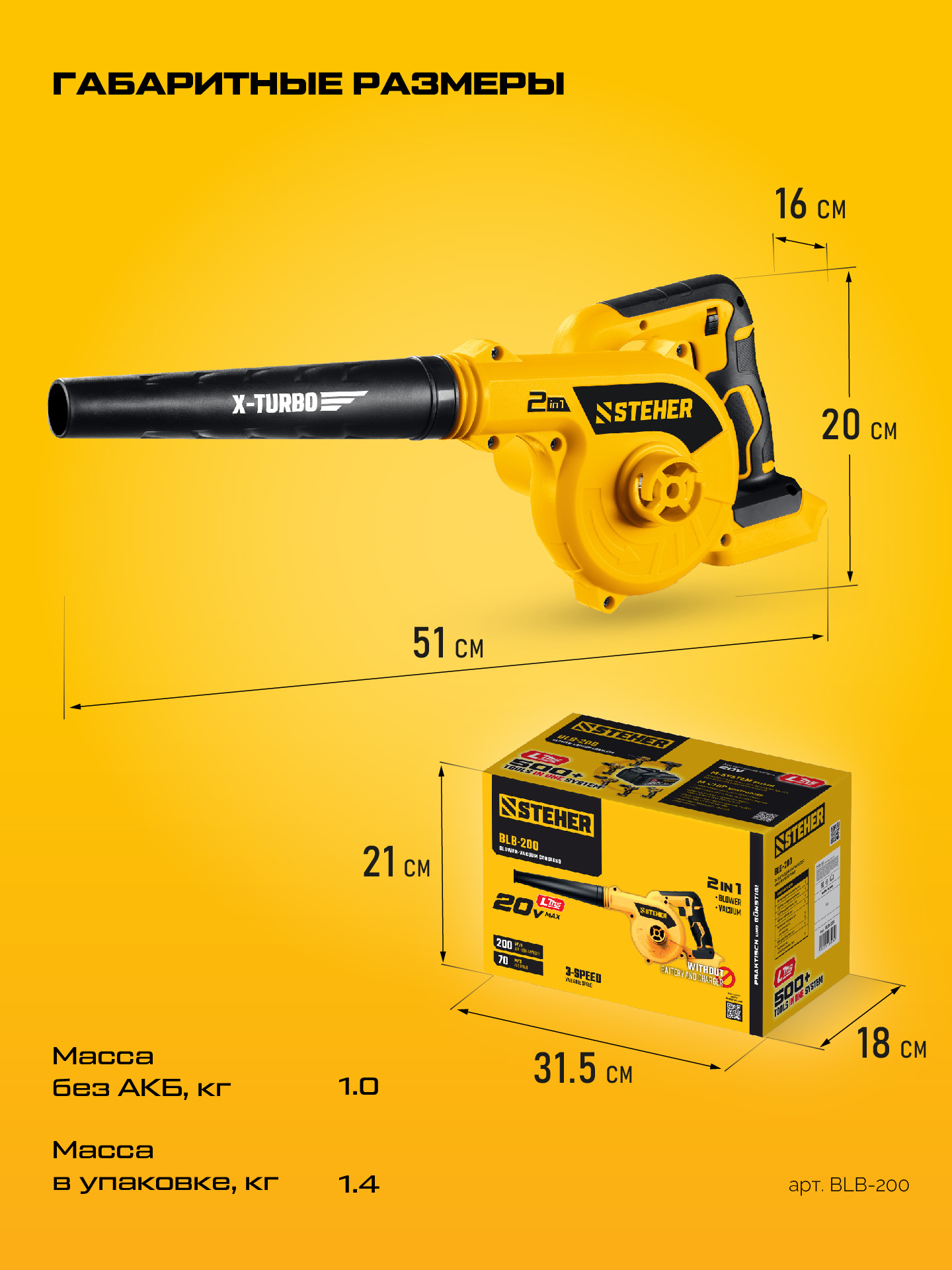 Воздуходувка-пылесос аккумуляторная STEHER BLB-200, предназначена для уборки листьев, травы и мелкого мусора на садово-парковых участках, стружки и пыли в рабочей зоне. Совмещает в себе функцию обдува и всасывания. Для работы в режиме пылесоса к изделию крепятся мешок для мусора и специальные насадки (входят в комплект). Также возможна работа в режиме насоса для накачивания и скачивания надувных изделий (детских бассейнов, принадлежностей для плавания, матрацев, кресел и т. д.)Характеристики STEHER BLB-200: