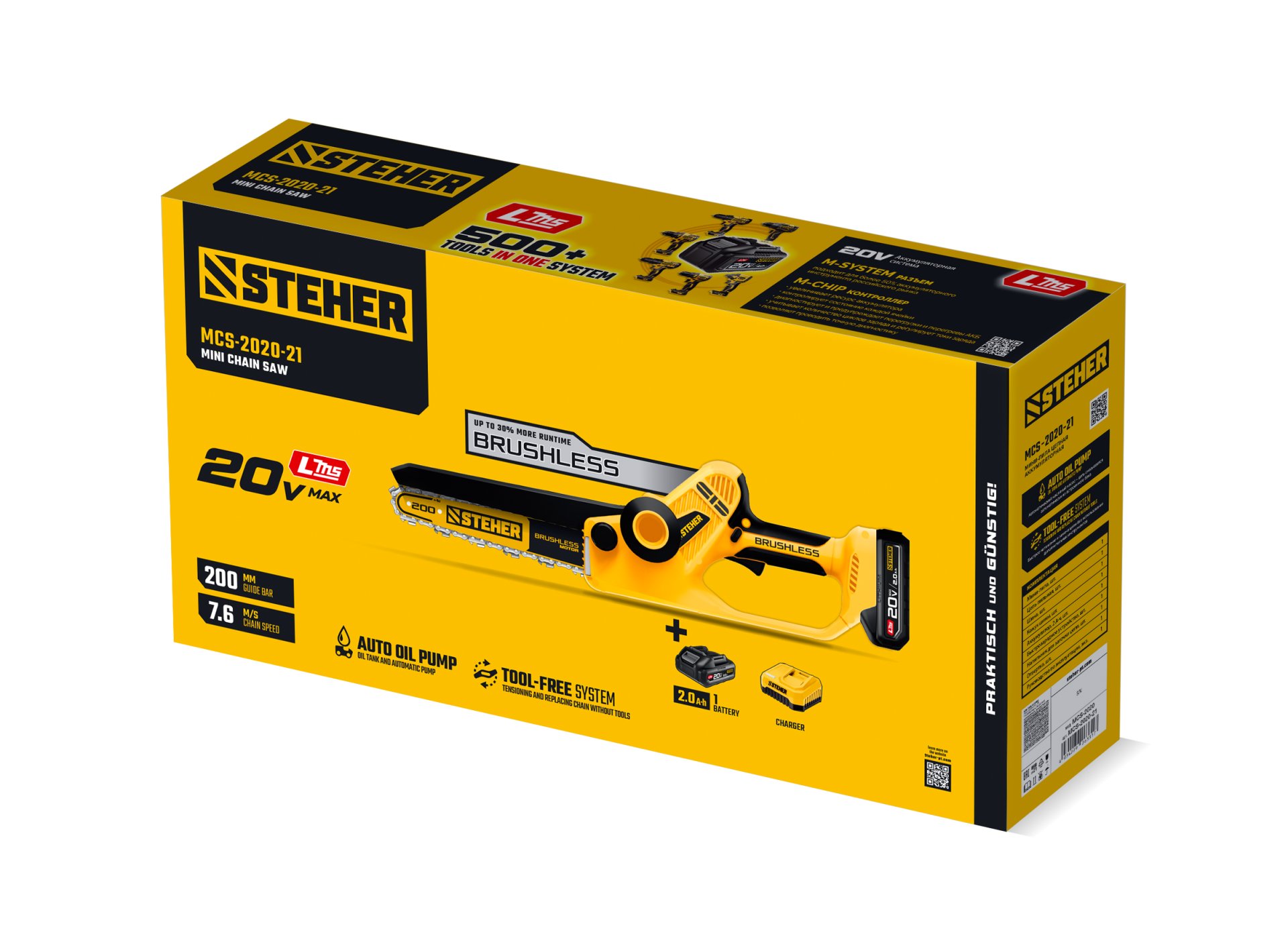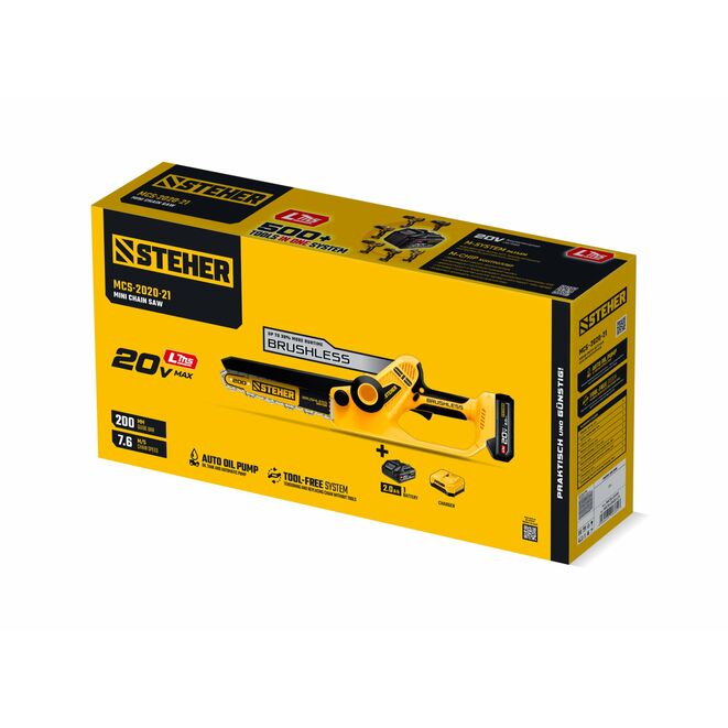 STEHER 20 В, 200 мм шина, 1 АКБ LMS (2 Ач), мини-пила цепная аккумуляторная (MCS-2020-21)