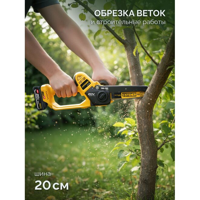 Аккумуляторная цепная мини-пила STEHER MCS-2020-21, предназначена для пиления досок, бруса, стволов различных пород дерева, обрезки сучьев и ухода за садовыми деревьями (с приводом режущего инструмента от электрического двигателя).Характеристики STEHER MCS-2020-21:
