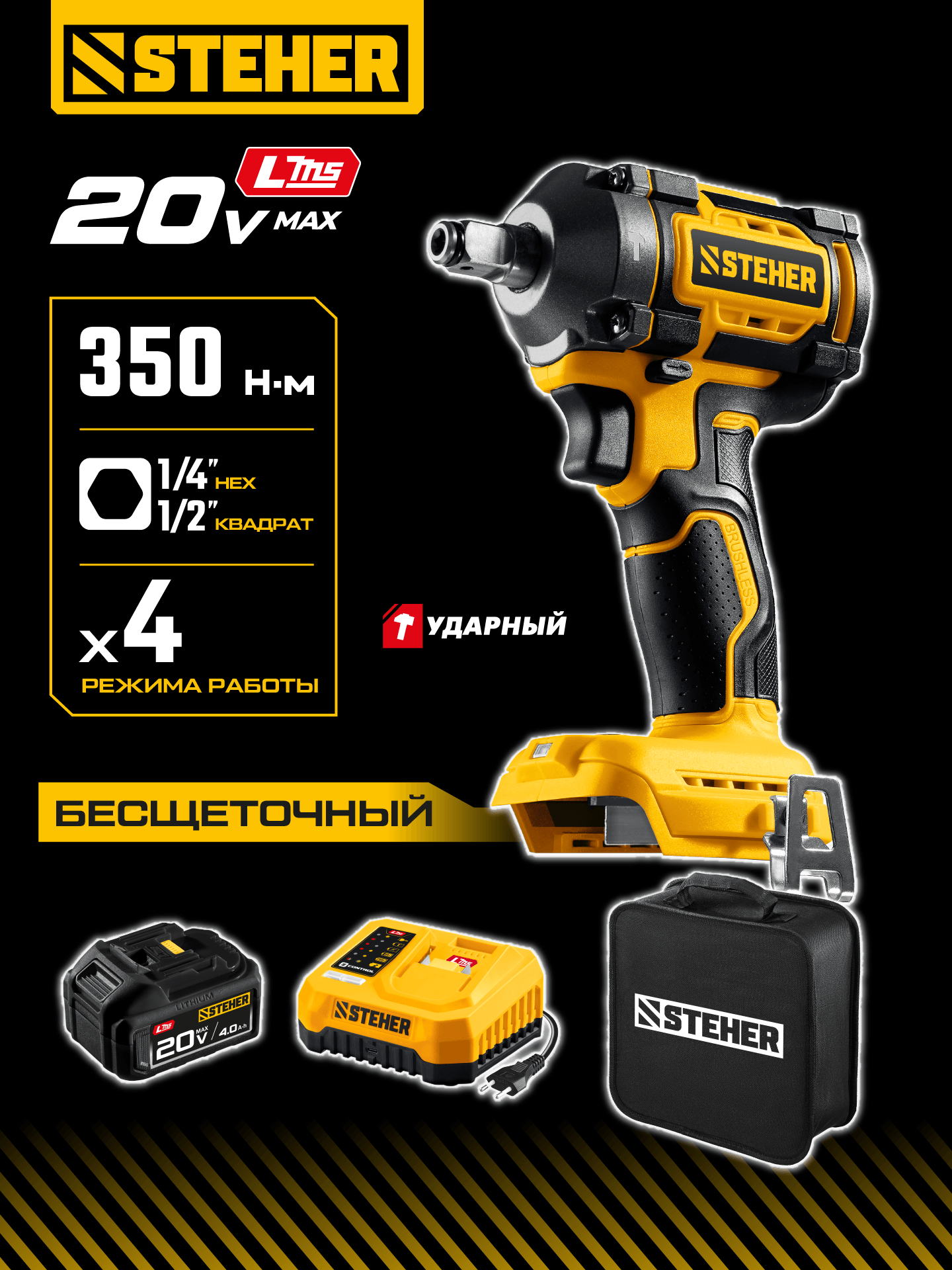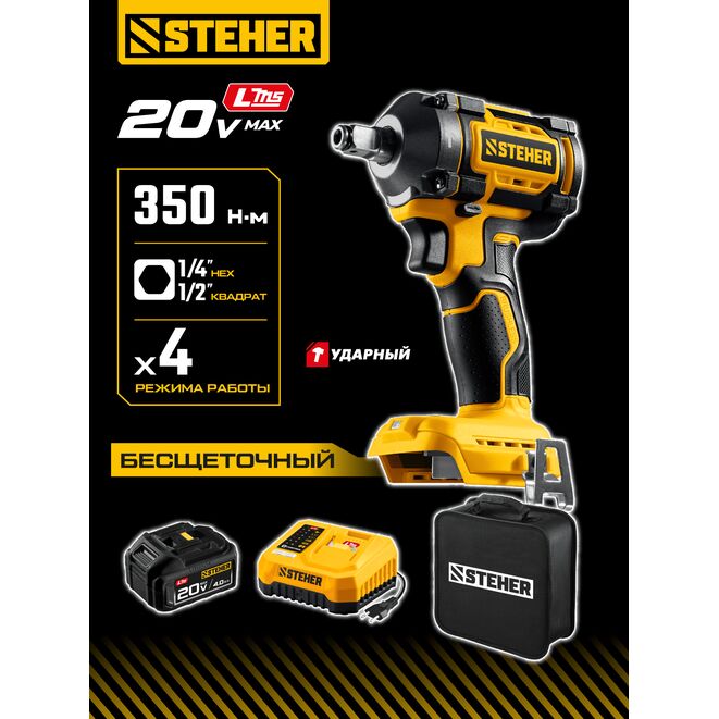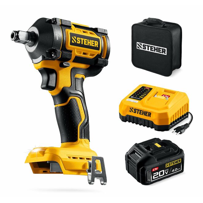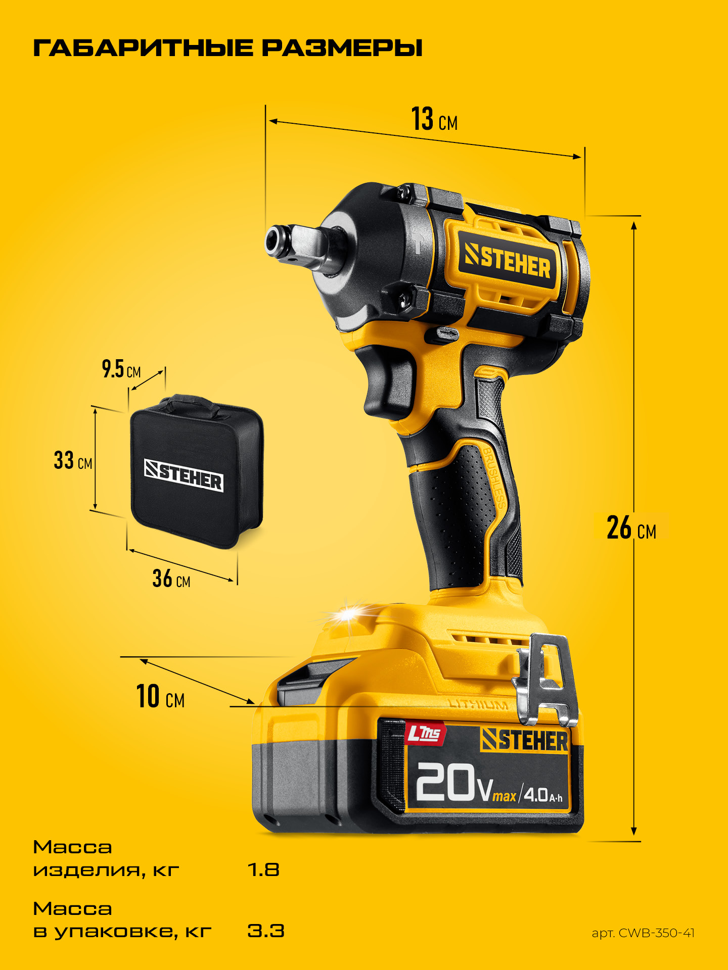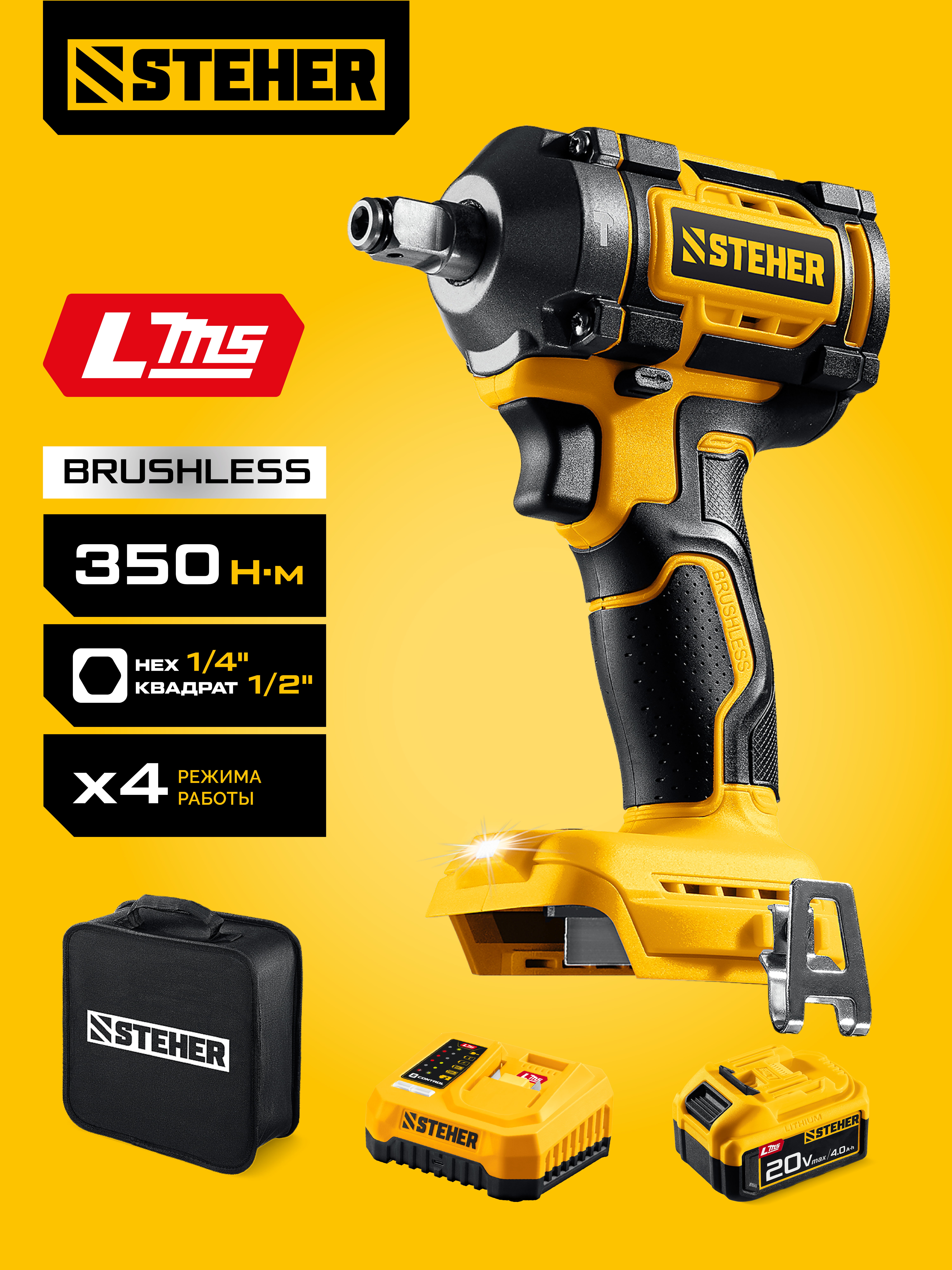 STEHER 20 В, 350 Н·м, 1 АКБ LMS (4 А·ч), бесщеточный ударный гайковерт, сумка (CWB-350-41)