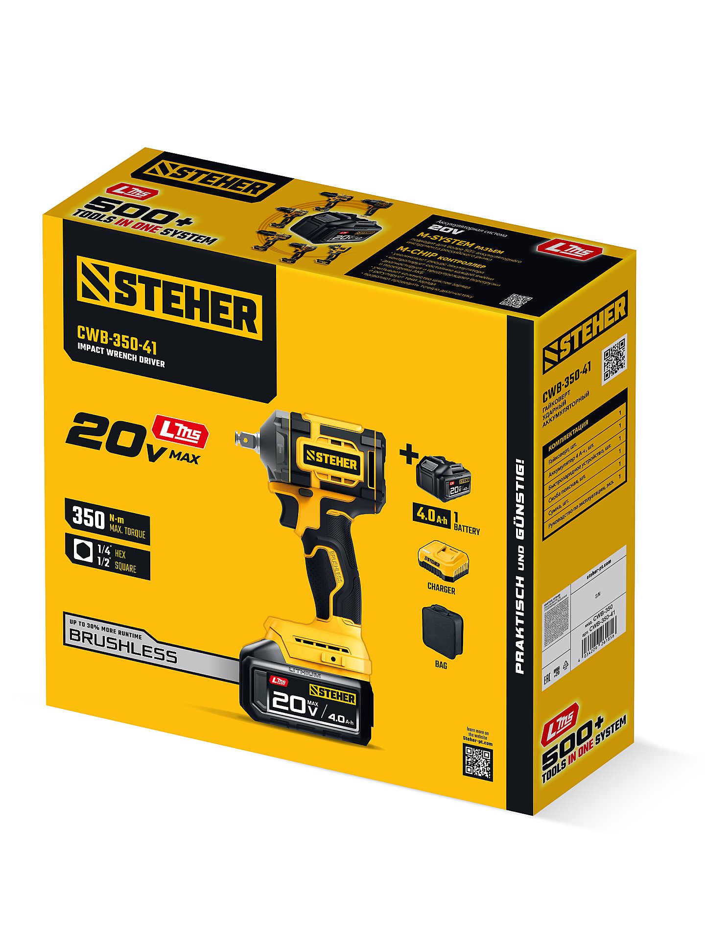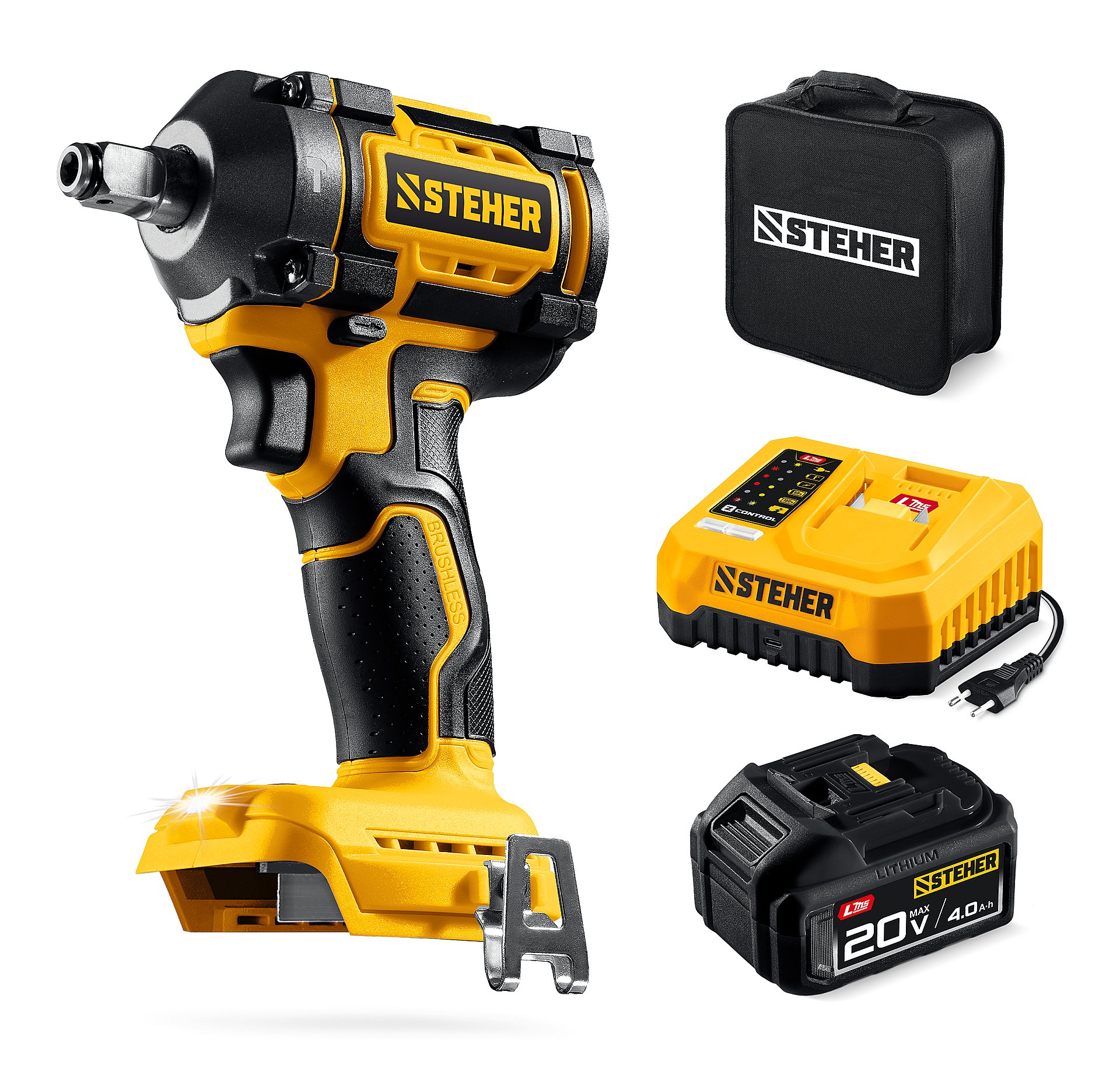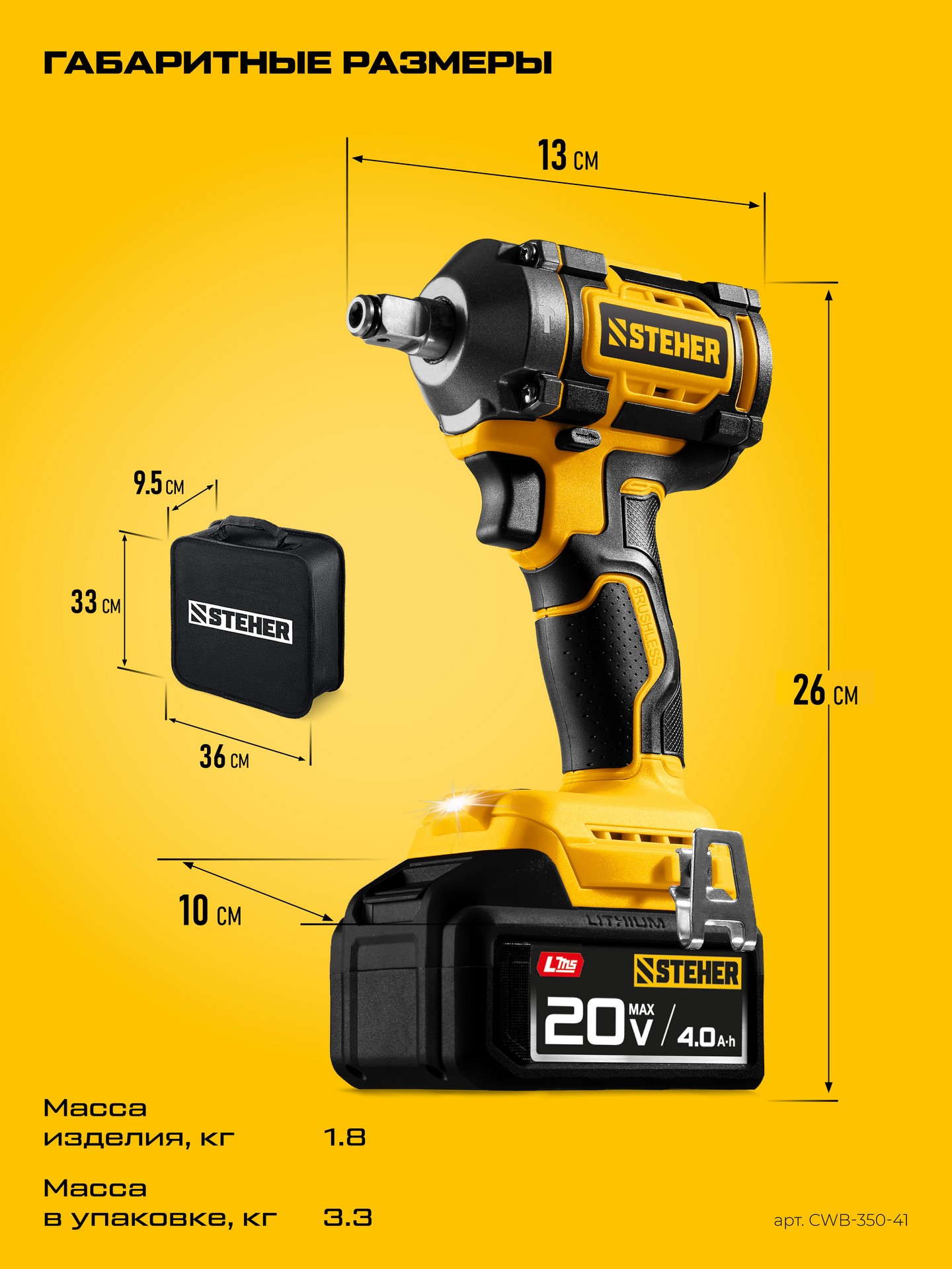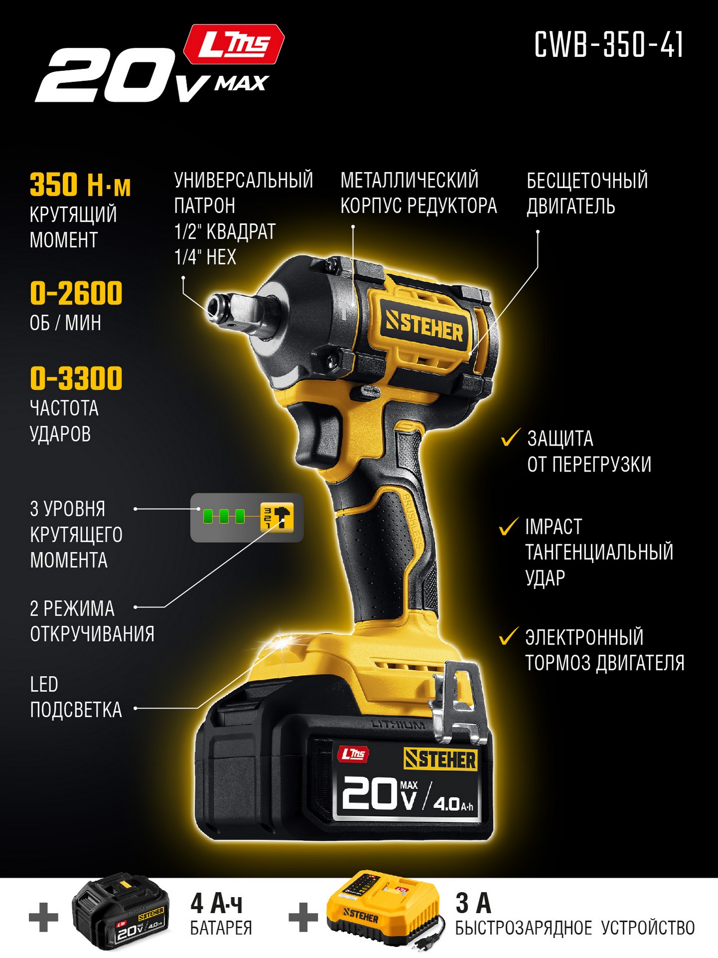 STEHER 20 В, 350 Н·м, 1 АКБ LMS (4 А·ч), бесщеточный ударный гайковерт, сумка (CWB-350-41)