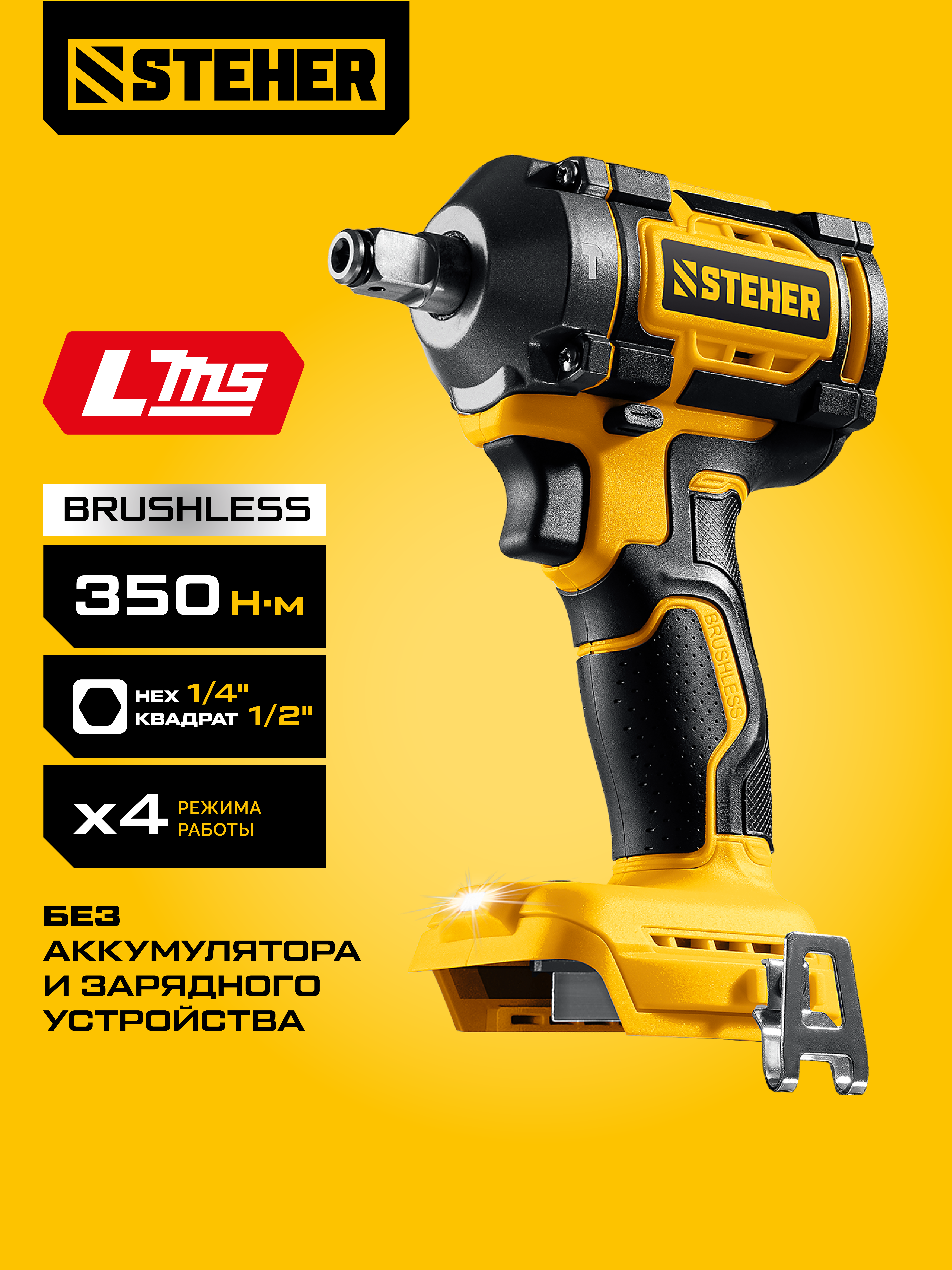Бесщеточный ударный гайковерт Steher с BRUSHLESS двигателем и максимальным крутящим моментом 350 Н∙м предназначен для фиксации резьбовых соединений размером до М18. Ударная функция с эффективным направлением удара обеспечивает легкое заворачивание без лишней нагрузки на кисть оператора. Модель без АКБ и БЗУ позволяет сэкономить на покупке при наличии батарей системы LMSПрименение