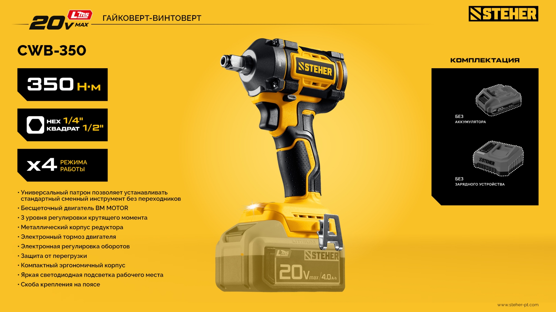 Гайковерт STEHER CWB-350, предназначен для заворачивания/отворачивания крепежа (при сборке/разборке металлических конструкций, снятии/установке колес автомобиля и т.д.). Экономия до 70% стоимости инструмента при наличии аккумуляторов платформы. Незаменимый инструмент для крупного крепежа. Значительный крутящий момент для сложных работ. Ударная функция позволяет заворачивать крепеж большого диаметра и отворачивать приржавевшие метизы. Бесщеточный двигатель обладает целым рядом преимуществ по сравнению с обычным щеточным двигателем: высокий крутящий момент – в 2 раза выше, чем у аналогичного щеточного двигателя; высокий КПД благодаря максимально эффективному преобразованию электромагнитной энергии в механическую (ввиду отсутствия перекоммутаций). Низкое энергопотребление, вследствие чего изделие работает до 4 раз дольше на одном заряде батареию. Высокая степень защиты двигателя благодаря интеллектуальному управлению.Характеристики STEHER CWB-350: