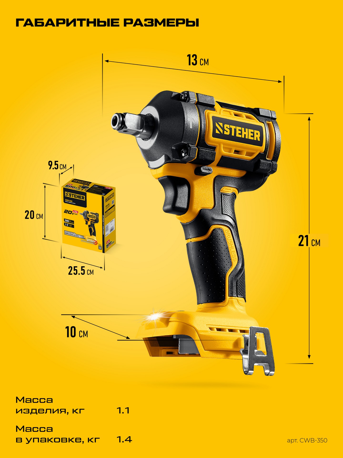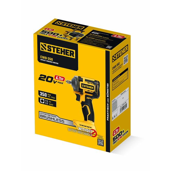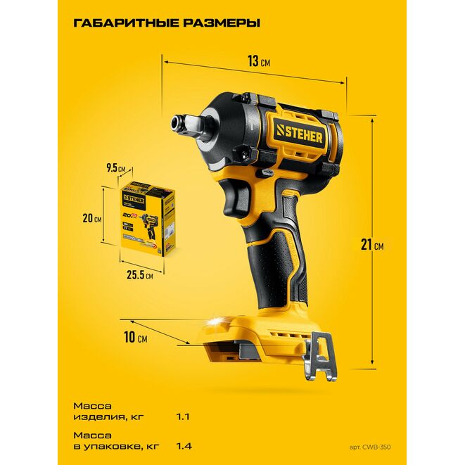 Гайковерт STEHER CWB-350, предназначен для заворачивания/отворачивания крепежа (при сборке/разборке металлических конструкций, снятии/установке колес автомобиля и т.д.). Экономия до 70% стоимости инструмента при наличии аккумуляторов платформы. Незаменимый инструмент для крупного крепежа. Значительный крутящий момент для сложных работ. Ударная функция позволяет заворачивать крепеж большого диаметра и отворачивать приржавевшие метизы. Бесщеточный двигатель обладает целым рядом преимуществ по сравнению с обычным щеточным двигателем: высокий крутящий момент – в 2 раза выше, чем у аналогичного щеточного двигателя; высокий КПД благодаря максимально эффективному преобразованию электромагнитной энергии в механическую (ввиду отсутствия перекоммутаций). Низкое энергопотребление, вследствие чего изделие работает до 4 раз дольше на одном заряде батареию. Высокая степень защиты двигателя благодаря интеллектуальному управлению.Характеристики STEHER CWB-350: