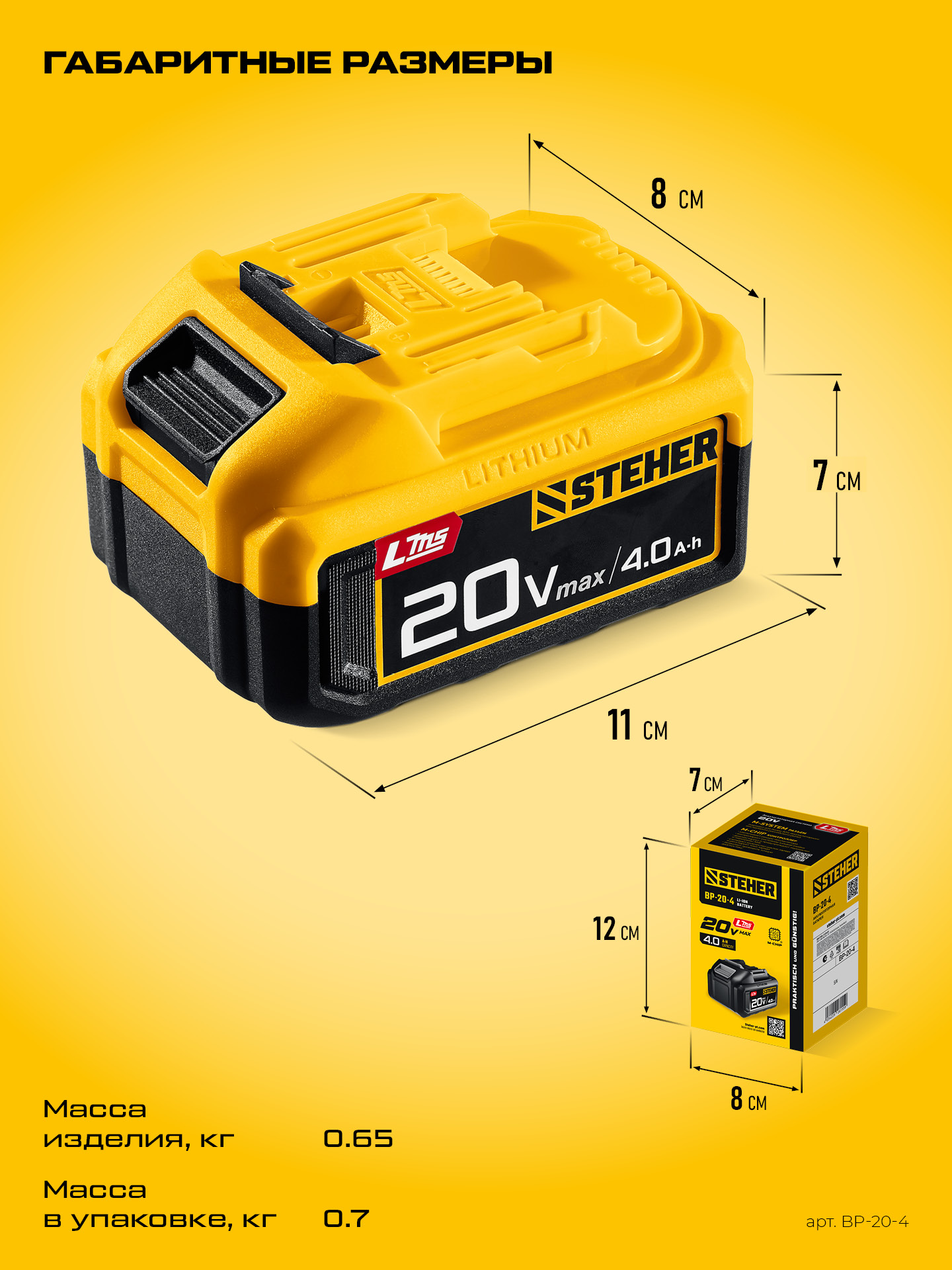 Аккумуляторная батарея STEHER BP-20-4, предназначена для обеспечения питания аккумуляторного инструмента.Характеристики STEHER BP-20-4: