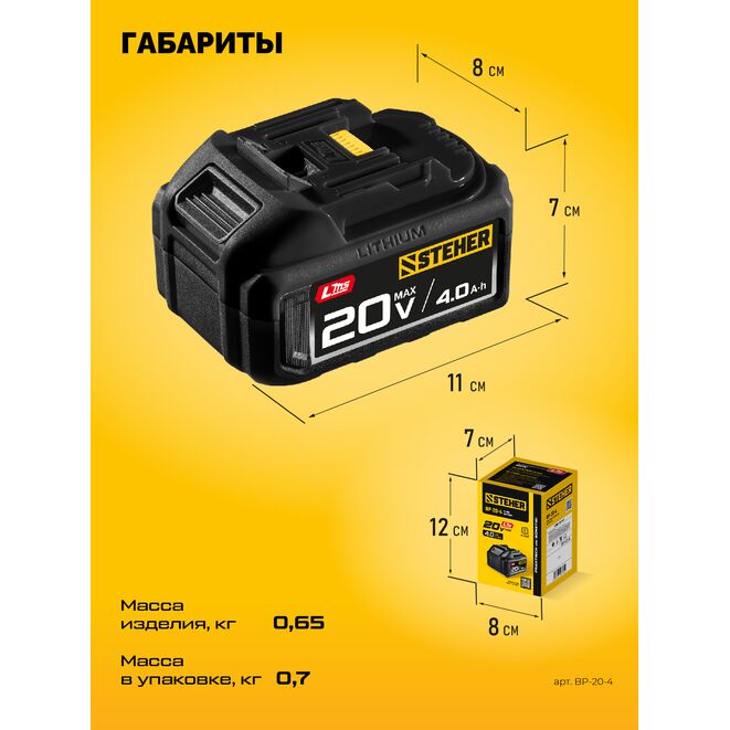 Аккумуляторная батарея STEHER BP-20-4, предназначена для обеспечения питания аккумуляторного инструмента.Характеристики STEHER BP-20-4: