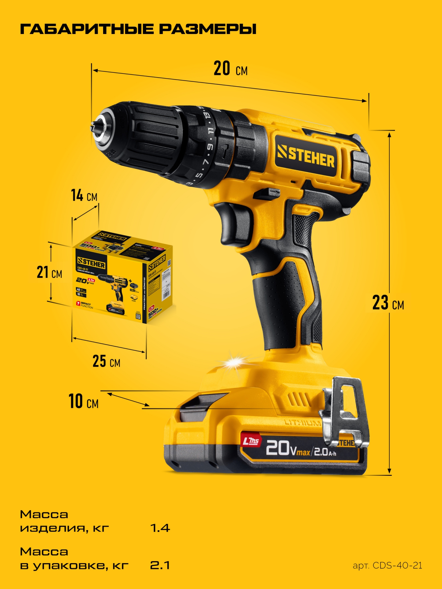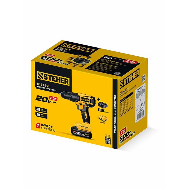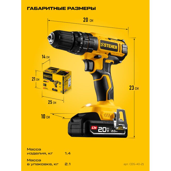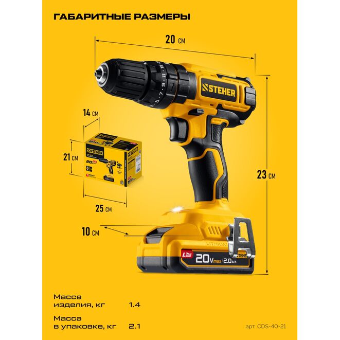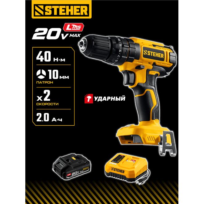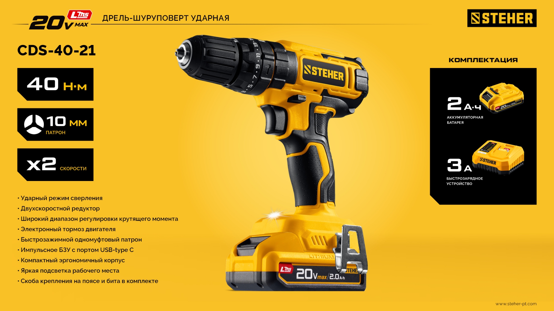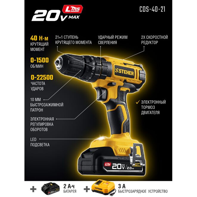 STEHER 20 В, 40 Н·м, 1 АКБ LMS (2 А·ч), ударная дрель-шуруповерт (CDS-40-21)