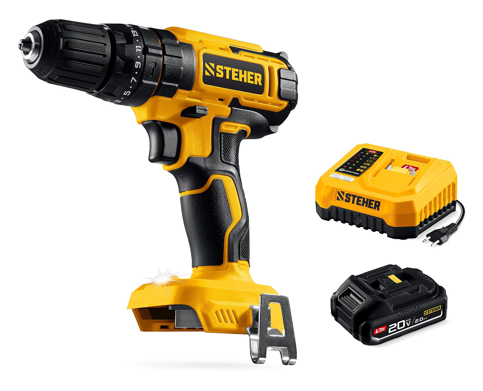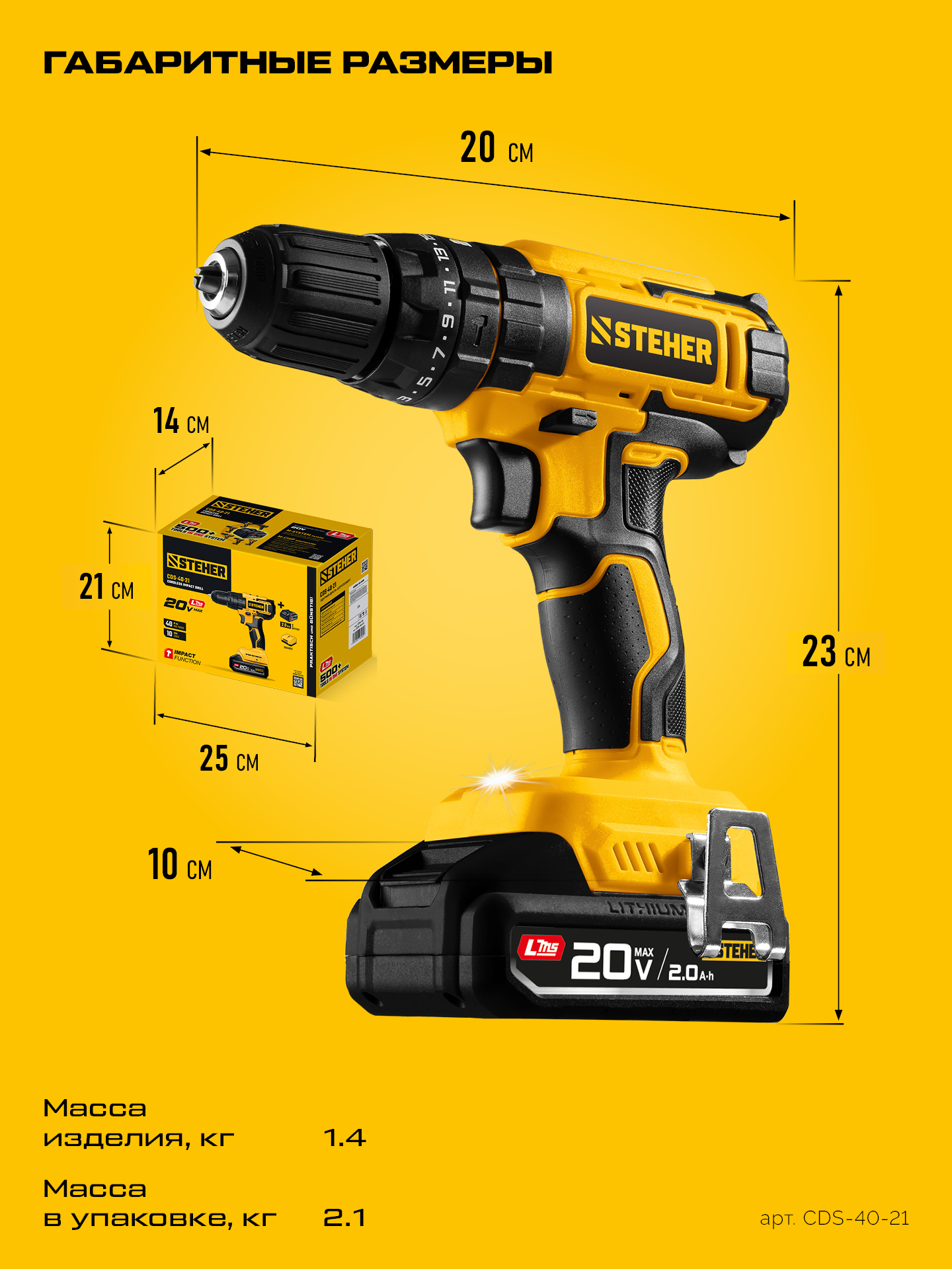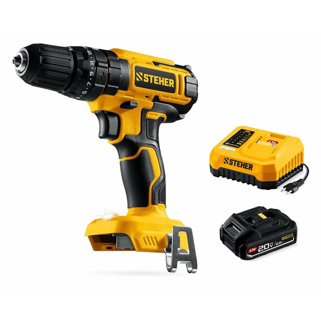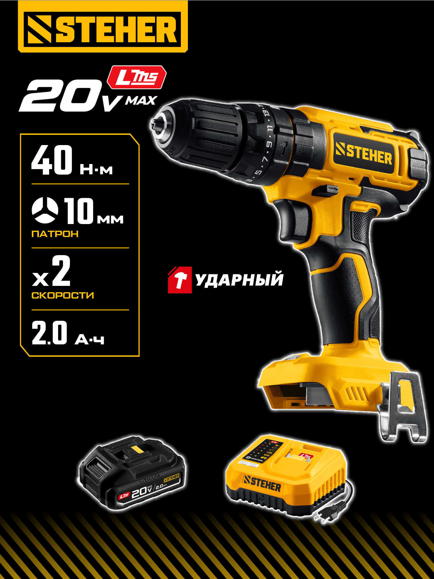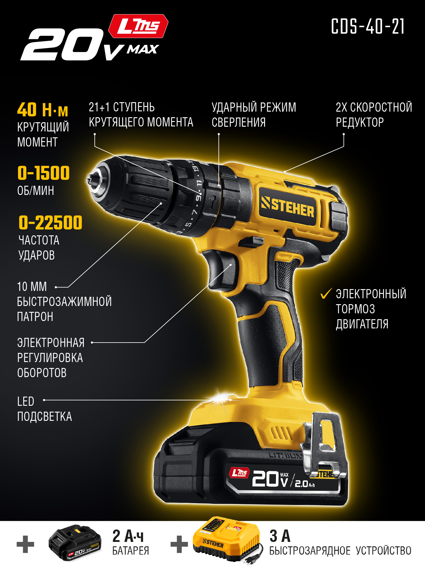 STEHER 20 В, 40 Н·м, 1 АКБ LMS (2 А·ч), ударная дрель-шуруповерт (CDS-40-21)