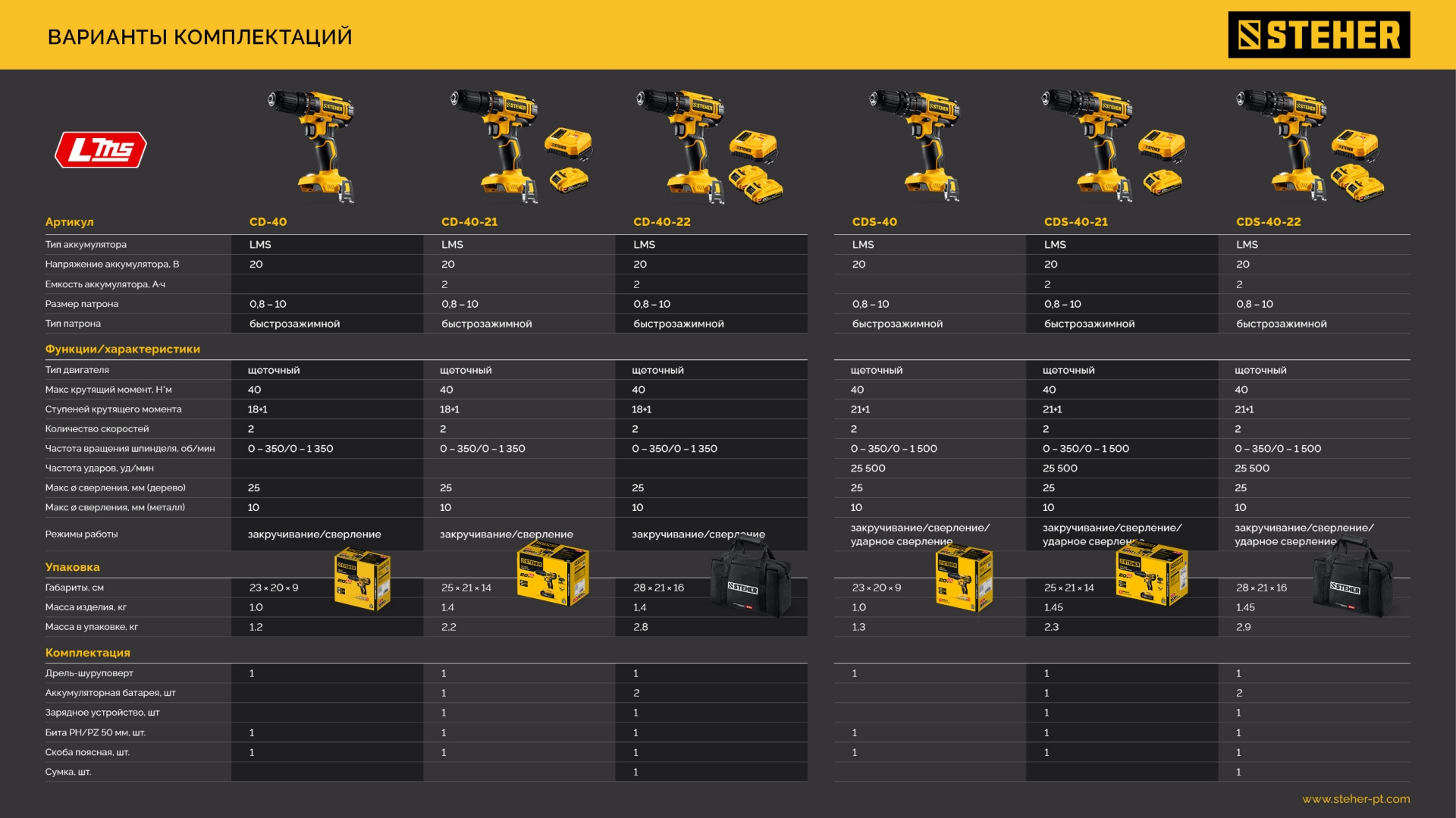 Принадлежности для STEHER 20 В, 40 Н·м, 1 АКБ LMS (2 А·ч), ударная дрель-шуруповерт (CDS-40-21):
