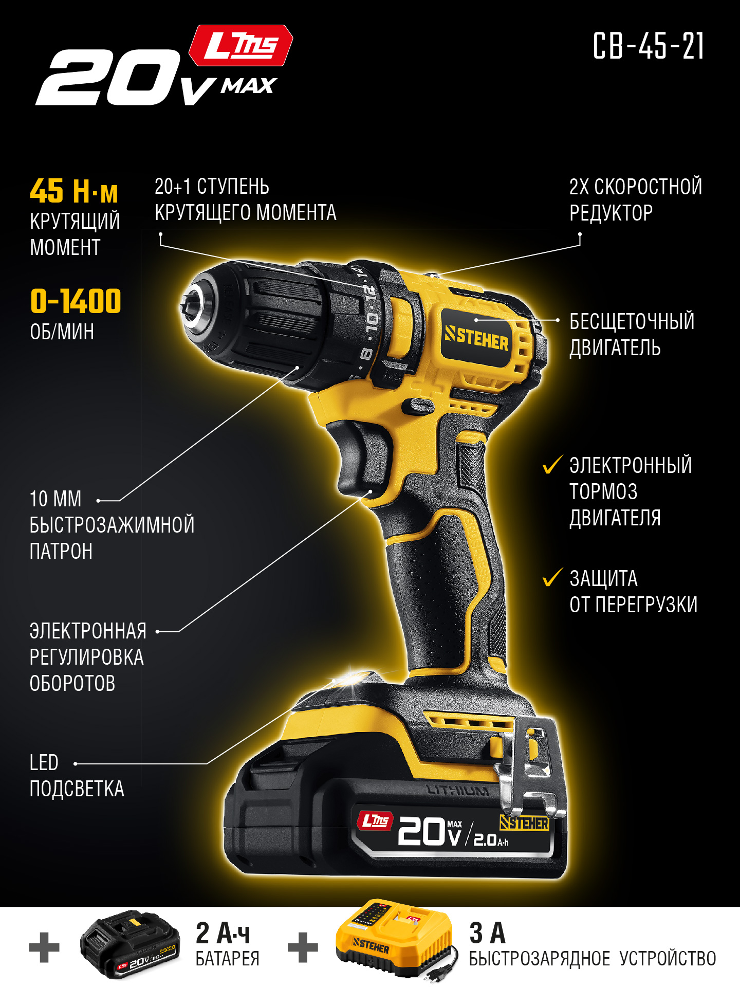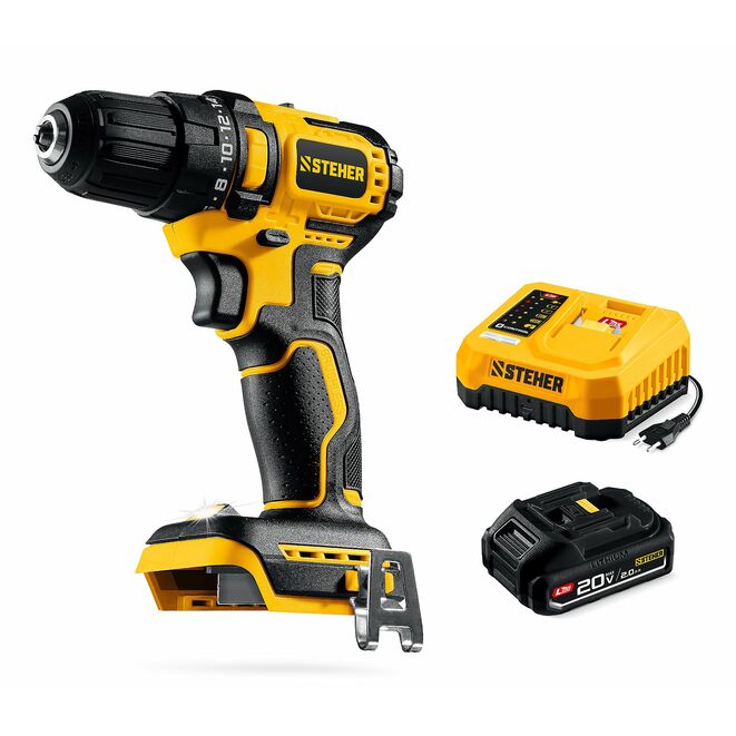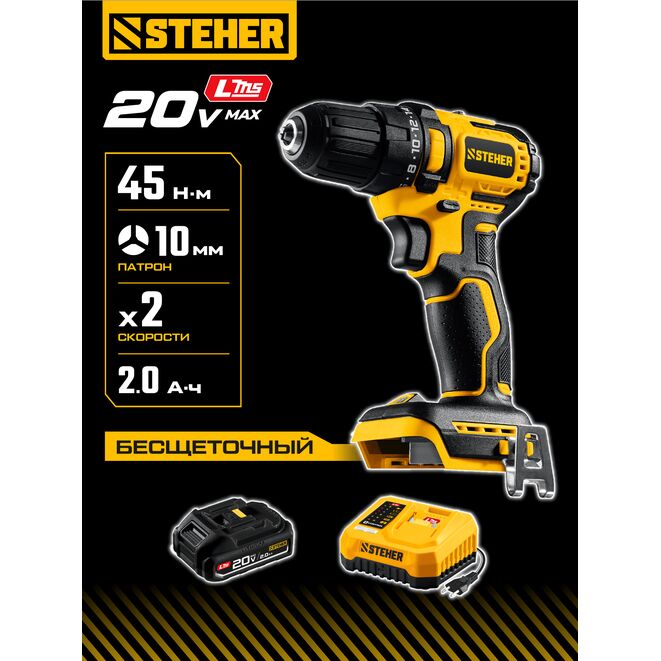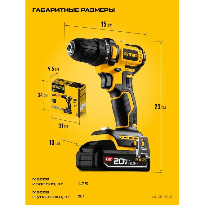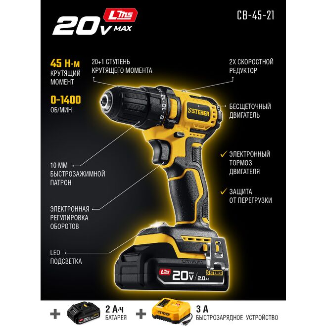 STEHER 20 В, 45 Н·м, 1 АКБ LMS (2 А·ч), бесщеточная дрель-шуруповерт (CB-45-21)