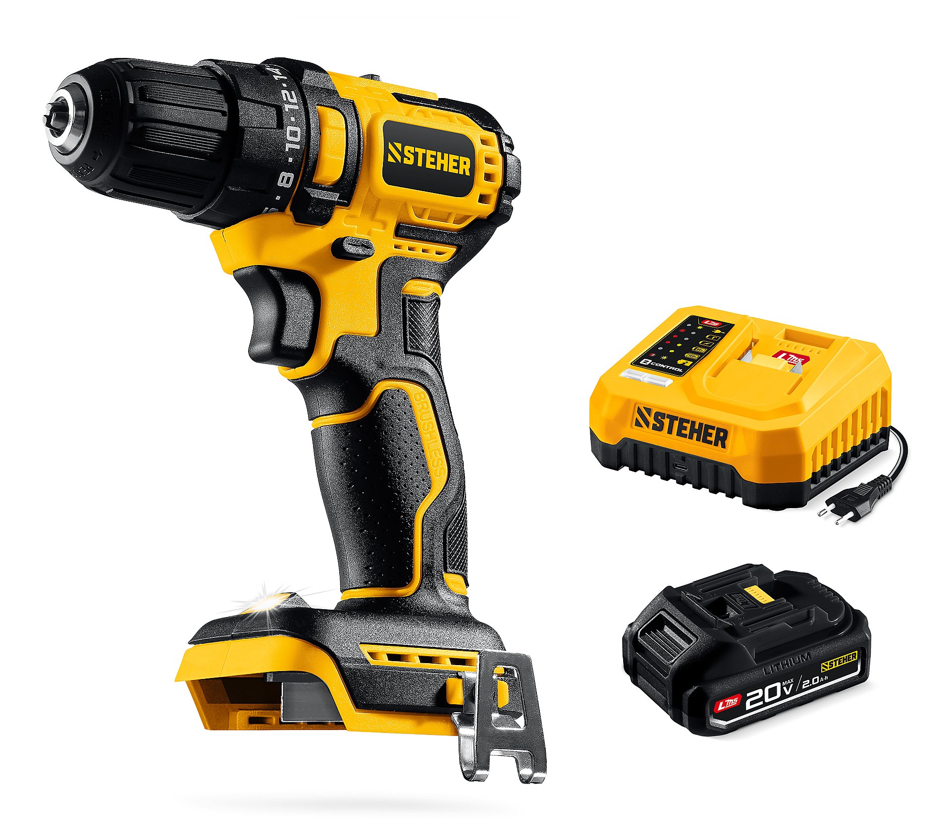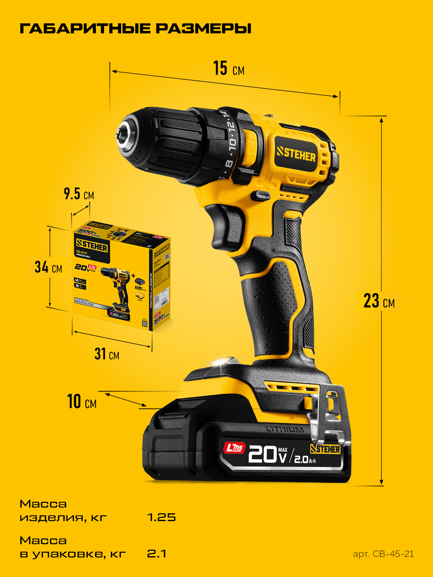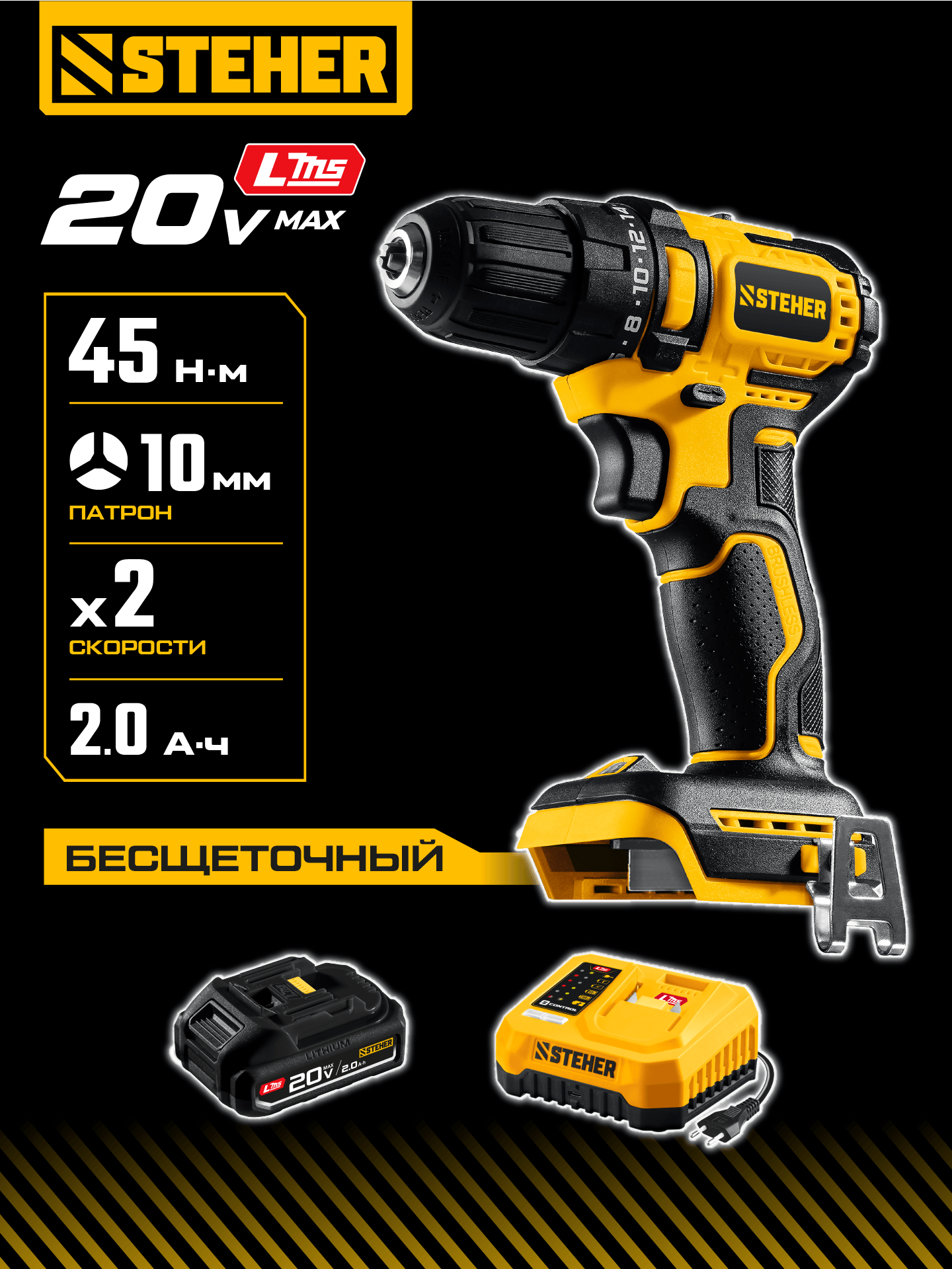 STEHER 20 В, 45 Н·м, 1 АКБ LMS (2 А·ч), бесщеточная дрель-шуруповерт (CB-45-21)