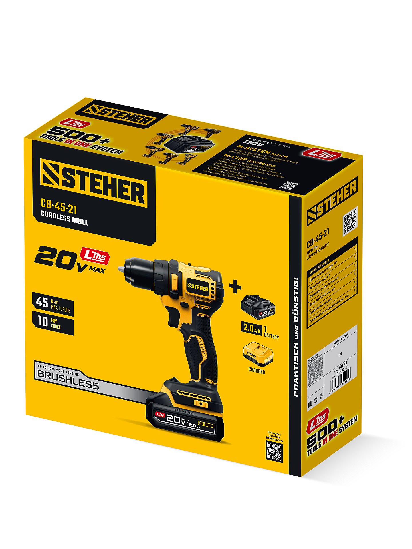 Аккумуляторная дрель-шуруповерт CB-45-21, предназначена для сверления отверстий в различных материалах (при установке сверла), а также для вкручивания/выкручивания шурупов, саморезов и винтов (при установке соответствующих бит). Экономия до 70% стоимости инструмента при наличии аккумуляторов платформы. Технологичный инструмент для эффективной работы. Бесщеточный двигатель Brushless обладает целым рядом преимуществ по сравнению с обычным щеточным двигателем: высокий крутящий момент – в 2 раза выше, чем у аналогичного щеточного двигателя; высокий КПД благодаря максимально эффективному преобразованию электромагнитной энергии в механическую (ввиду отсутствия перекоммутаций). Низкое энергопотребление, вследствие чего изделие работает до 4 раз дольше на одном заряде батареи и высокая степень защиты двигателя благодаря интеллектуальному управлению.Характеристики STEHER CB-45-21: