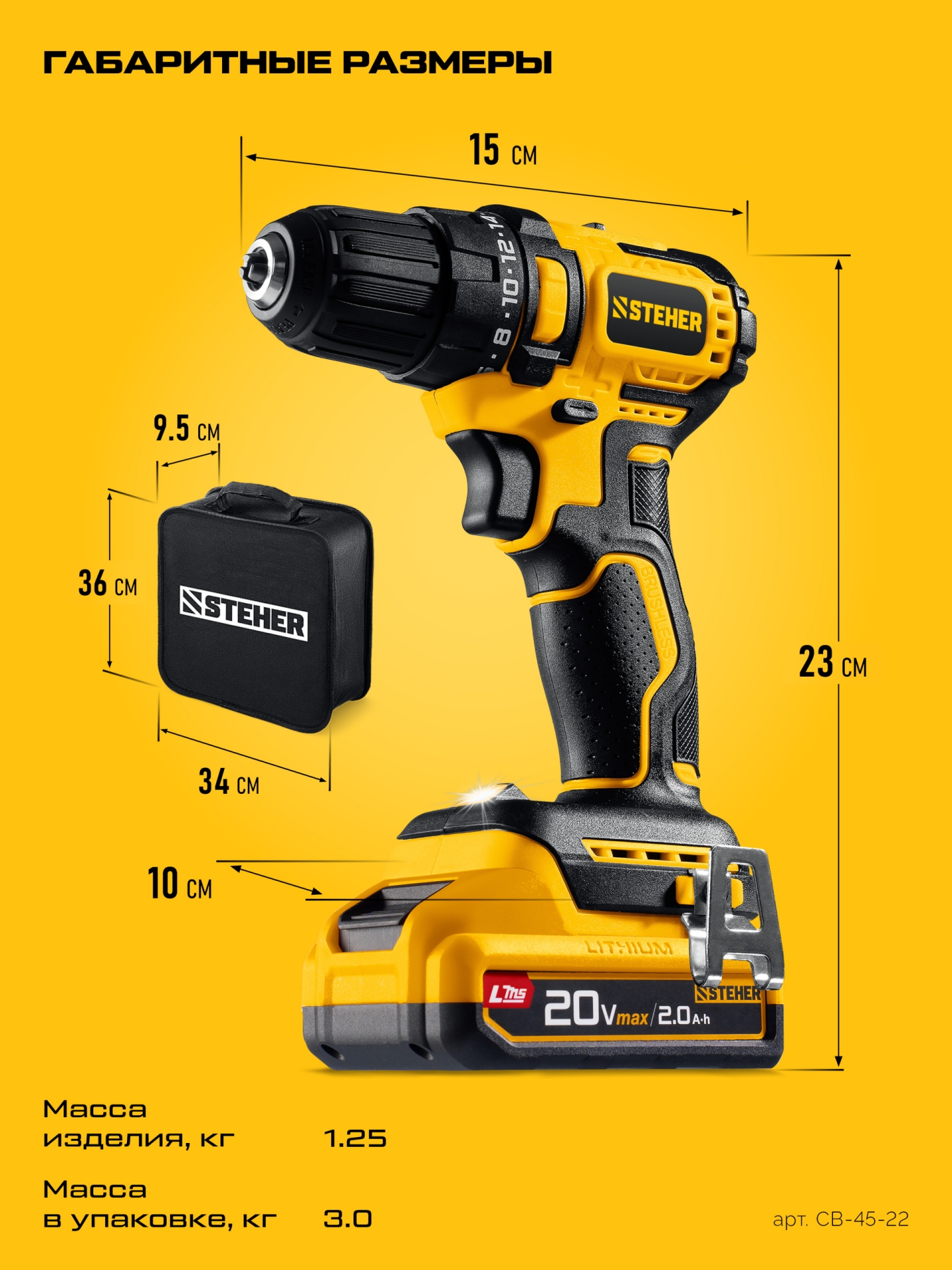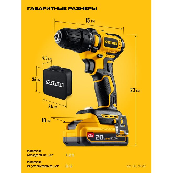 Принадлежности для STEHER 20 В, 45 Н·м, 2 АКБ LMS (2 А·ч), бесщеточная дрель-шуруповерт, сумка (CB-45-22):