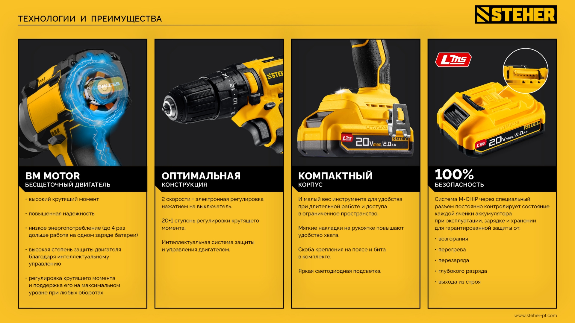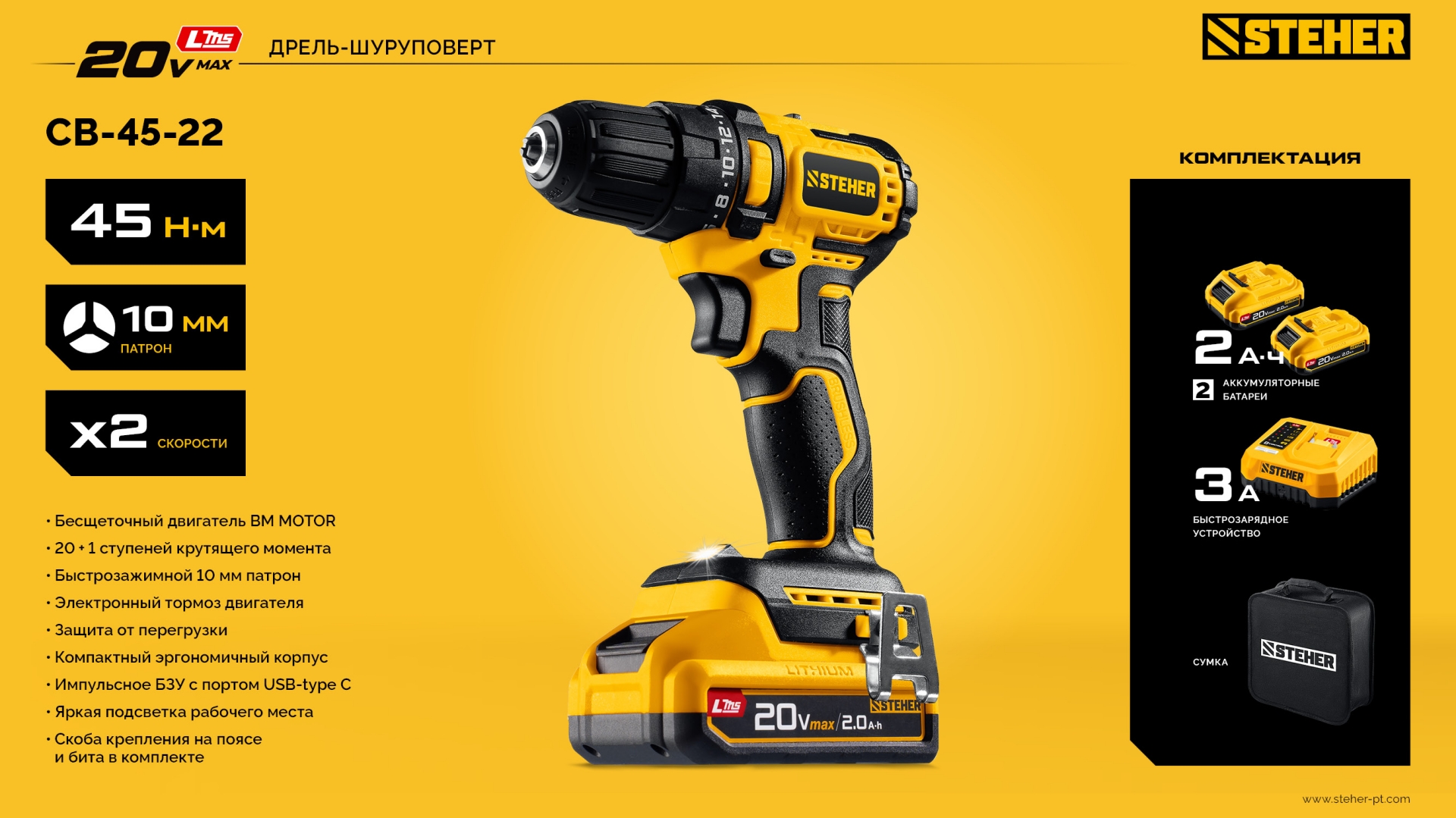 STEHER 20 В, 45 Н·м, 2 АКБ LMS (2 А·ч), бесщеточная дрель-шуруповерт, сумка (CB-45-22)