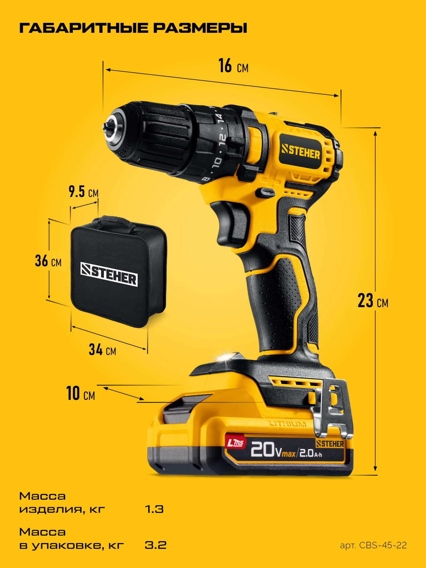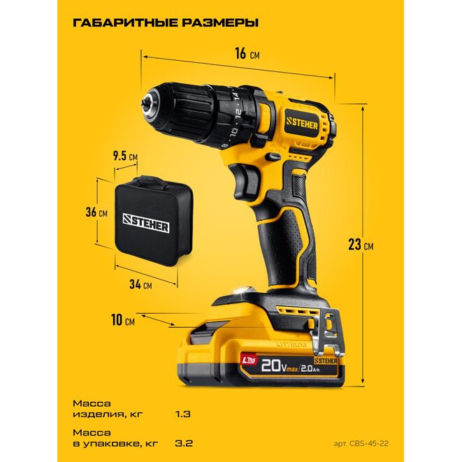 Принадлежности для STEHER 20 В, 45 Н·м, 2 АКБ LMS (2 А·ч), бесщеточная ударная дрель-шуруповерт, сумка (CBS-45-22):