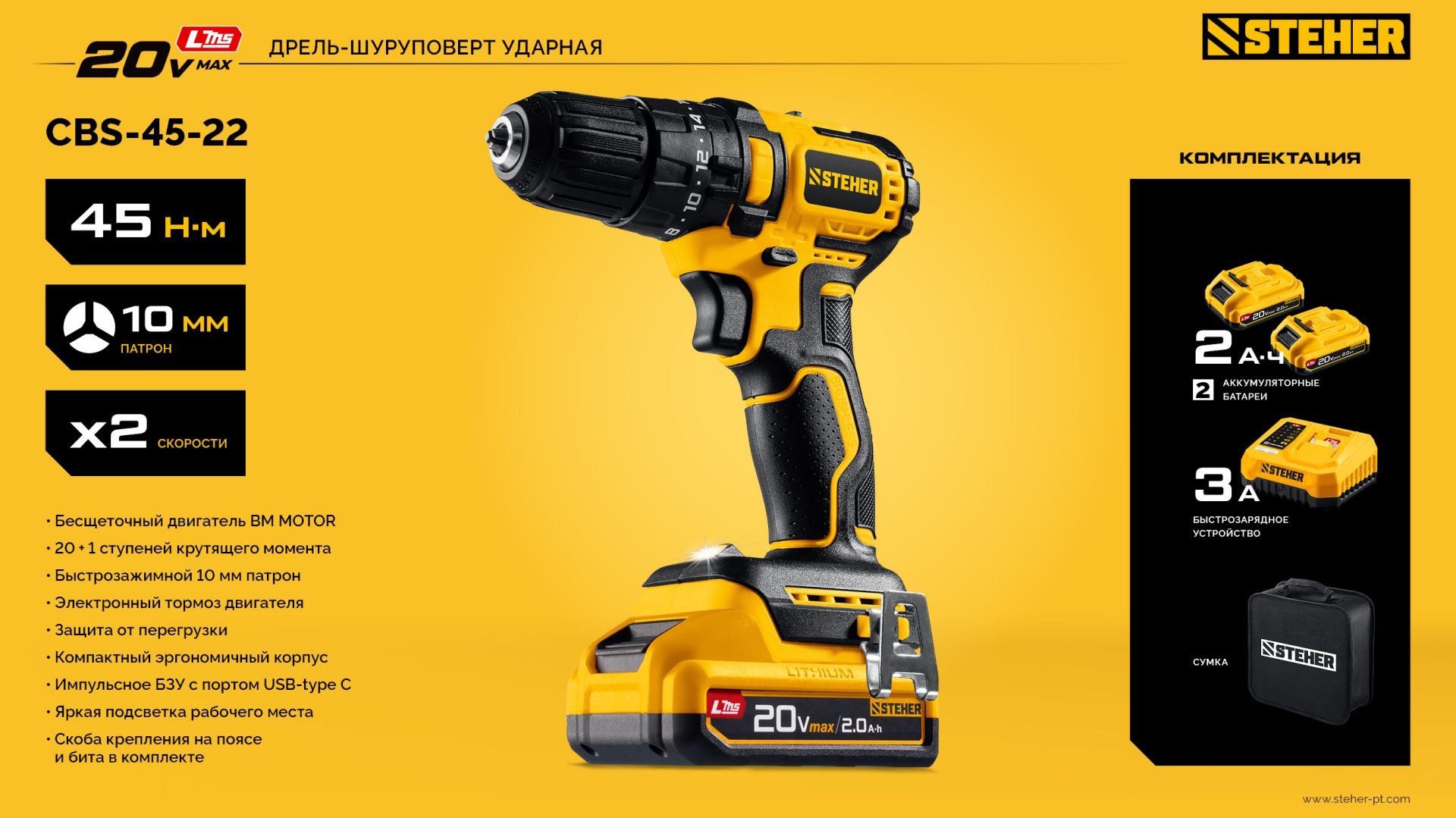 STEHER 20 В, 45 Н·м, 2 АКБ LMS (2 А·ч), бесщеточная ударная дрель-шуруповерт, сумка (CBS-45-22)