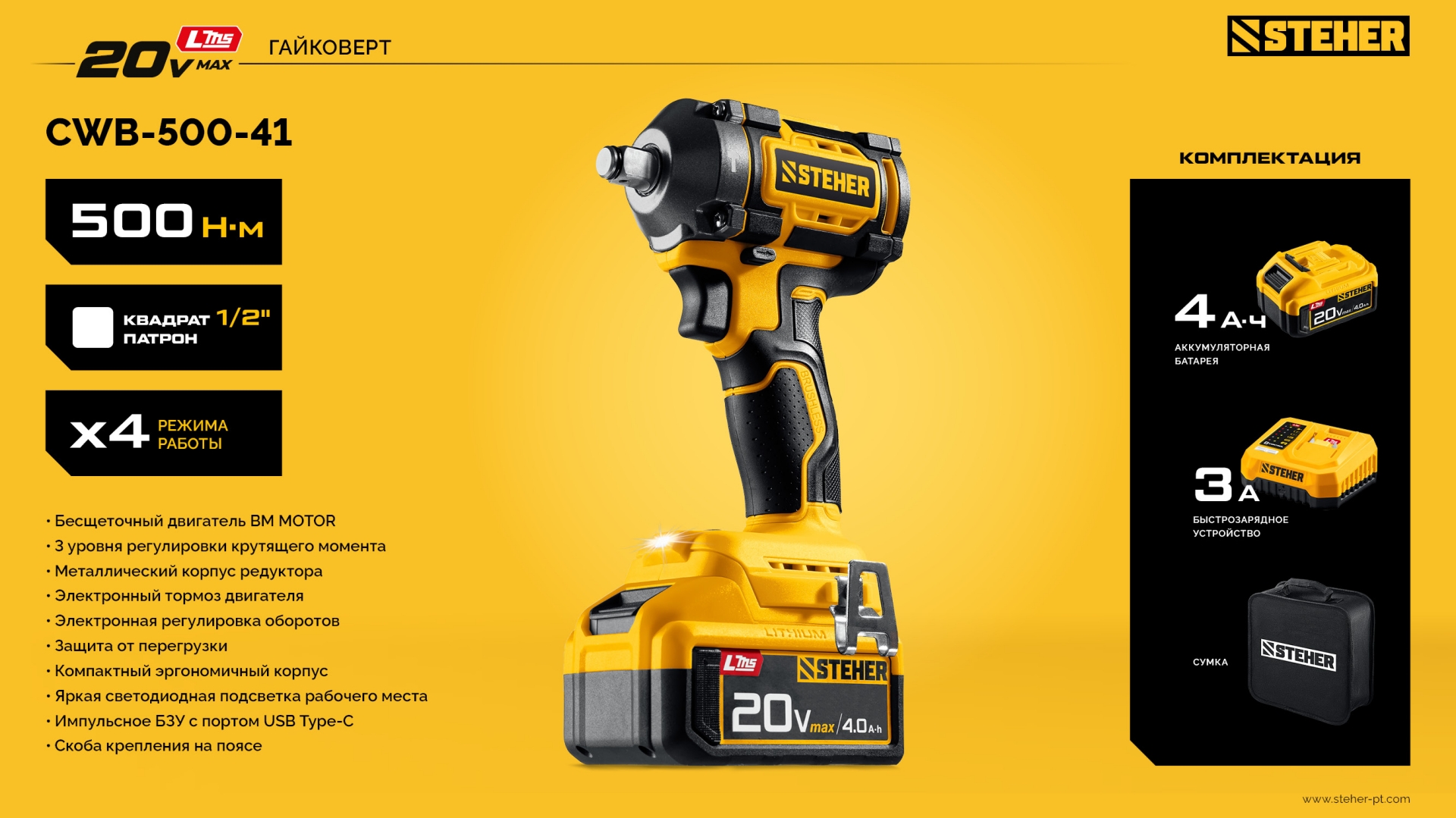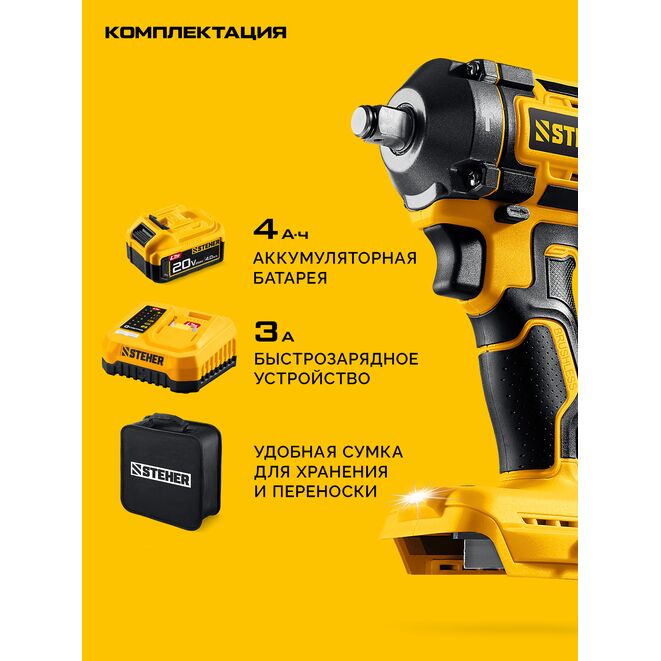 STEHER 20 В, 500 Н·м, 1 АКБ LMS (4 А·ч), бесщеточный ударный гайковерт, сумка (CWB-500-41)