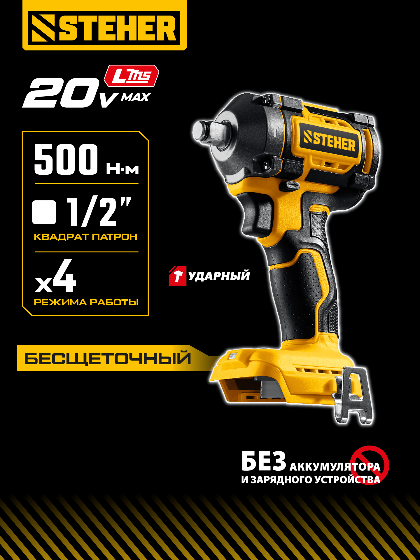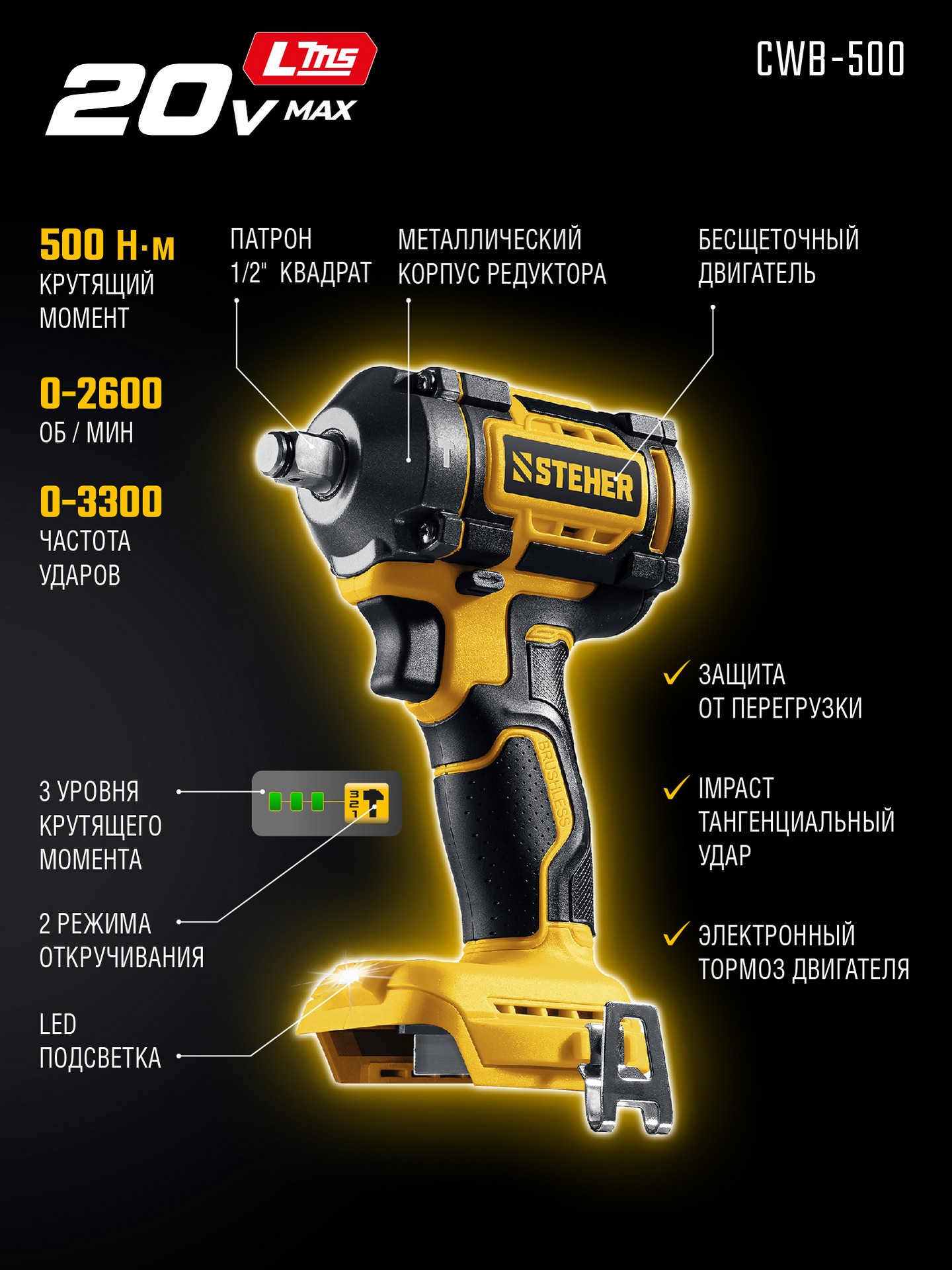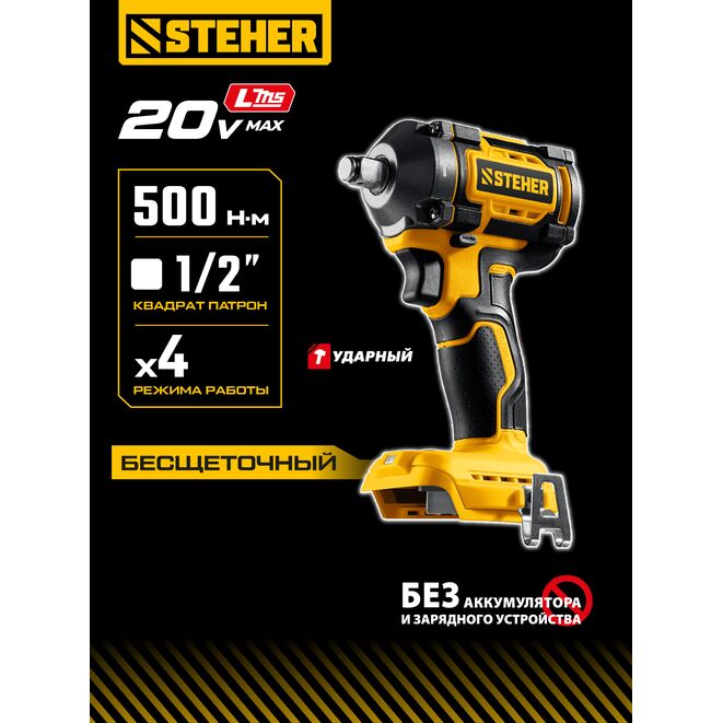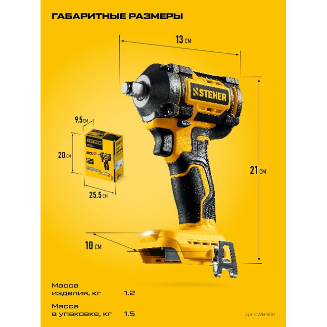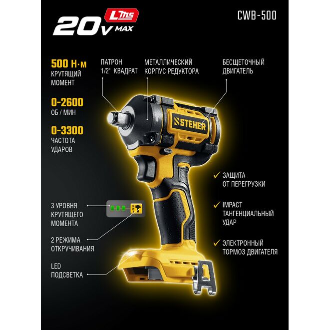 STEHER 20 В, 500 Н·м, без АКБ (LMS), бесщеточный ударный гайковерт (CWB-500)