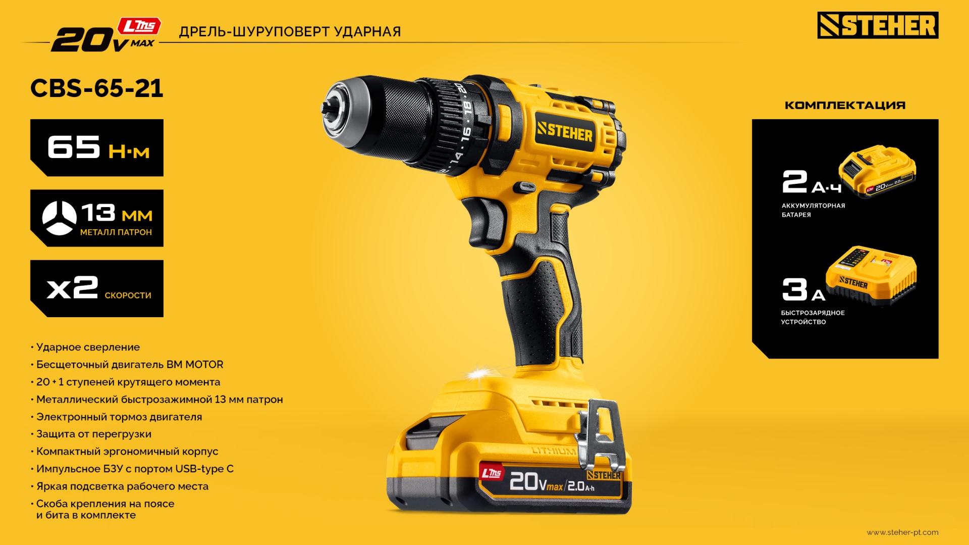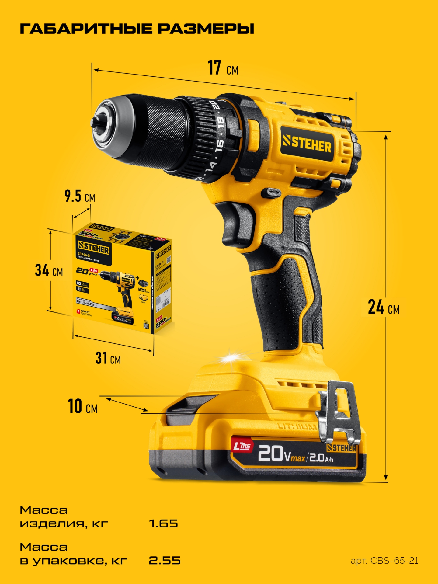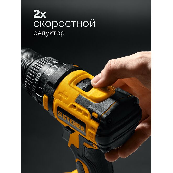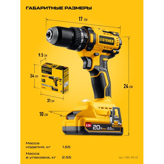STEHER 20 В, 65 Н·м, 1 АКБ LMS (2 А·ч), бесщеточная ударная дрель-шуруповерт (CBS-65-21)