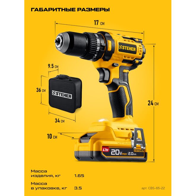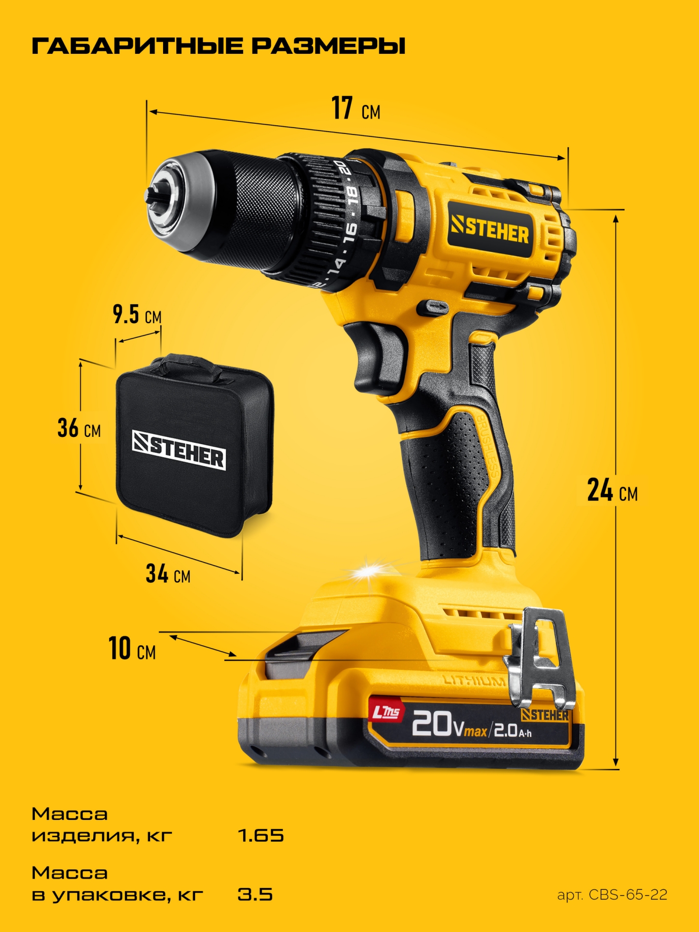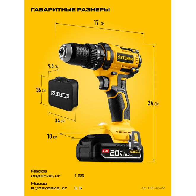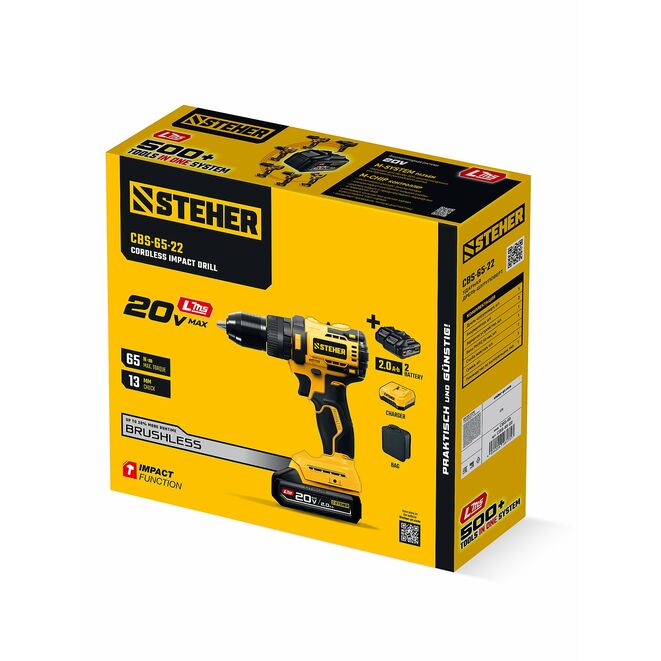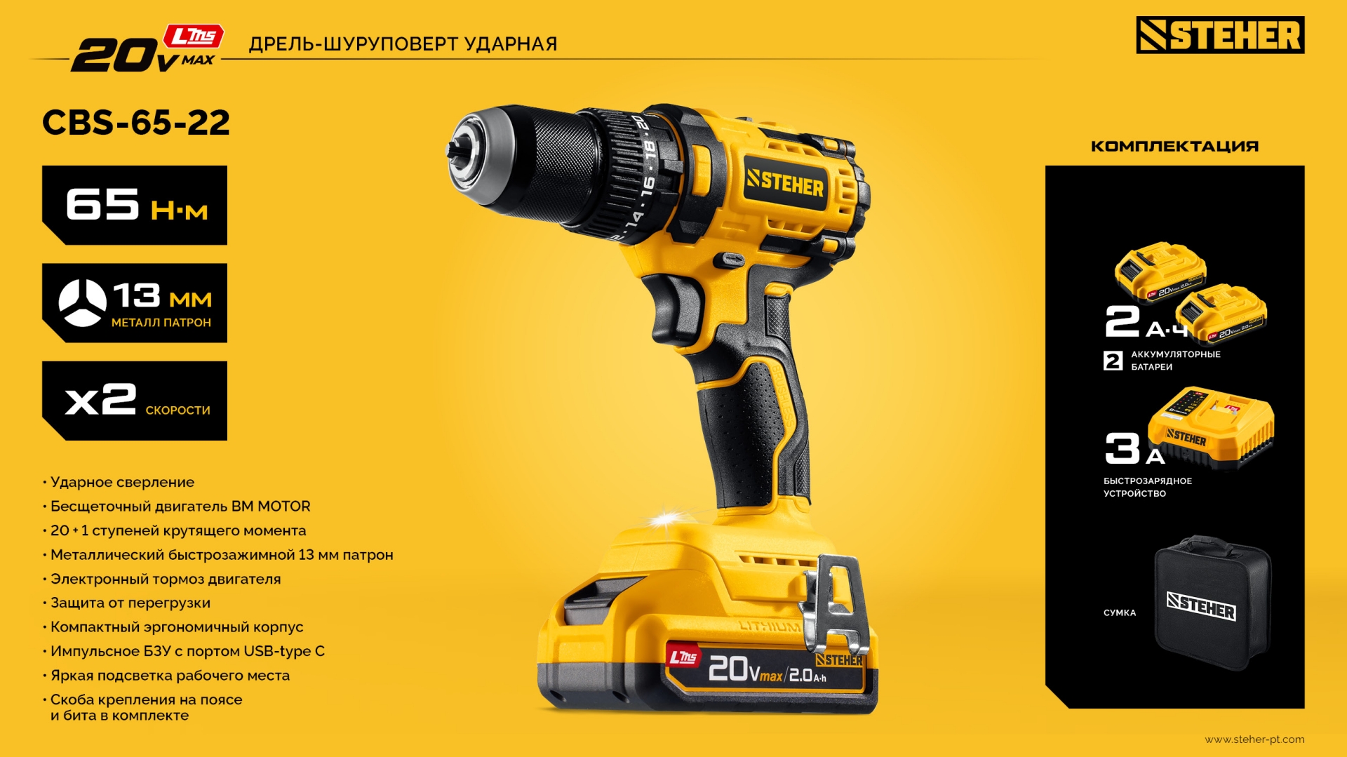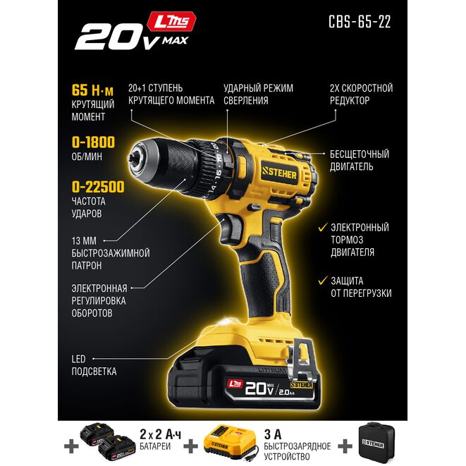 STEHER 20 В, 65 Н·м, 2 АКБ LMS (2 А·ч), бесщеточная ударная дрель-шуруповерт, сумка (CBS-65-22)