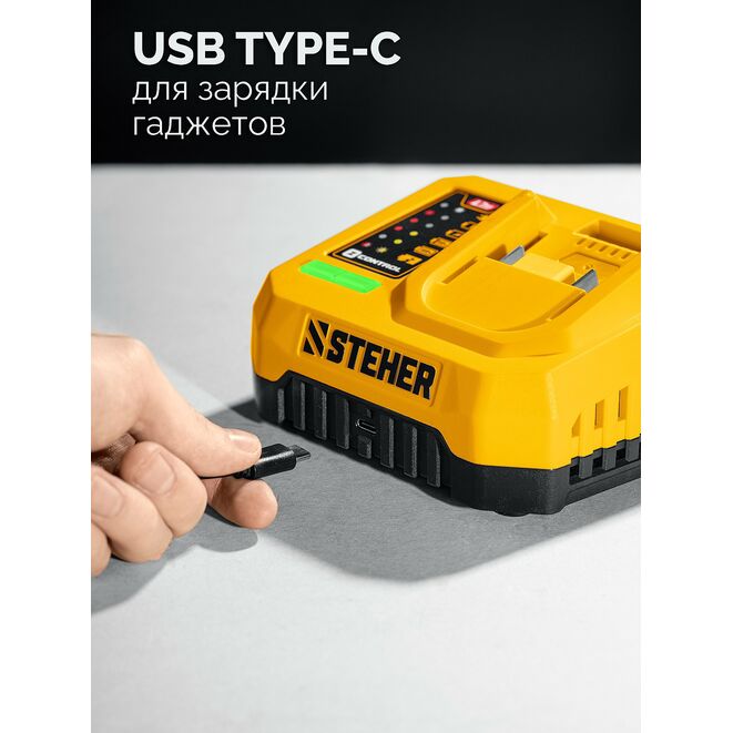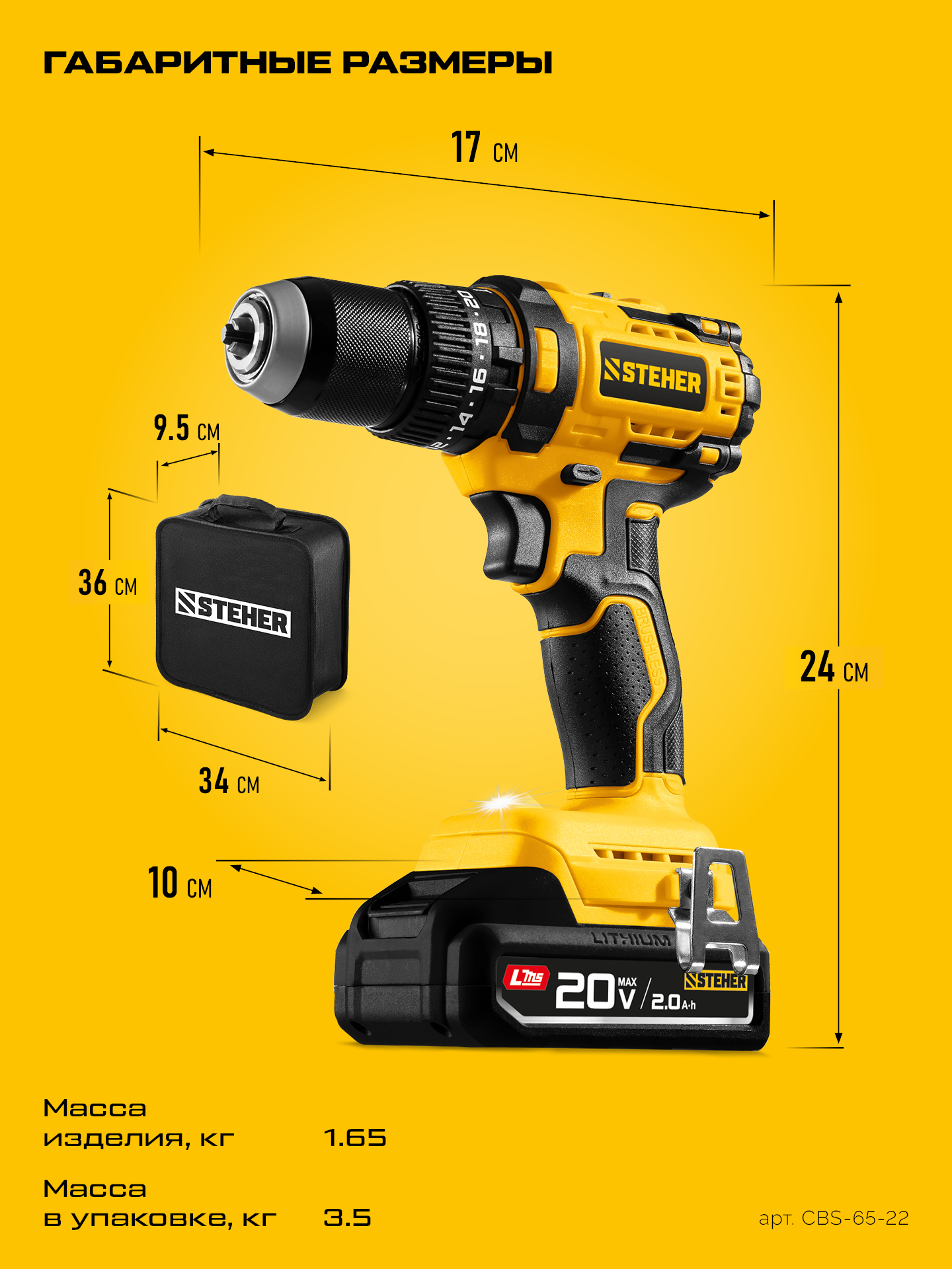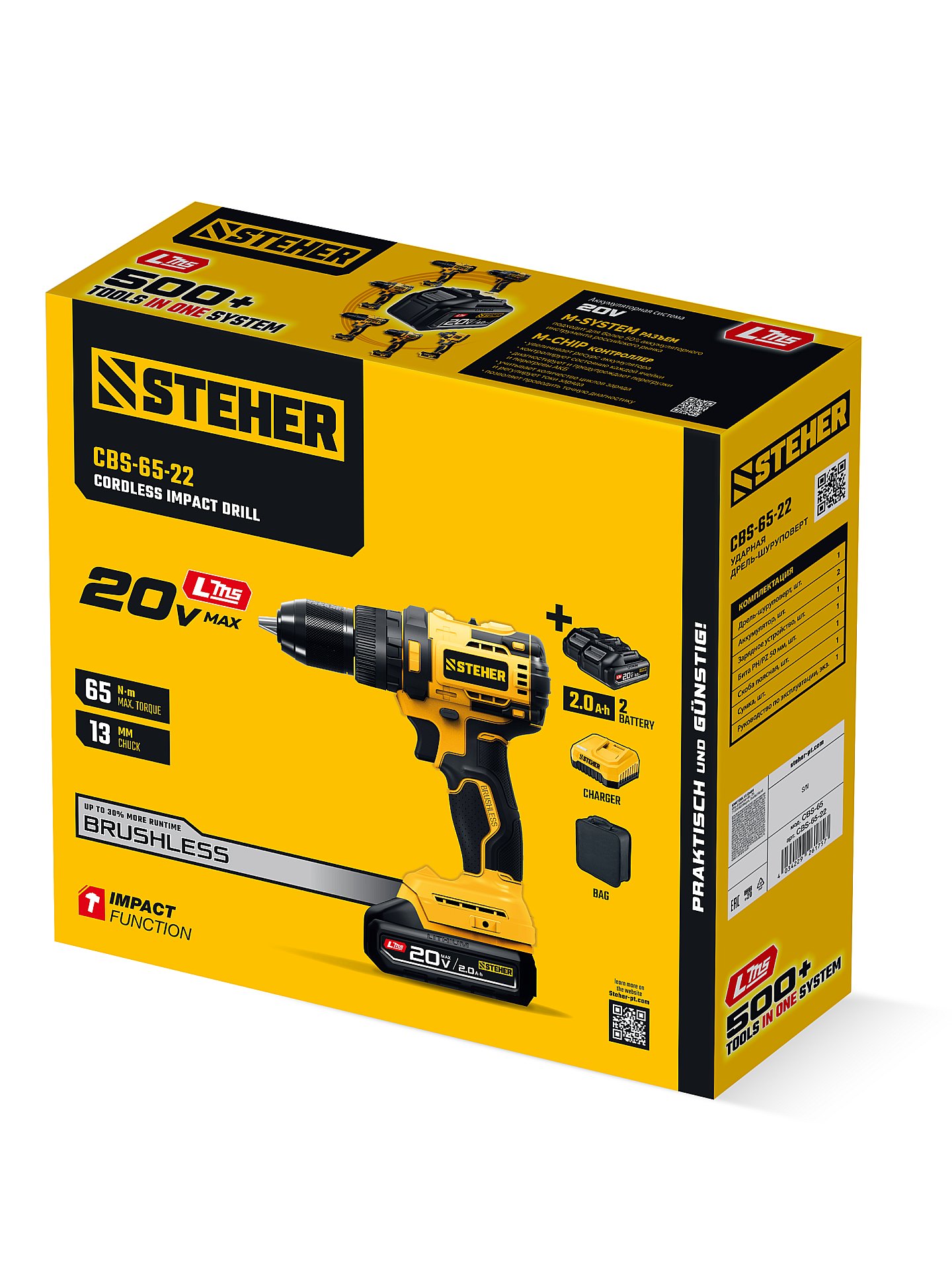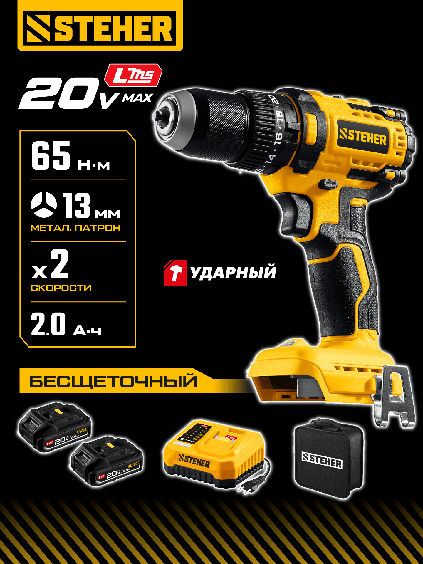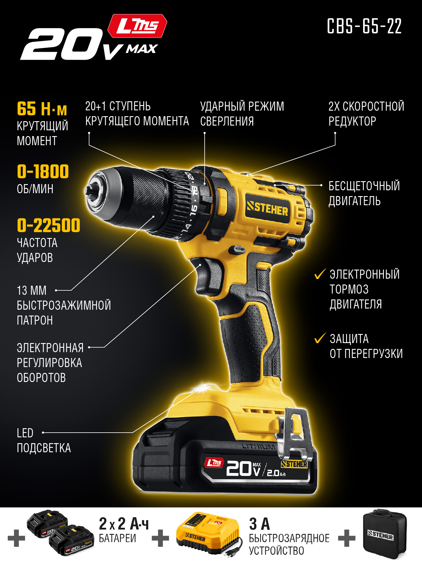 STEHER 20 В, 65 Н·м, 2 АКБ LMS (2 А·ч), бесщеточная ударная дрель-шуруповерт, сумка (CBS-65-22)